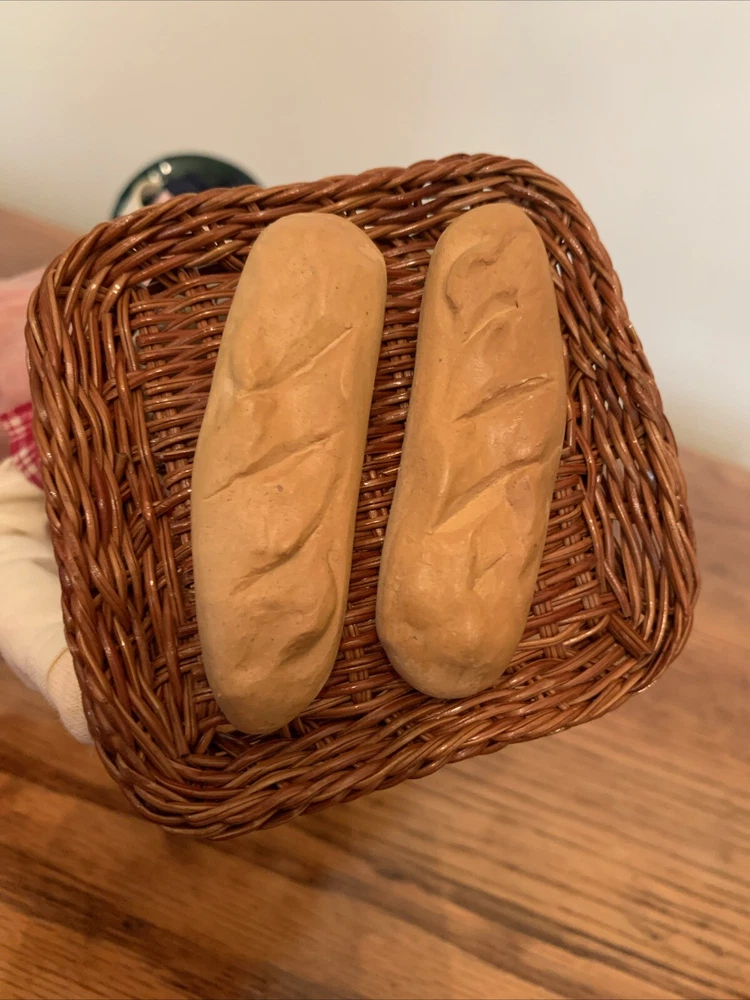 Vintage Byers’ Choice baker is in good used condition. He carries a basket of bread on his head and side. Please note there is some wear on the base. There are also a few imperfections on the top of the base. See photos.