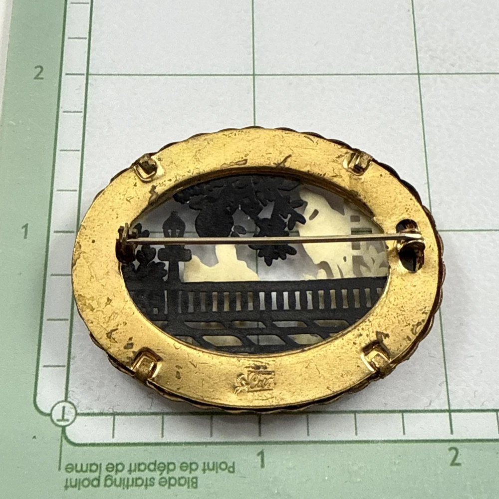 Vintage CORO Pegasus Hallmark Romeo & Juliet Celluloid Oval Gold Tone Brooch. Pre-Owned Estate Jewelry in Very Good Condition. Ready to wear, give as gift or add to a collection. Our Vintage items are mostly from estate sales and vary in age from 100+ years old to more modern pieces. Please use your judgement. Items are photographed on a measuring matte with one-inch squares to give you an idea of size. Any photography props / holders you see are not included.
