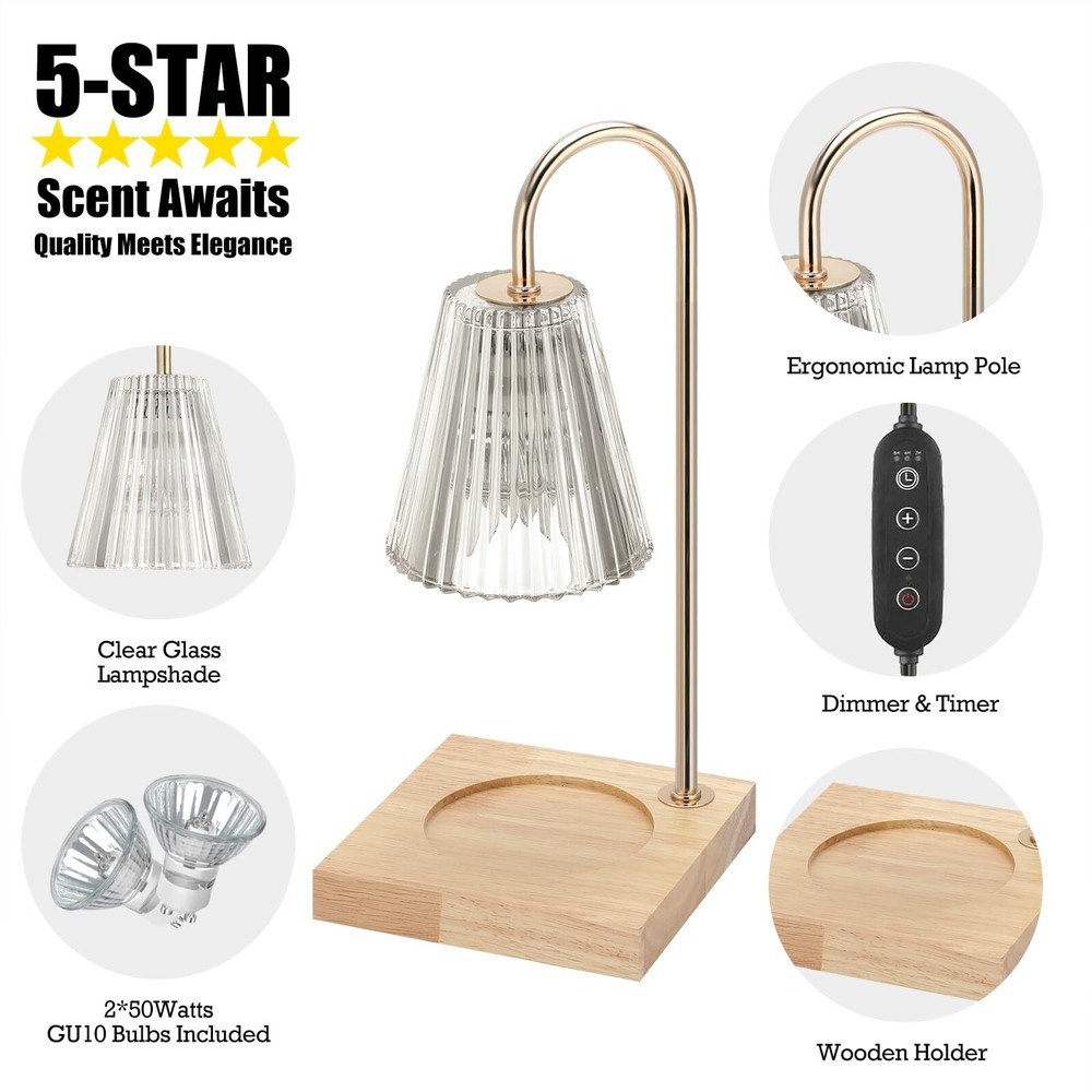 Candle Warmer Lamp with Timer, 2 Bulbs, Vintage Electric Candle Lamp Warmer, Mothers Day Presents for Mom, House Warming Decor, Dimmable Candle Melter for Scented Wax, Clear Product Details Color: Clear Brand: luzdiosa MPN: CDL-005 UPC: Does not apply EAN: Does not apply Color: Clear Material: Wood, Glass, Metal Brand: luzdiosa Product Dimensions: 6"L x 13.8"W x 5.5"H Finish Type: Wood,Metal Product Dimensions : 6 x 6 x 13 inches; 2.2 Pounds Item model number : CDL-005 Date First Available : March 5, 2022 Manufacturer : Amwing Customer Reviews: 4.5 4.5 out of 5 stars 1,240 ratings Color: Clear Material: Wood, Glass, Metal Brand: luzdiosa Product Dimensions: 6"L x 13.8"W x 5.5"H Finish Type: Wood,Metal Item Weight: 2.2 Pounds Number of Pieces: 1 Theme: Wedding Item Diameter: 6 Inches Mounting Type: Tabletop Manufacturer: Amwing Occasion: thanksgiving, christmas, new_years Indoor/Outdoor Usage: Indoor Part Number: CDL-005 Item Weight: 2.2 pounds Item model number: CDL-005 Item Package Quantity: 1 Style: Vintage Finish types: Wood,Metal Number of Lights: 3 Included Components: Dimmer Special Features: Dimmable Batteries Included?: No Batteries Required?: No Type of Bulb: Halogen Wattage: 50 watts Date First Available: March 5, 2022 Safety and Environmental Friendly: The electric candle warmer lamp with timer works on a 50-watt halogen warming bulb (included) melts the candle form the top down. No open fire means no flame, no smoke, no soot and no pollution Easy to Use and Control: The scentsy candle warmer lamp with timer uses heat energy to melt candles and wax from top to bottom. A 50-watt, GU10 halogen lightbulb can melt candle faster and release the fragrance all over the room sooner. With the brightness control on the cord, you can easily change the melting speed. The brighter you set, the faster it melts. The wooden base accommodates different sizes and shapes of candles Simple and Versatile Design: Wood base with metal light body, and glass lampshade a combination of classic and modern design that is very stylish. The candle warmer lamp for scented wax is an exquisite functional decorative lamps, night light for home living rooms, bedrooms, study rooms, offices, yoga studios and more. US Patent: D1017877-S. Keep Your House Safe From Fire: lots of house fires are caused by candle fire in the US every year. Say Good Bye to candle flames, smoke, and soot. Safely enjoy your favorite candles fire-safe with our lamp style candle melter Ideal Present: The wax melter will be the best present choice to show your love to your families, lover, or friends on Valentine's Day, Thanksgiving, Christmas, New Year, Housewarming or other special occasions