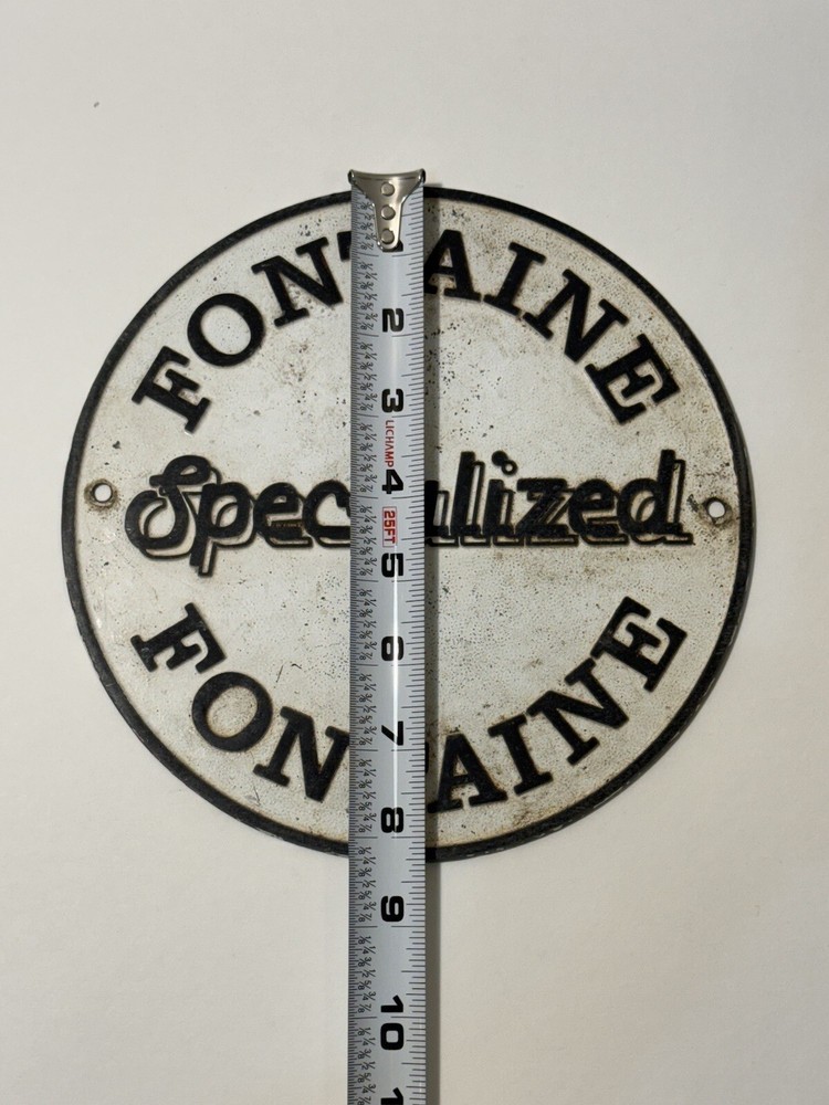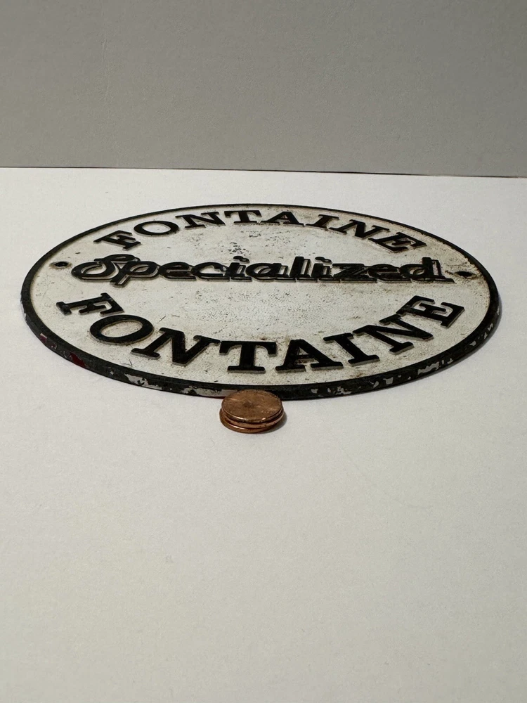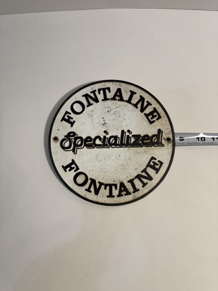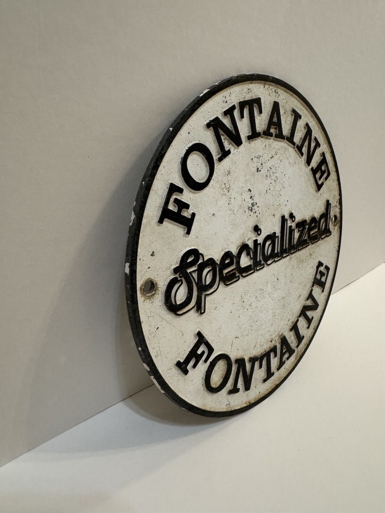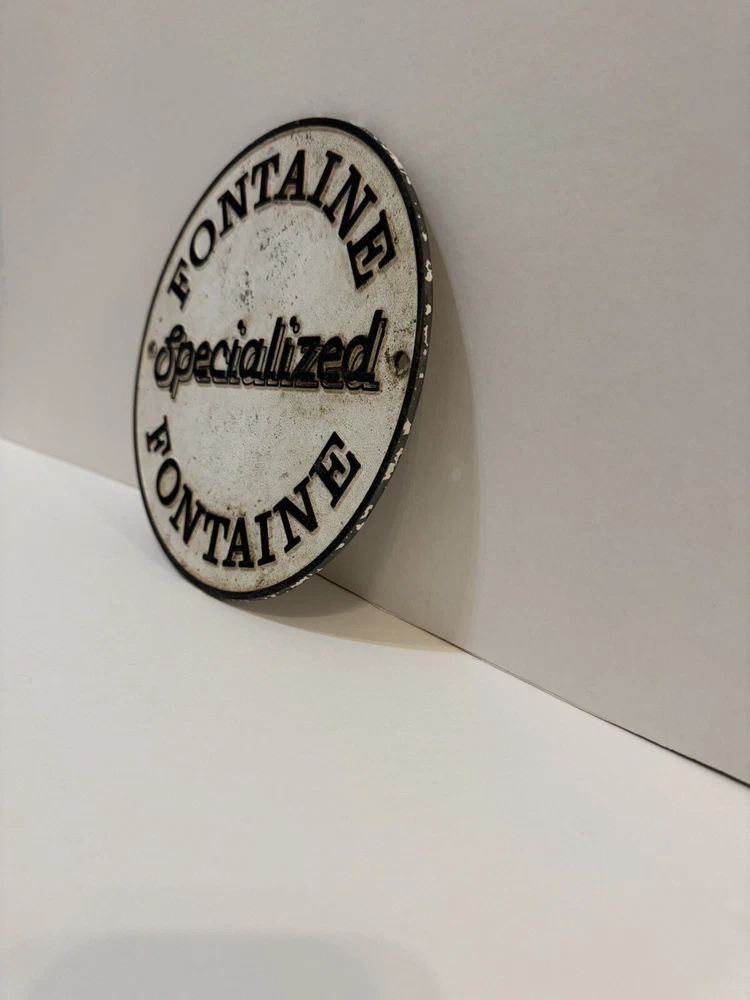This vintage Fontaine specialized sign is a must-have for any collector. Made of durable cast aluminum, this sign is a unique piece of memorabilia that will add character to any collection. Perfect for display in a man cave, garage, or any other space dedicated to vintage advertising, It measures approximately 8 1/4” in diameter and is in good condition with normal wear. See photos for condition.