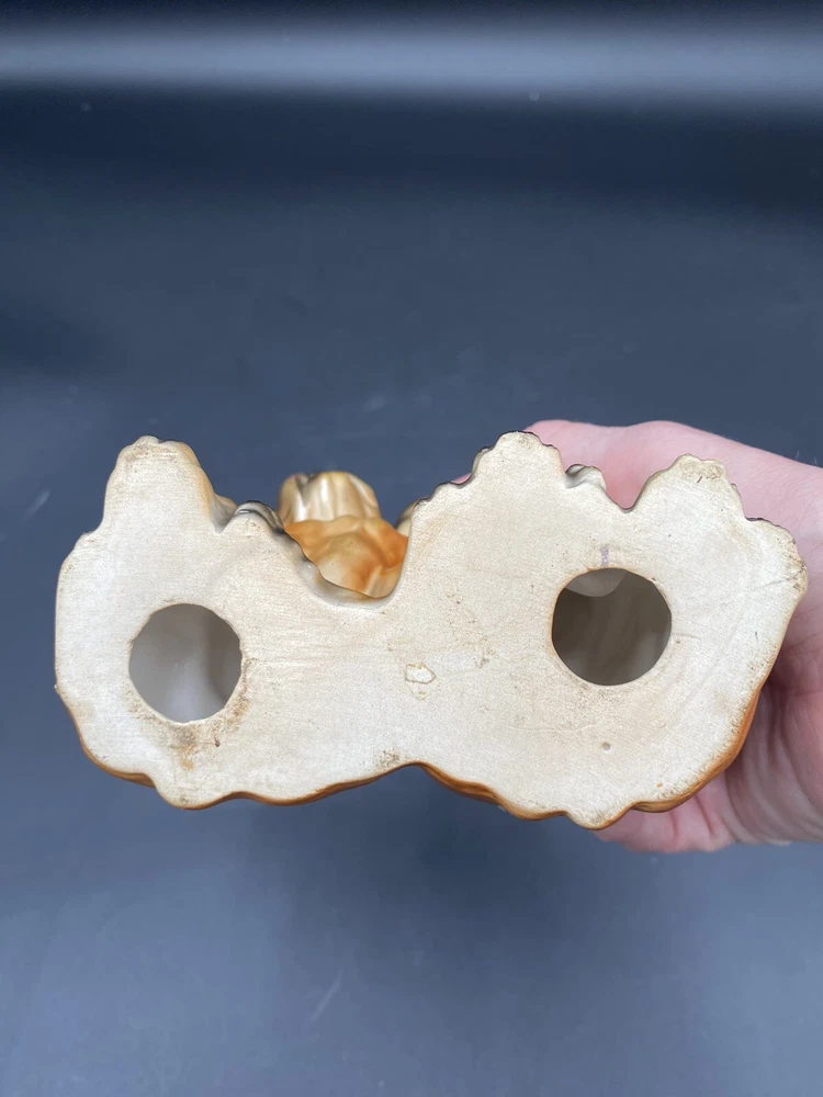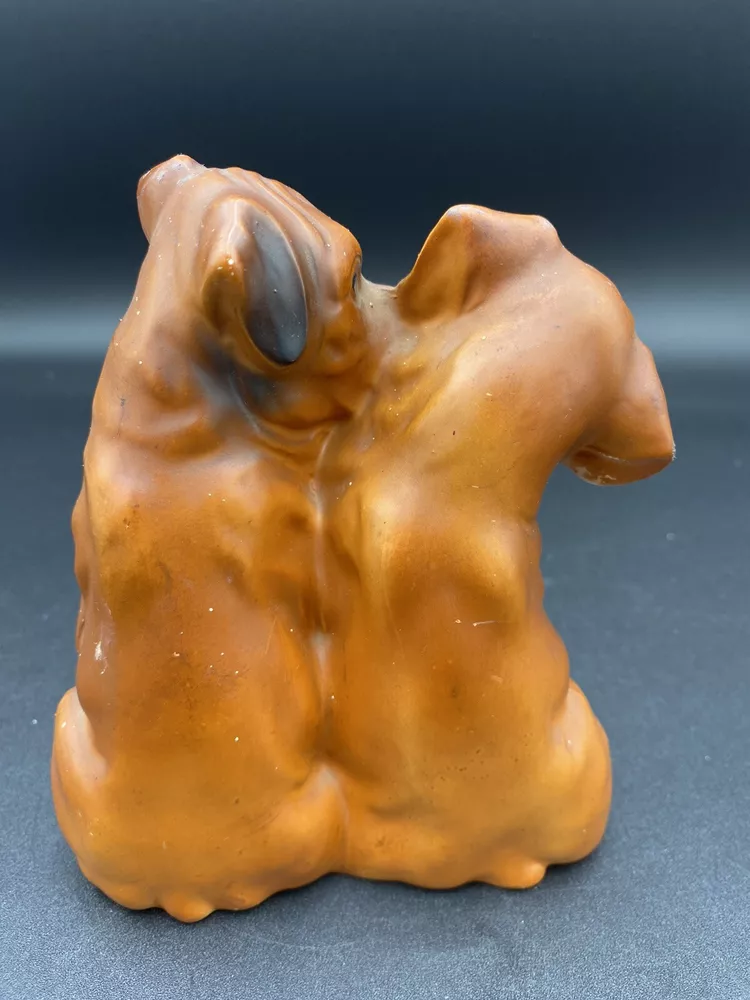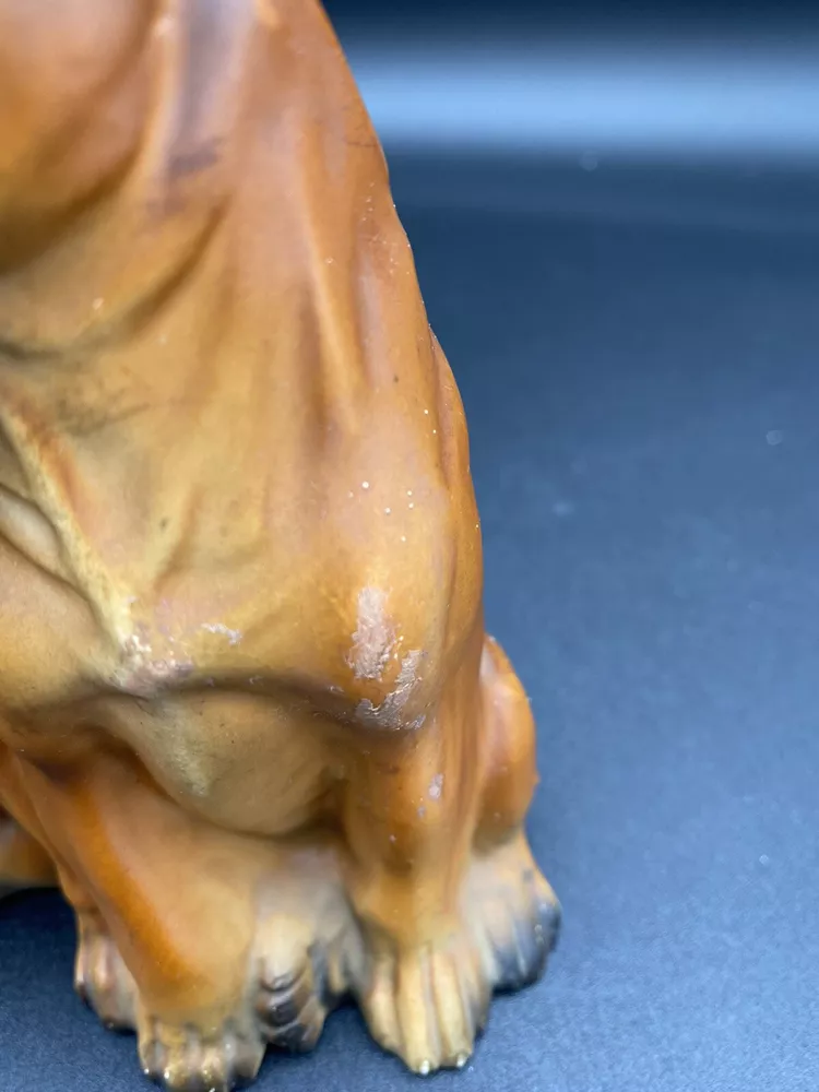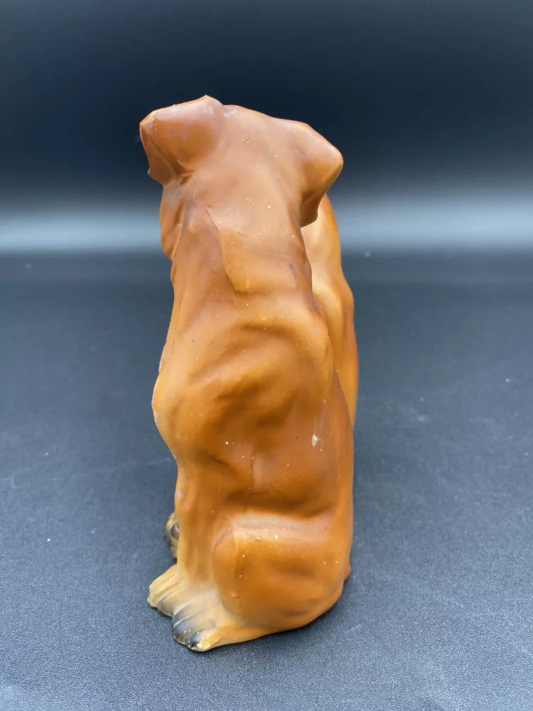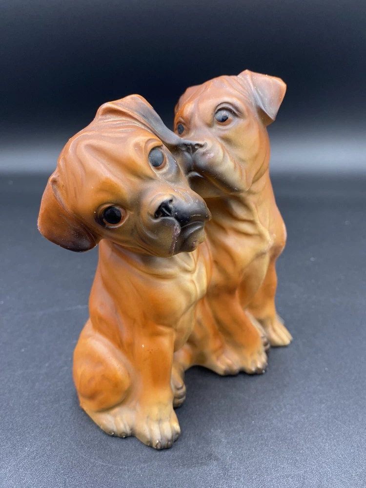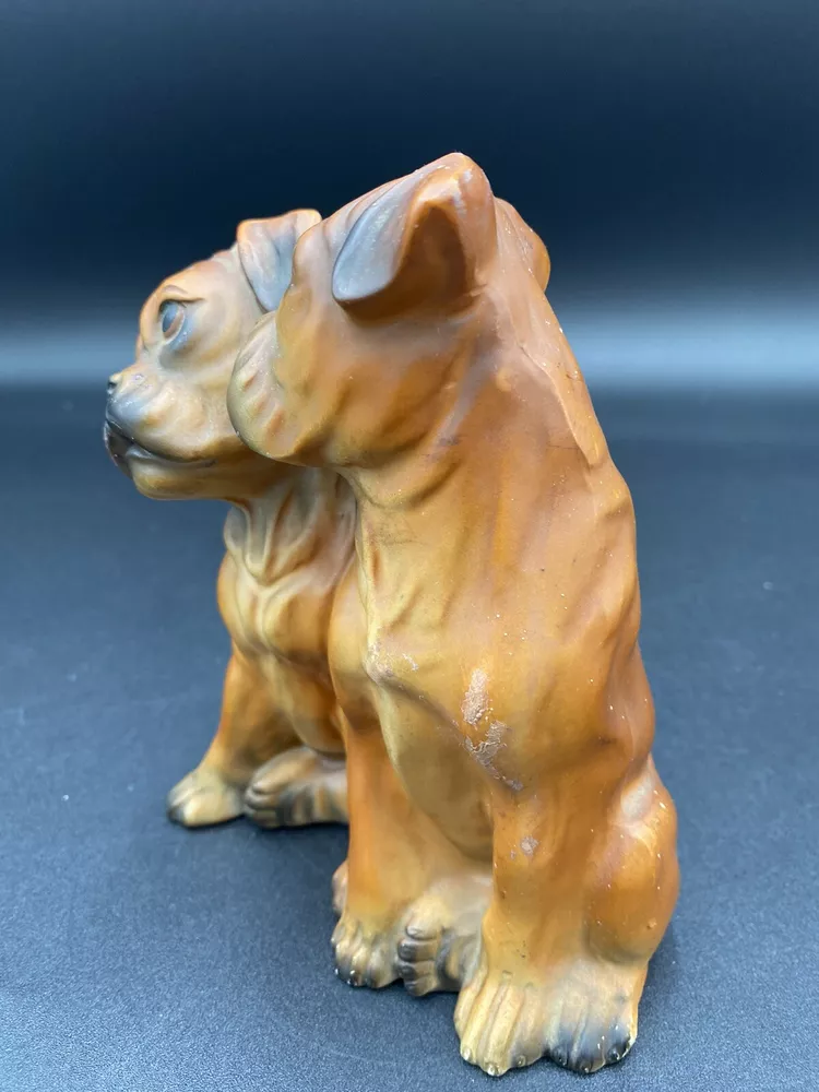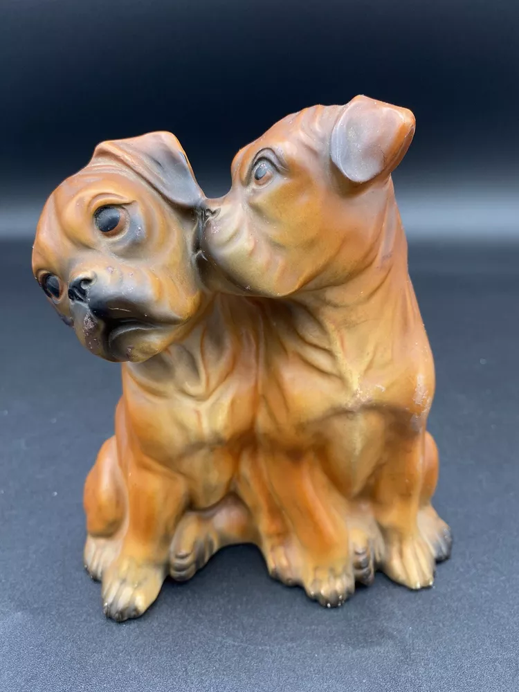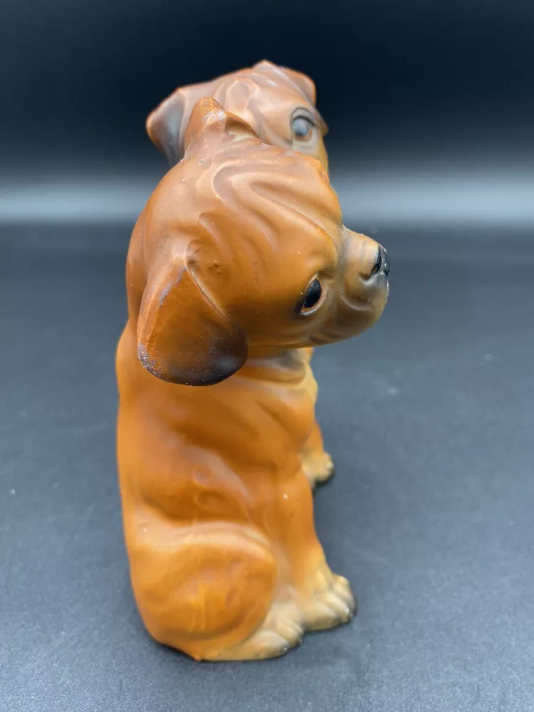 This vintage porcelain figurine features two adorable Boxer puppies, portrayed in great detail with lifelike expressions. The puppies may be littermates, and their loving interaction is conveyed through their body language and facial expressions. The figurine is a great addition to any collection of dog figurines, as it showcases the unique characteristics of the Boxer breed. The ceramic material gives it a delicate and refined appearance. There are a few spots where the color is chipped and a few spots where the color has been repaired (see last picture). Please review all pictures for a complete sense of wear. Dimensions: 5.5 inches tall, 5 inches wide, 2.5 inches deep