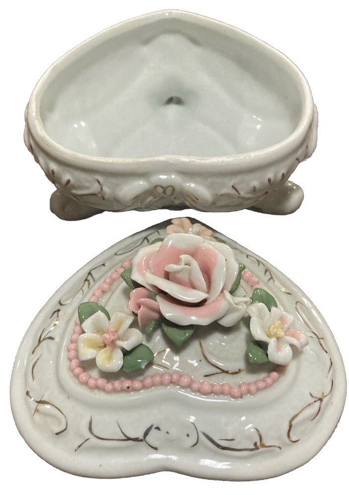 This vintage ceramic oval trinket box is a beautiful addition to any collection. The delicate roses pattern and heart shape make it a perfect gift for any occasion. The box comes with a lid and is perfect for storing small items such as jewelry or keepsakes. Measures 6” wide, 5” long, and 4.5” tall. The material of the box is high-quality ceramic, which adds to its durability and aesthetic appeal. The box is also boxed for safekeeping. The trinket box is a great collectible item, perfect for those who love boxing or decorative collectibles.