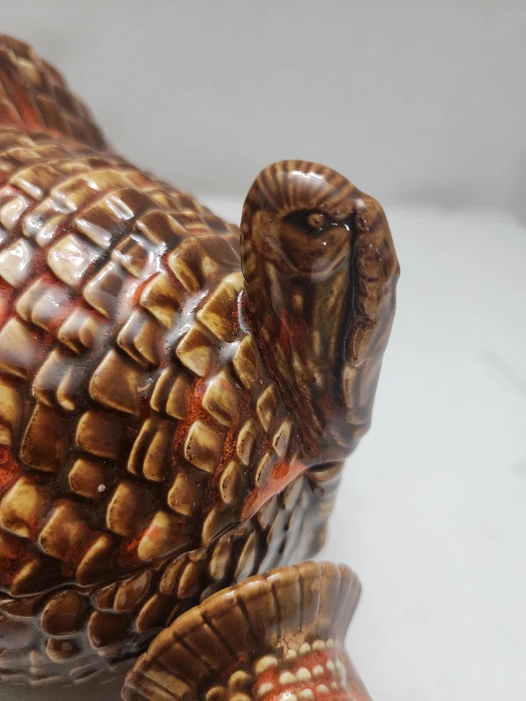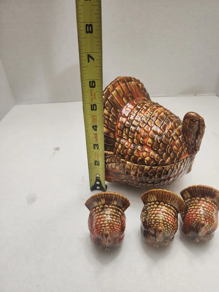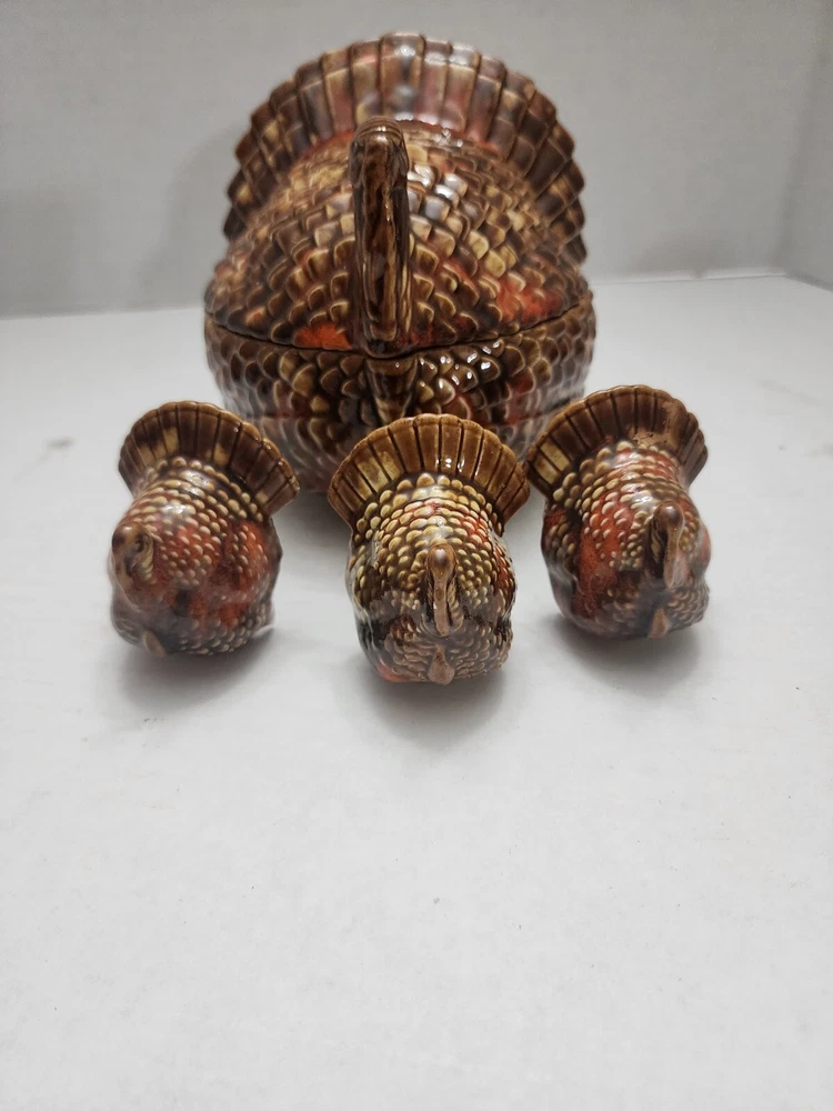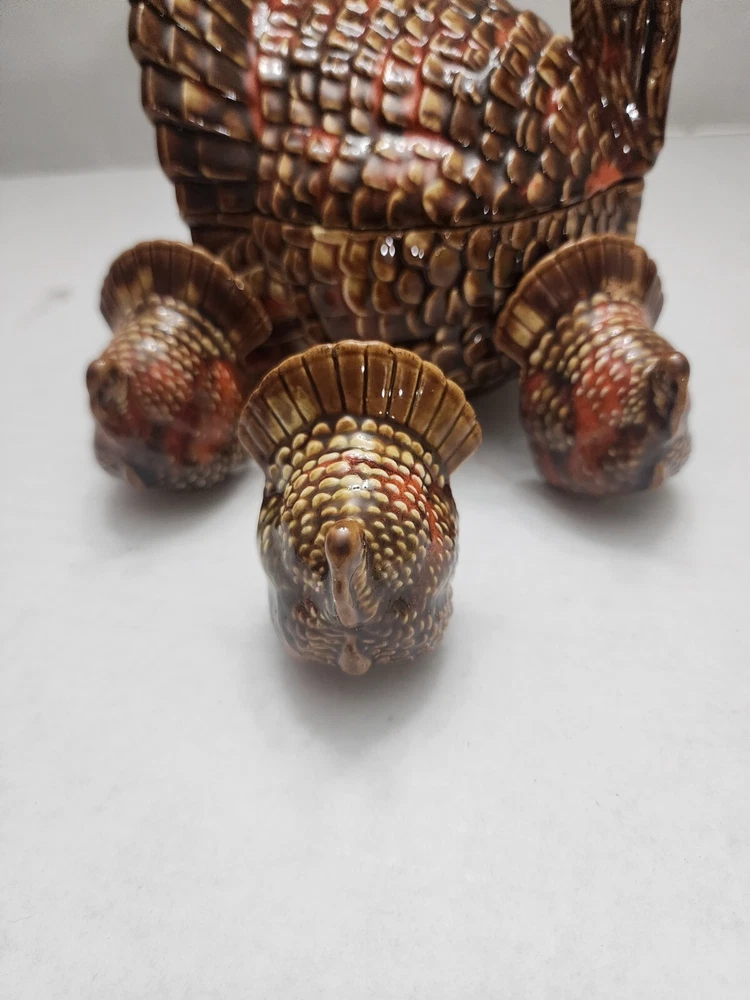 This vintage ceramic turkey lidded dish is the perfect centerpiece container for your Thanksgiving dinner. With its colorful design and handmade construction, it's sure to add a touch of nostalgia to your holiday décor. Made in the 1970s, this dish is a rare find for collectors of holiday memorabilia. Whether you're using it to serve your favorite dishes or displaying it as a decorative piece, this ceramic turkey dish is a must-have for any Thanksgiving enthusiast. Comes with 3 small turkey, 2 have small chips see photo