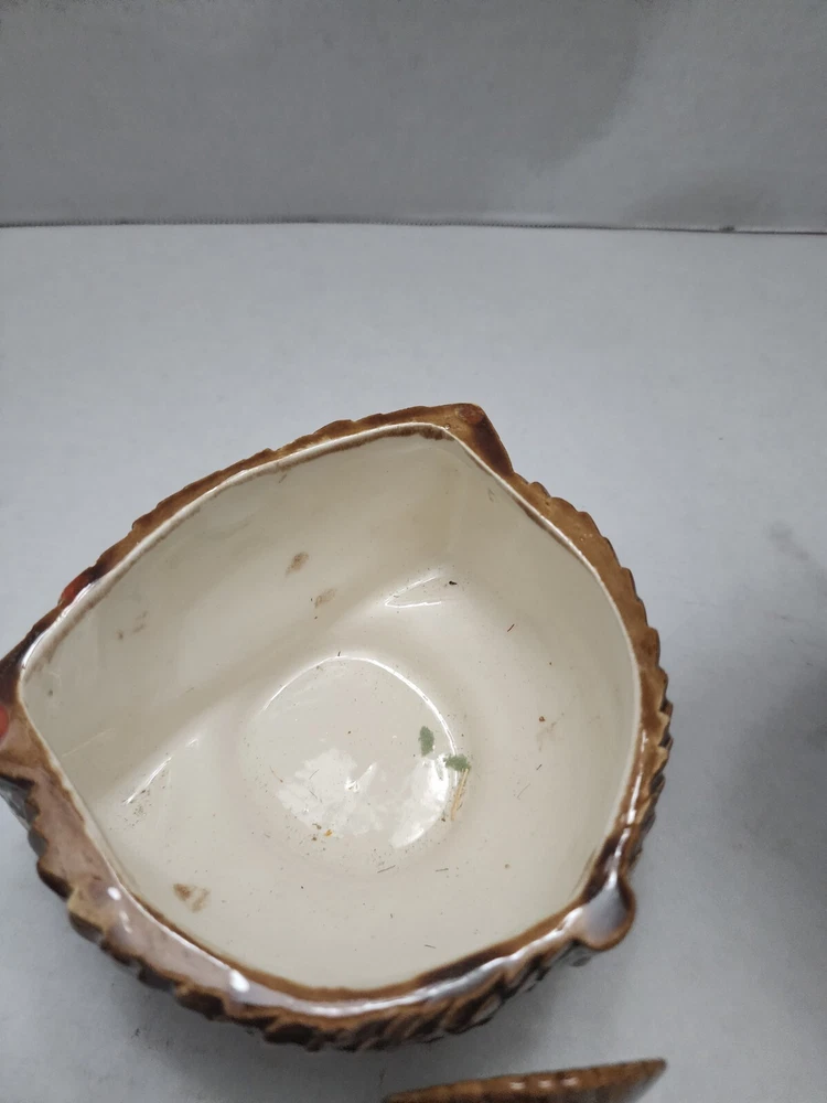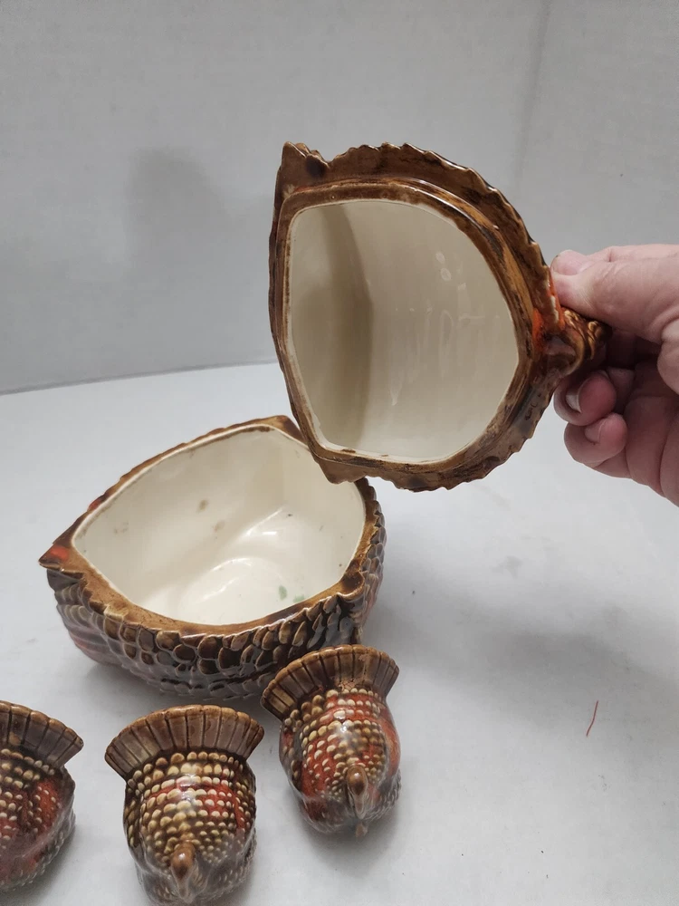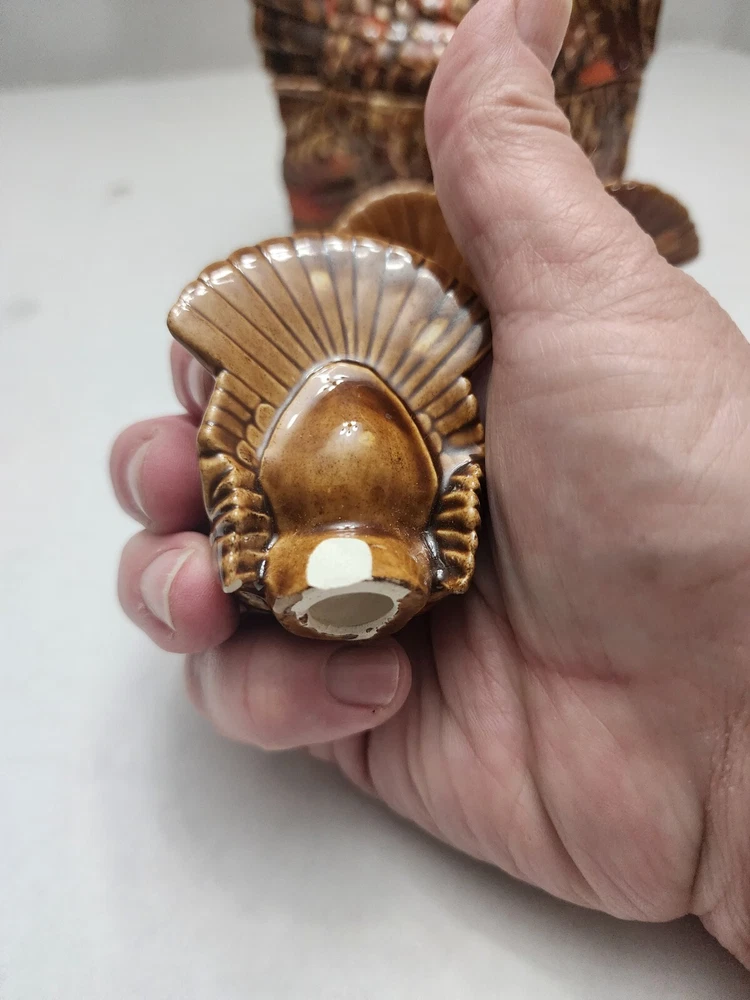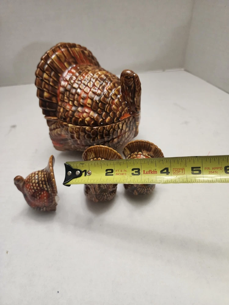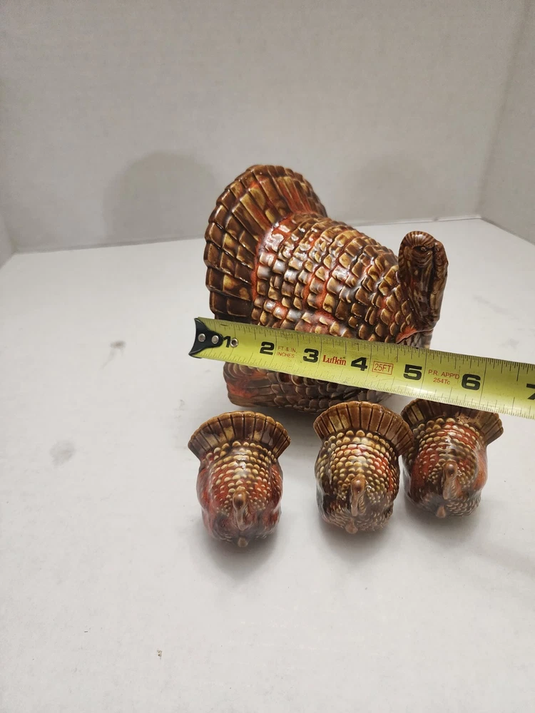 This vintage ceramic turkey lidded dish is the perfect centerpiece container for your Thanksgiving dinner. With its colorful design and handmade construction, it's sure to add a touch of nostalgia to your holiday décor. Made in the 1970s, this dish is a rare find for collectors of holiday memorabilia. Whether you're using it to serve your favorite dishes or displaying it as a decorative piece, this ceramic turkey dish is a must-have for any Thanksgiving enthusiast. Comes with 3 small turkey, 2 have small chips see photo