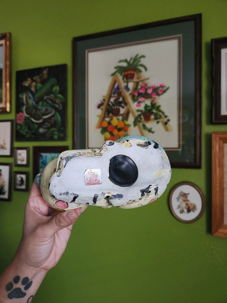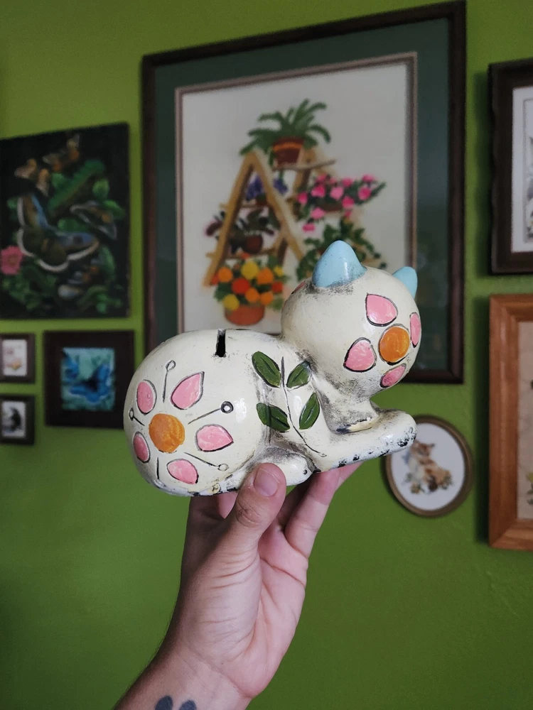 This vintage chalkware plaster kitty cat coin bank is a must-have for any collector of unique and quirky items. Made in Japan in the 1960s, this original piece features a cute and playful design that is sure to bring a smile to your face. The bank is perfect for storing your loose change or as a decorative piece on your shelf.