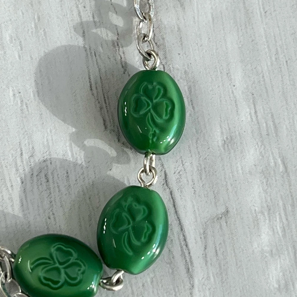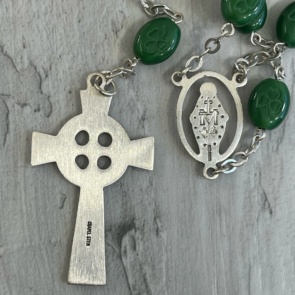 Vintage Chapel Sterling Green Shamrock Glass Bead Celtic Cross Mary Rosary Beads Length- 26" Cross length- 1.75" Additional measurements available upon request All measurements are approximate All measurements are taken with item laying flat Double bust, waist, & hip for measurement all the way around Colors may differ based on others computer/phone/etc settings All pre owned items have been washed and steamed All pre owned items have been looked over for flaws and will be noted in listing