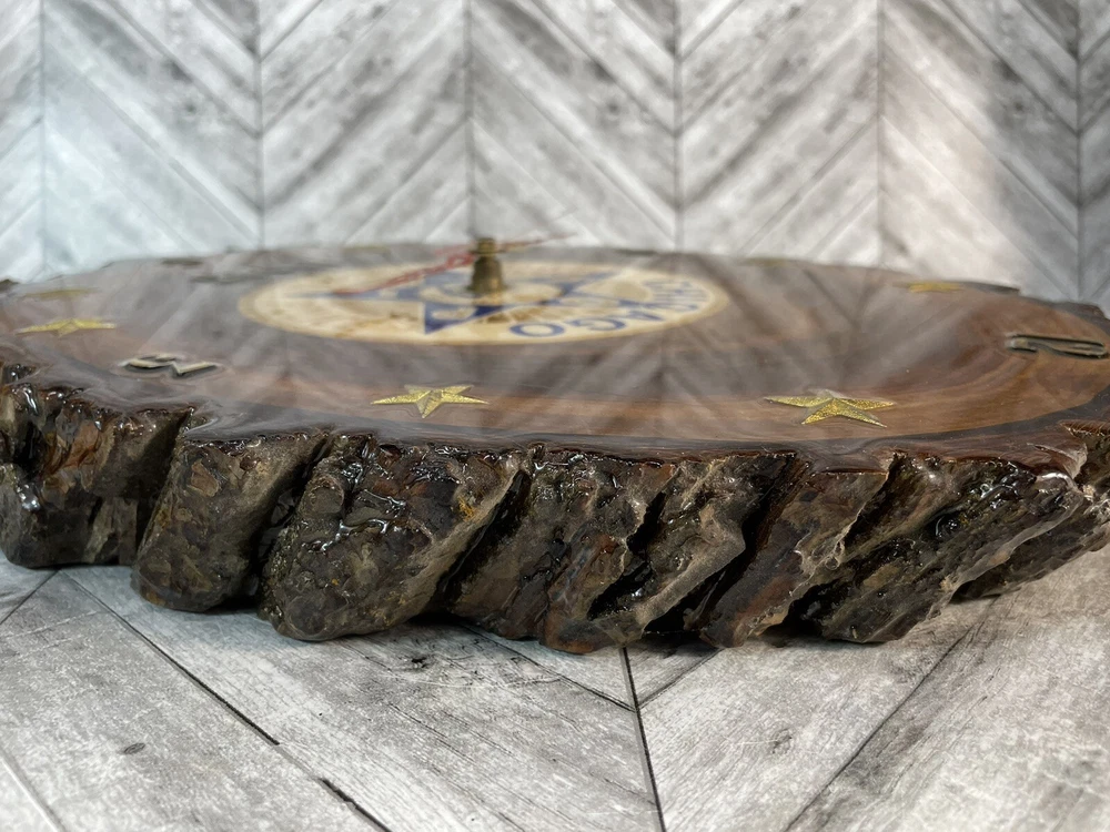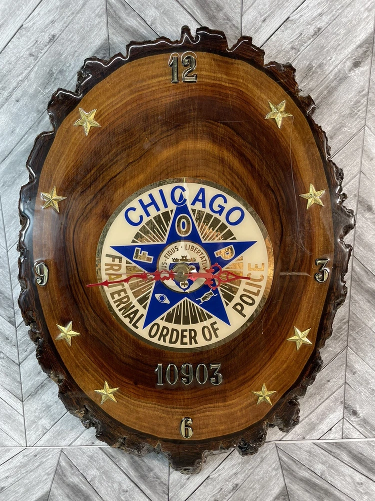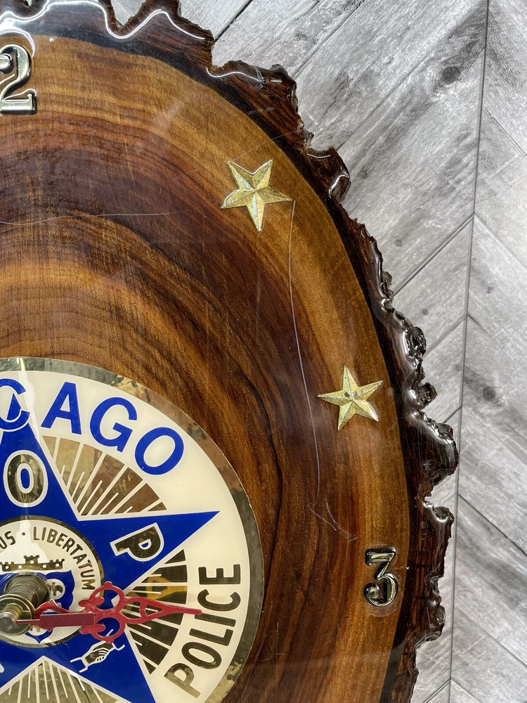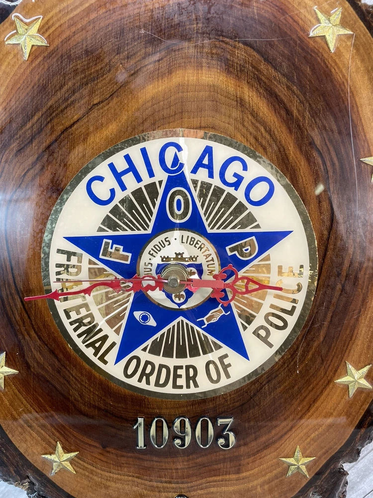 Vintage Chicago Fraternal Order of Police 10903 Burl clock in very good condition. Clock does keep perfect time. Will need 1 AA battery that is not included. There are a couple of scratches on the front that was shown in a photo. Also the small hand has a bit of a bend to it but still works perfect. Clock measures 16” long, 11 1/2” wide and is 1 1/2” thick. If you have any questions please feel free to ask. Thanks for looking!