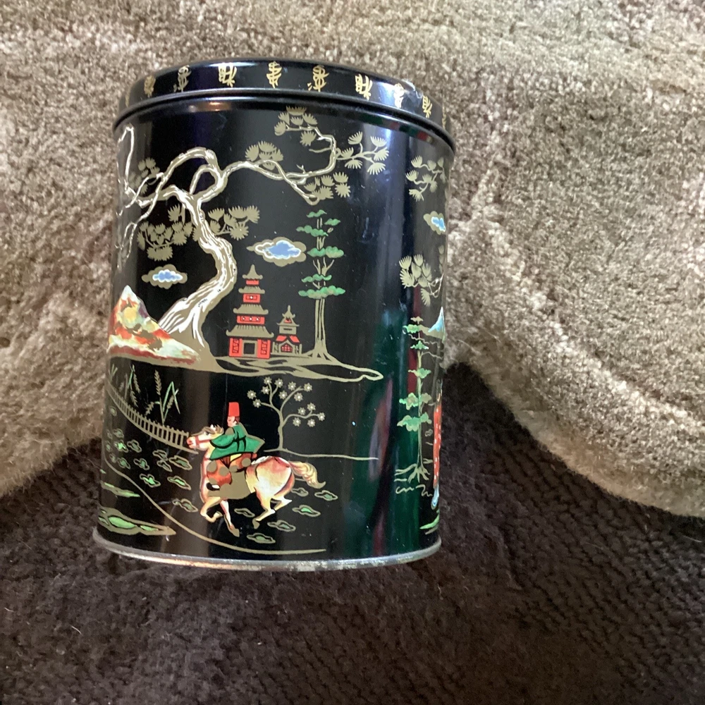 Vintage Chinoiserie Tea Caddy or Biscuit Tin storage Box lid Baret ware England.