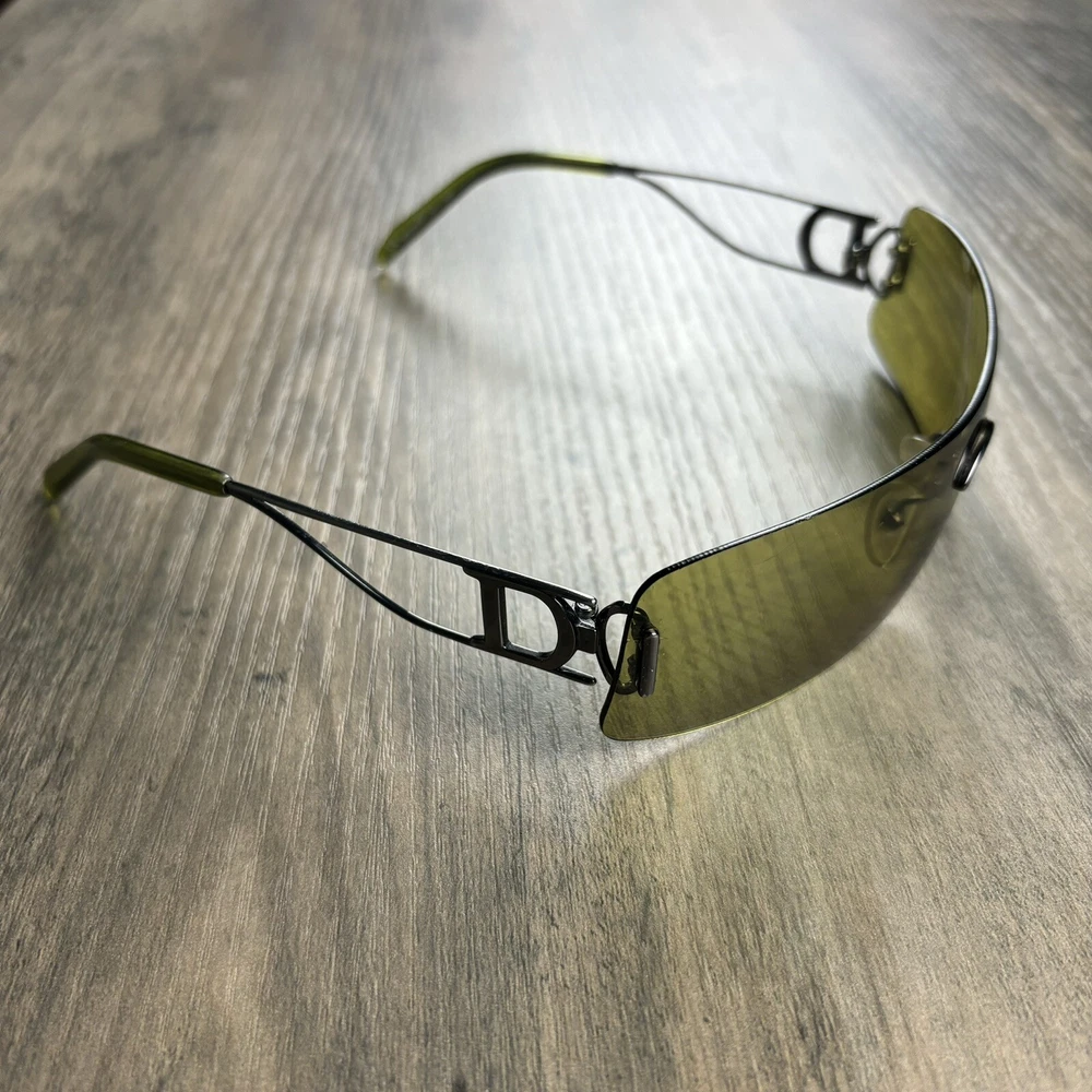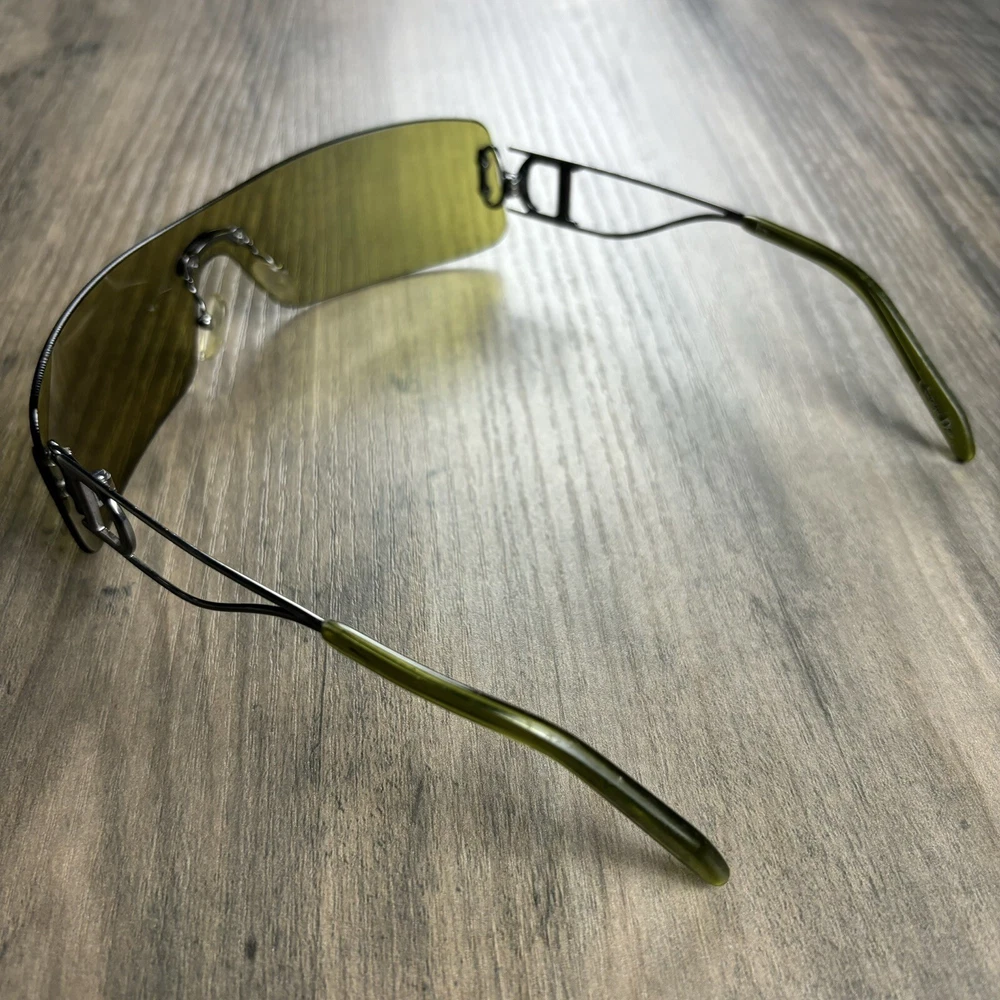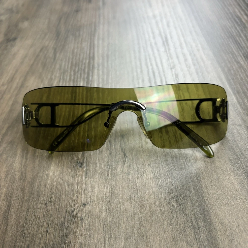 Vintage Christian Dior Miss Diorella Olive Green Shield Rimless Sunglasses Y2K. Condition is Pre-owned. Shipped with USPS Ground Advantage.