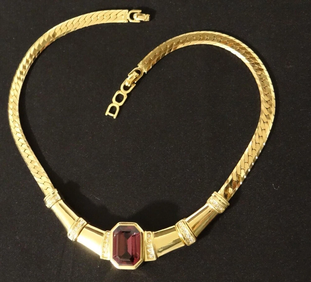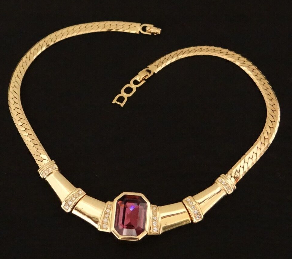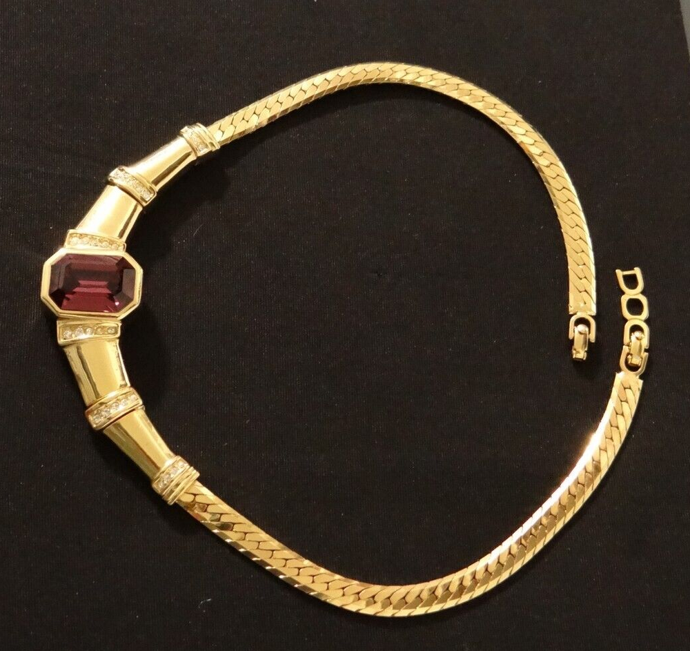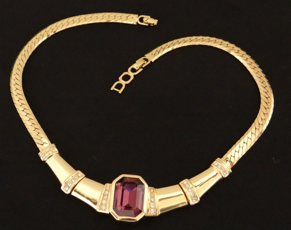 Stunning!! Vintage High End Signed Christian Dior "Chr.Dior" Vintage High End Christian Dior Runway Golden and Centered Cabochon Purple Amethyst Crystal Choker Necklace with extra Link Clasp. All In Excellent condition. Approx. measure 15" Long Thank you for looking and considering this item. Using the description, your knowledge and experience with this type of item, any Q&A messaging, along with all of the photos, decide if this item is worthy to purchase for your use or to add to the collection. Please, be aware that the vast majority of my pieces are vintage or antique and consequently NOT IN NEW or MINT CONDITION. Please, Payment is expected within three days from the end of this auction I ask that you message me to let me know that you are still shopping, usually I will open an unpaid item case 3 days after the auctions has ended Free Returns only Before 14 days.