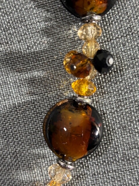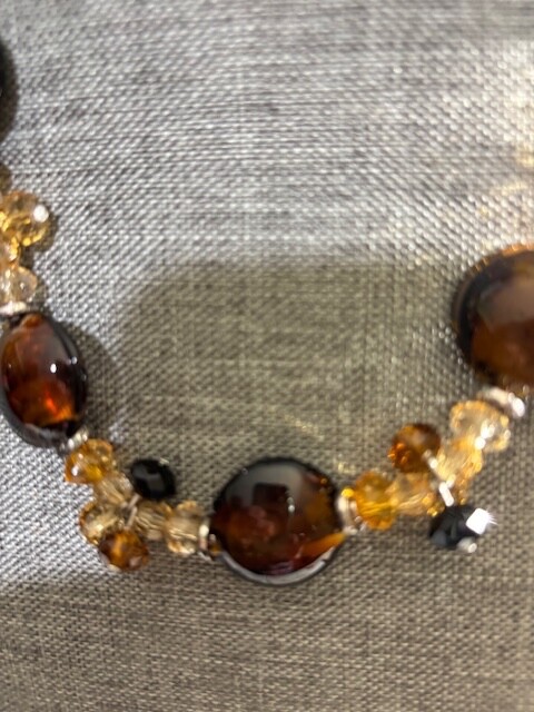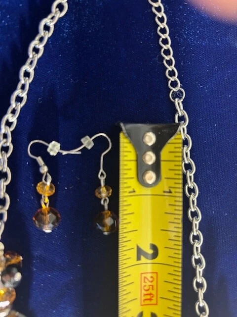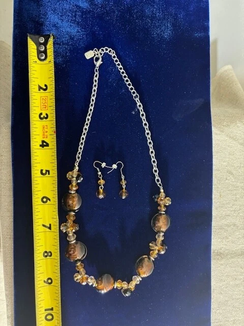 Crafted with a vintage touch, this beaded necklace features faceted glass stones in a vibrant citrine hue in various shades. Complemented by a matching pair of pierced earrings, this set adds a touch of retro elegance to any ensemble. The lobster clasp closure ensures a secure fit for daily wear or special occasions. The citrine colored beads are highlighted by the subtle shine of the metal spacer bead and chain. Accent beads are thread with metal pins as well. Whether you're dressing up for an event or accenting your daily look, this necklace and earring set is a timeless addition to your collection. Does have a branded tag see photos.