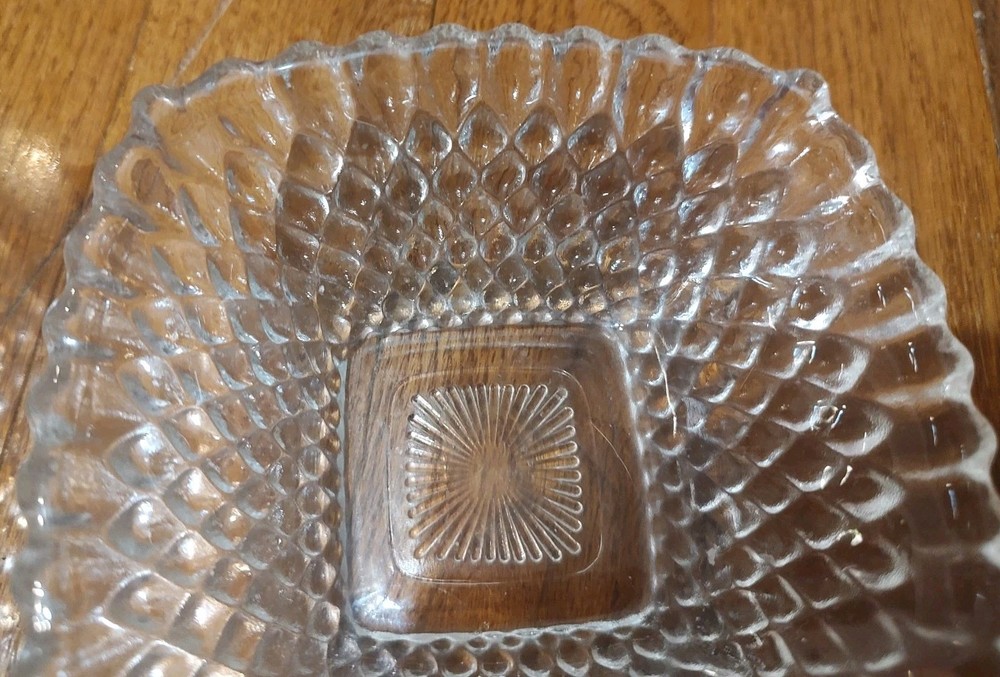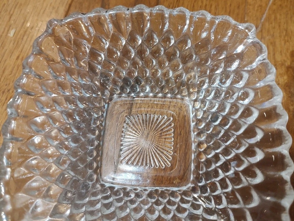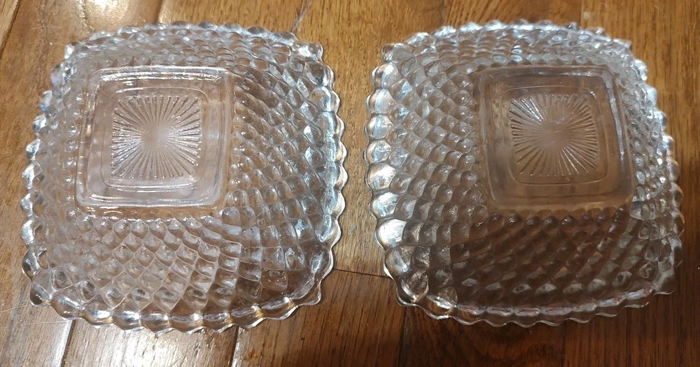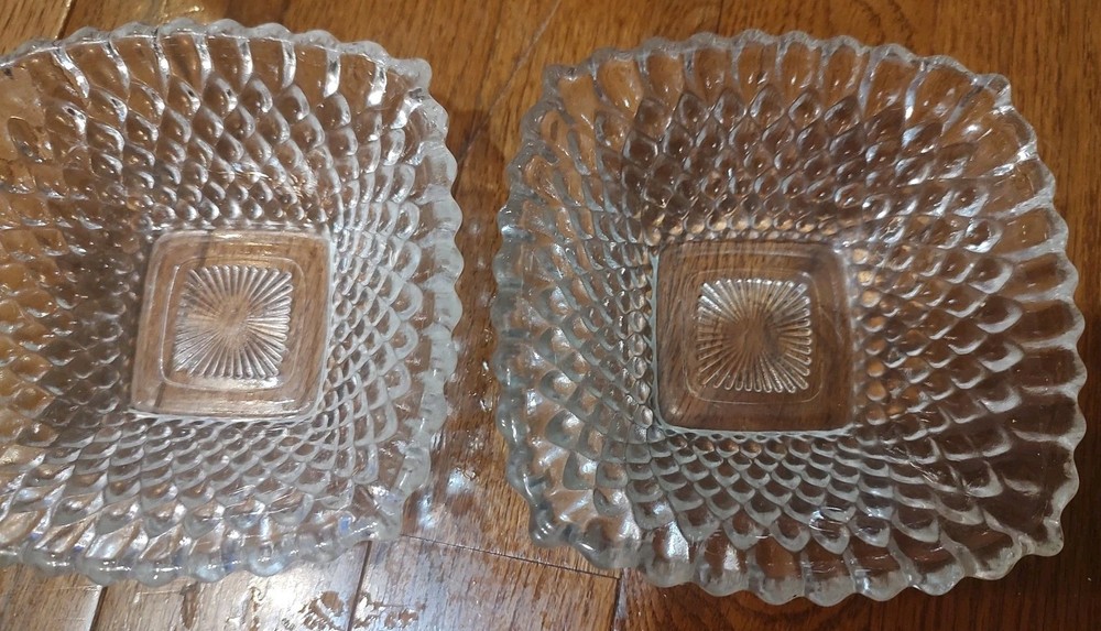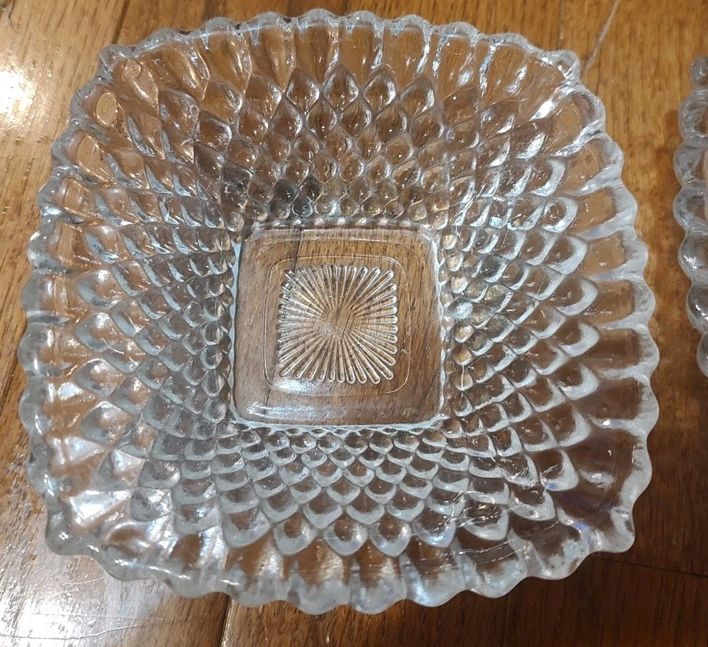 2 Vintage Small Clear Hobnail Diamond Square Trinket Or Serving Bowls 4.5", good condition.