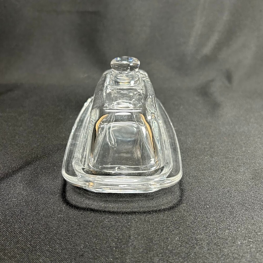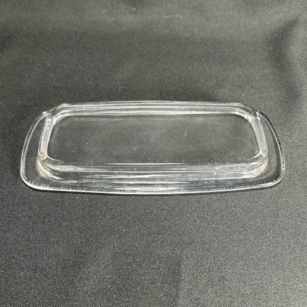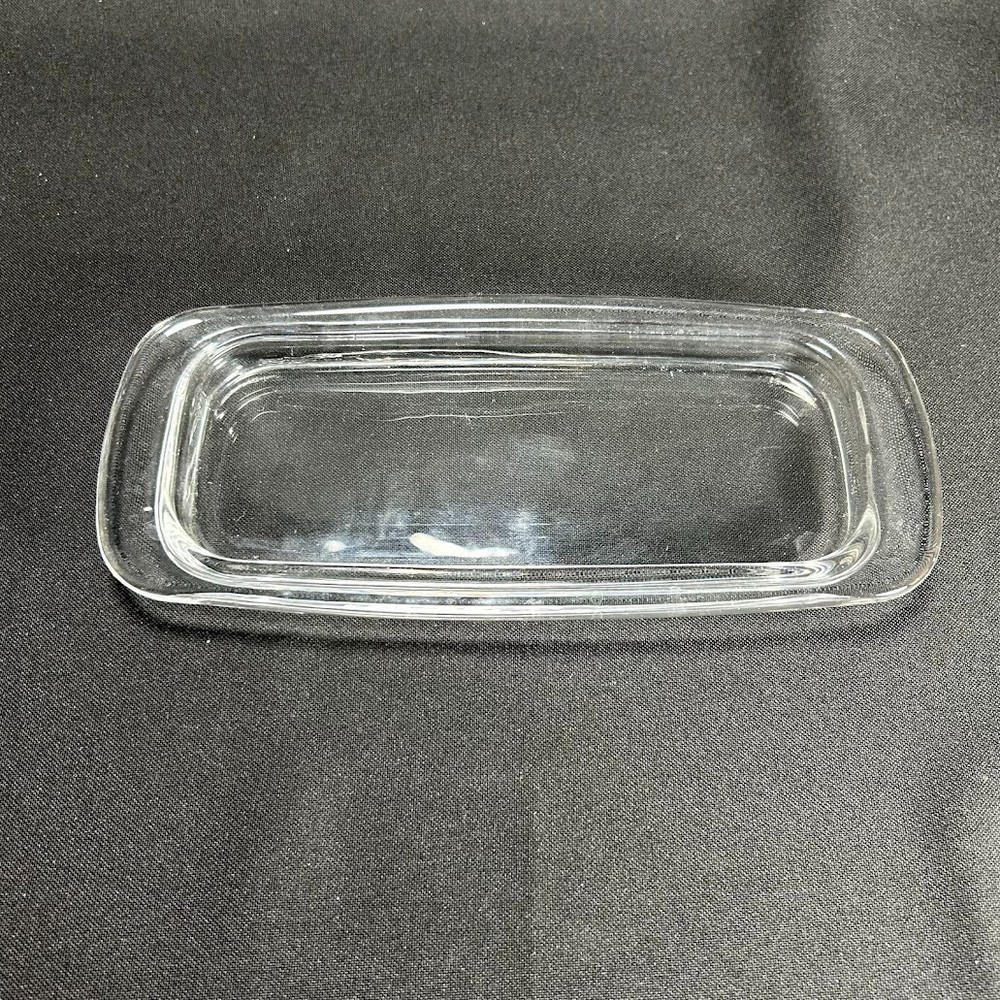This vintage glass butter dish is designed to hold 1/4 pound of butter. It is made of clear pressed glass, measuring 8 inches in length and 3 inches in height. The dish features a plain pattern and has one compartment. The unmarked brand item comes unboxed and is a rectangular shape, perfect for storing and serving butter in a classic and elegant style.