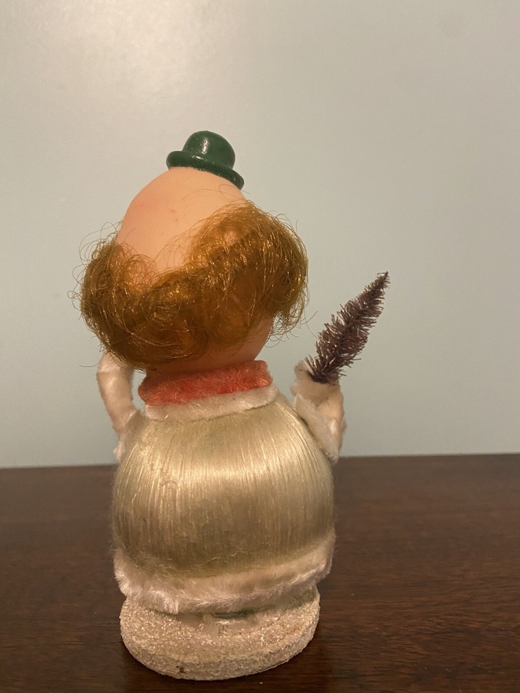 Very unusual clown Christmas decoration as shown. His base is a Christmas ball/ornament and his pipe cleaner arm hols a miniature brush tree. His bas is like a paper mache . Never seen one like it. Very lightweight with rubber head and rooted red hair. Stands 6 in tall