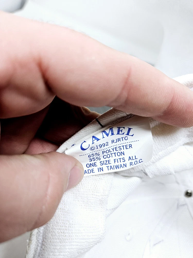 Country/Region of Manufacture: Taiwan Color: White Pattern: Striped Material: Cotton, Polyester Brand: Camel Fabric Type: Canvas Style: Snapback Department: Men Theme: 90s Character: Camel Features: Adjustable, Breathable Size: One Size Vintage: Yes Occasion: Casual, Workwear