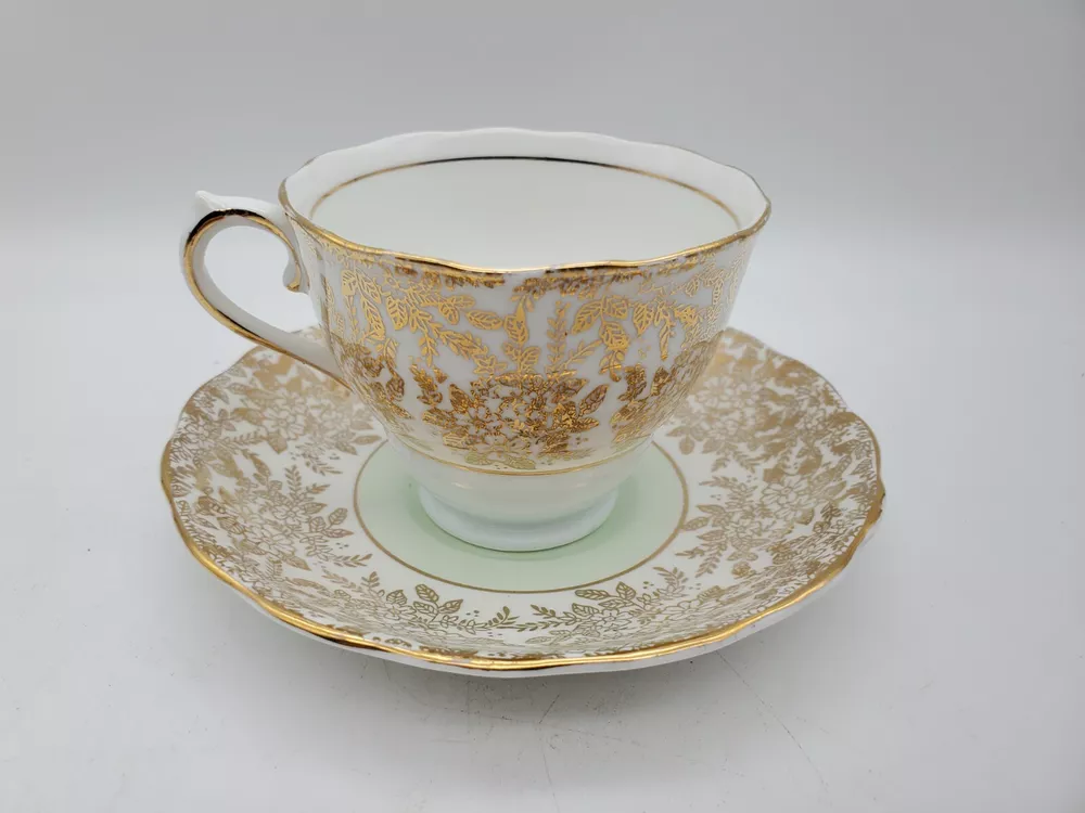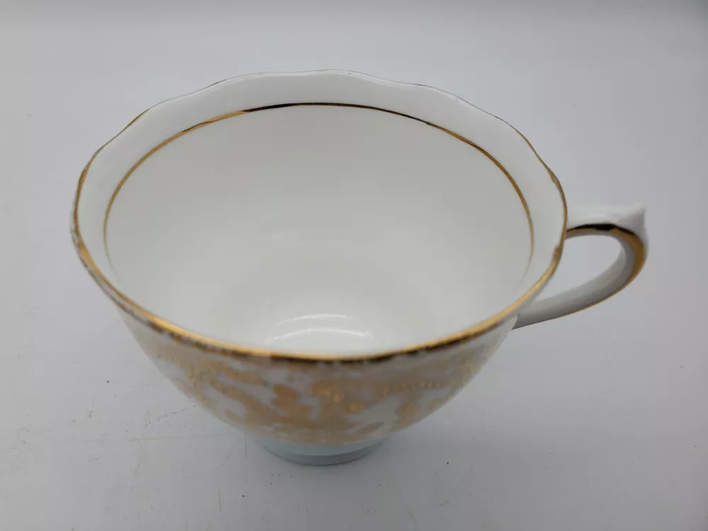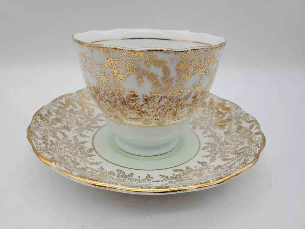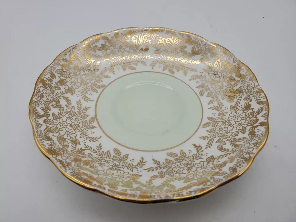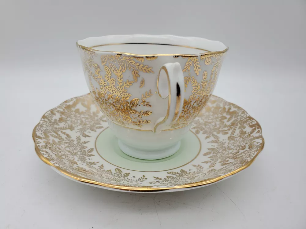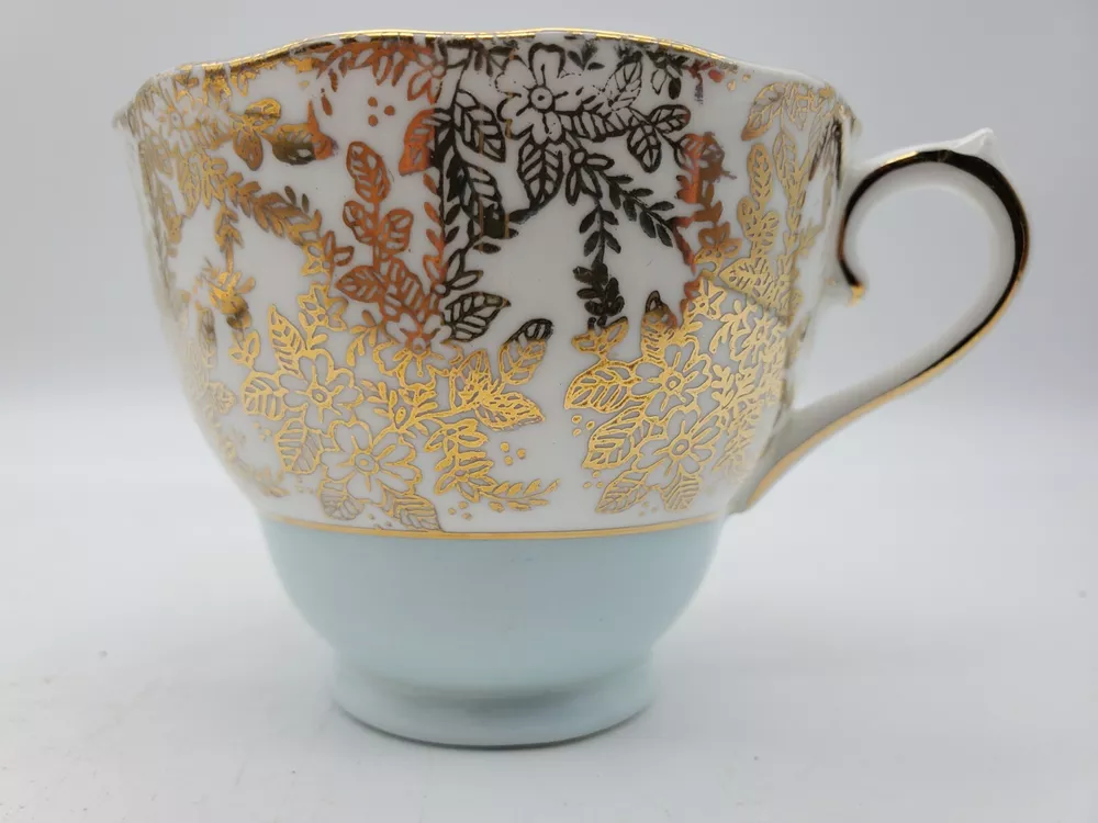 This vintage tea cup and saucer set from Colclough China features a beautiful golden floral pattern that is sure to impress. The set includes a round-shaped tea cup and saucer, both made of high-quality bone china and hand-painted with exquisite details.