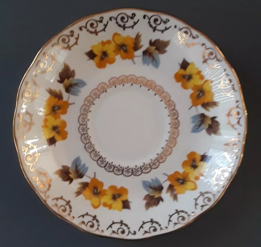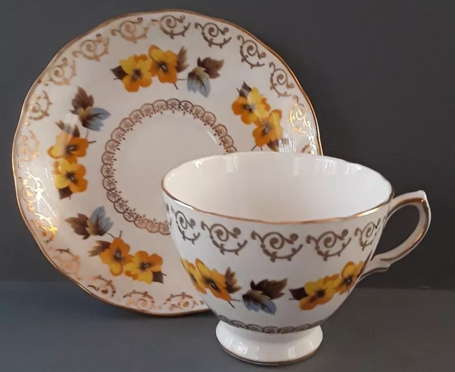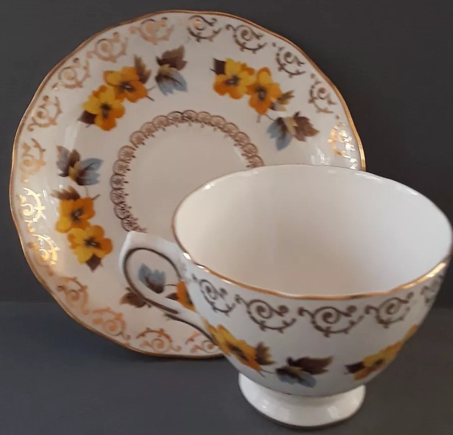 Vintage Colclough Bone China Made In England Cup and Saucer A Product of Ridgeway Potteries Ltd. Pattern No 8311 Yellow violets against a light cream background. Gold trim around rim and on handle. There are no chips or cracks. Excellent condition. Pre-owned. Never Used. Holder Not Included.