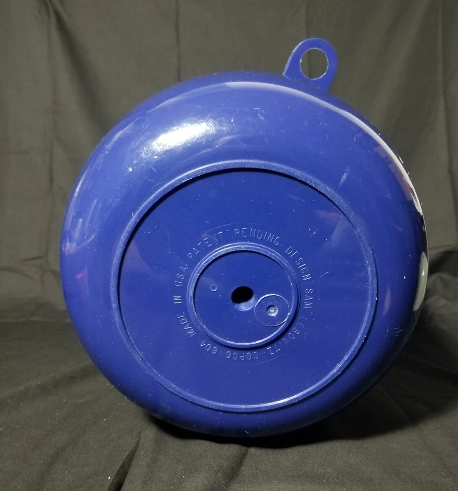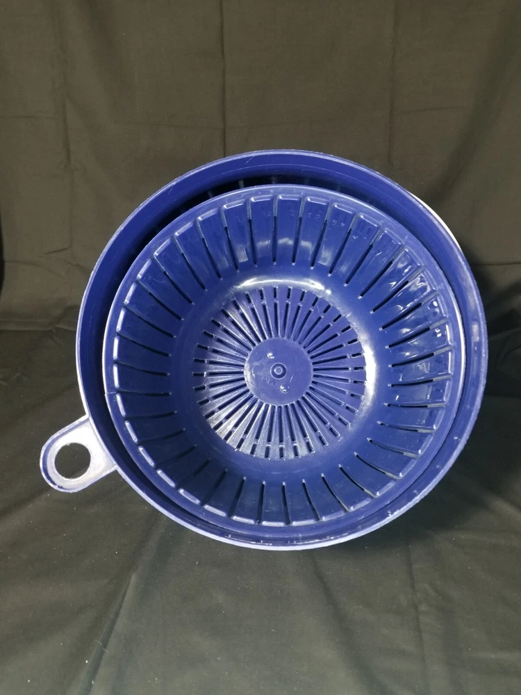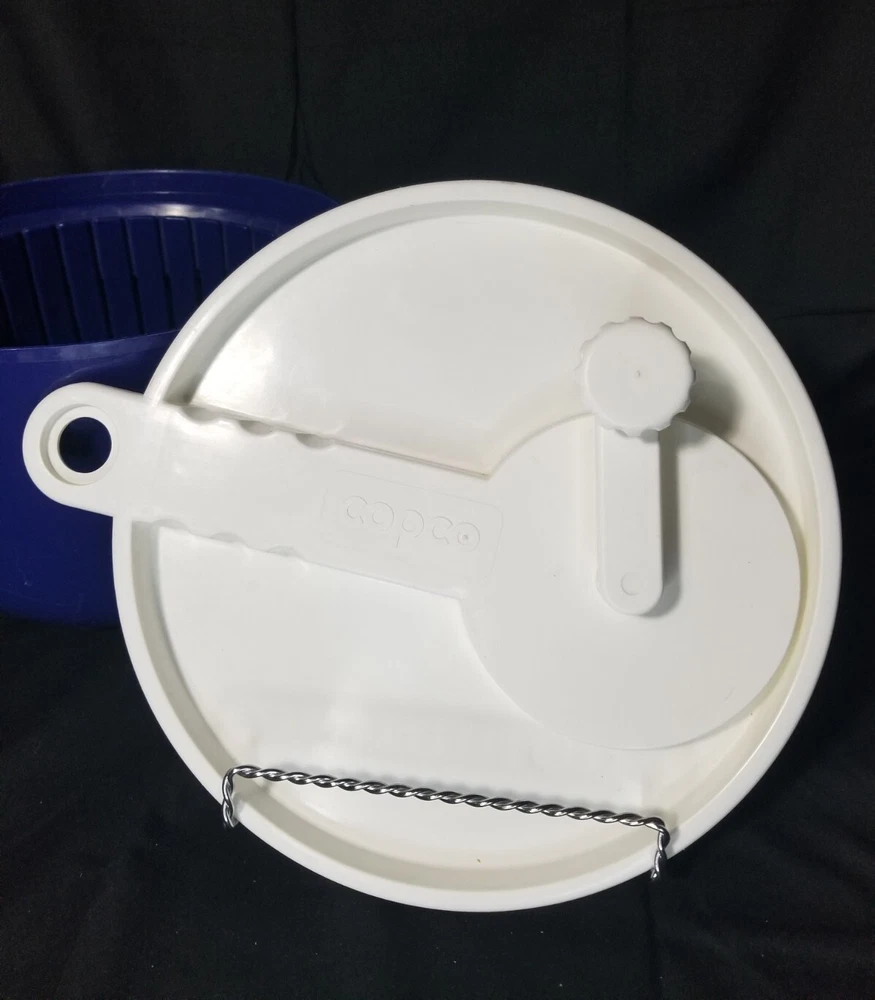 This vintage Copco salad spinner, designed by Sam Lebowitz, is a stylish addition to any kitchen. The blue plastic material and modern style make it a great choice for those who want a functional yet unique piece. It is perfect for spinning salads and other vegetables, making it a must-have for any home cook. The set includes one salad spinner, and it is made in the USA. Add a touch of mid-century modern flair to your kitchen with this Copco Sam Lebowitz salad spinner.
