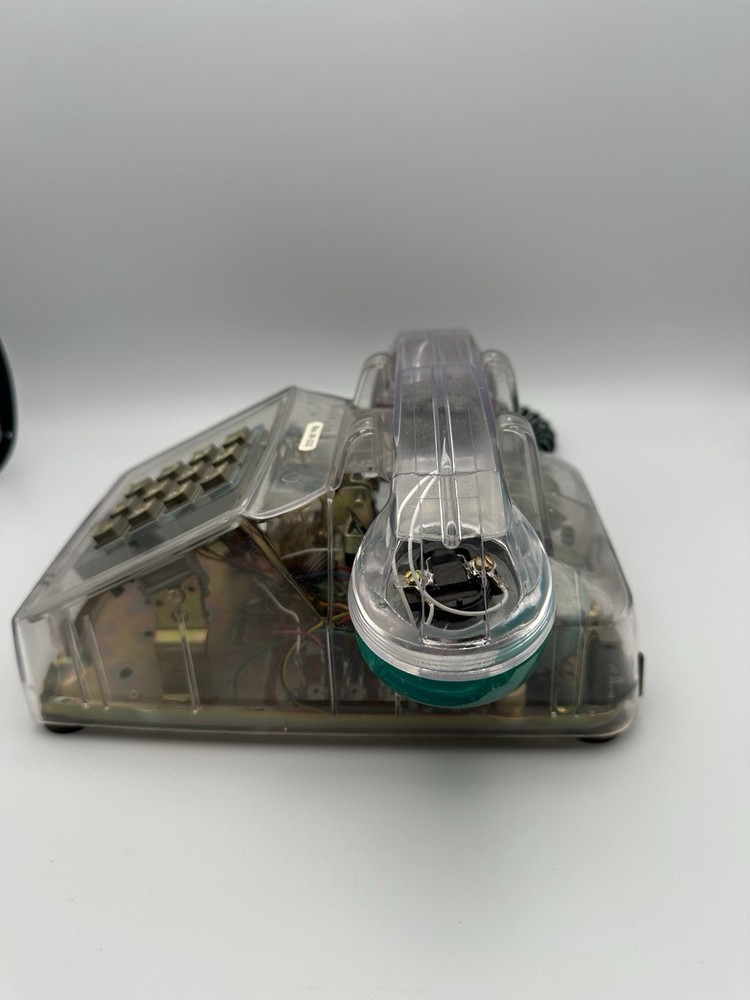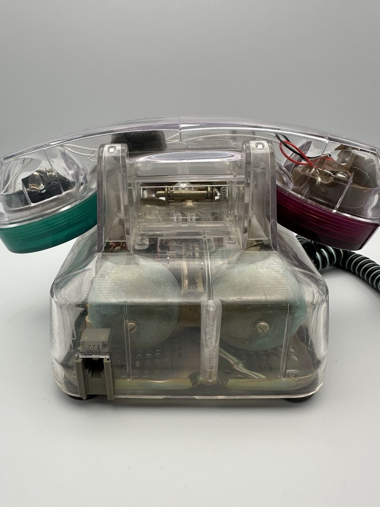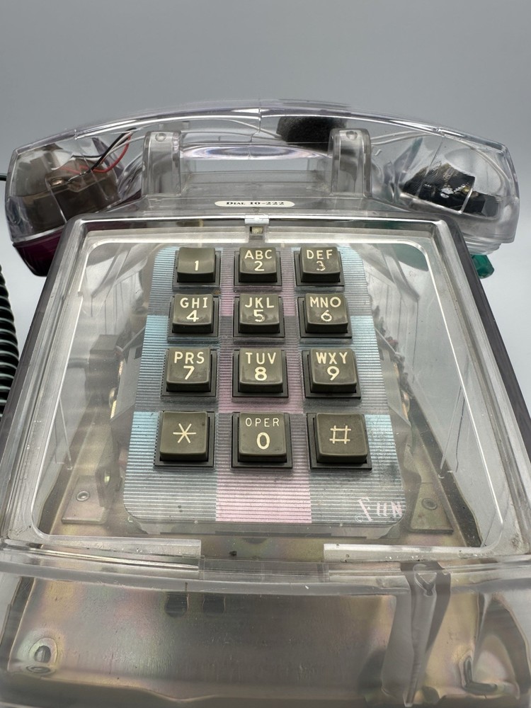The Vintage Cortelco ITT Transparent Retro Coded Desk Push Button Telephone is a rare and unique piece of nostalgia from the United States. This corded telephone features a clear design with a retro style, perfect for adding a touch of vintage charm to any home or office. With its single phone line capability and push button dialing, this telephone offers both functionality and a touch of old-school style. A rare find for collectors of vintage electronics, this Cortelco telephone is sure to stand out in any home telephone collection.