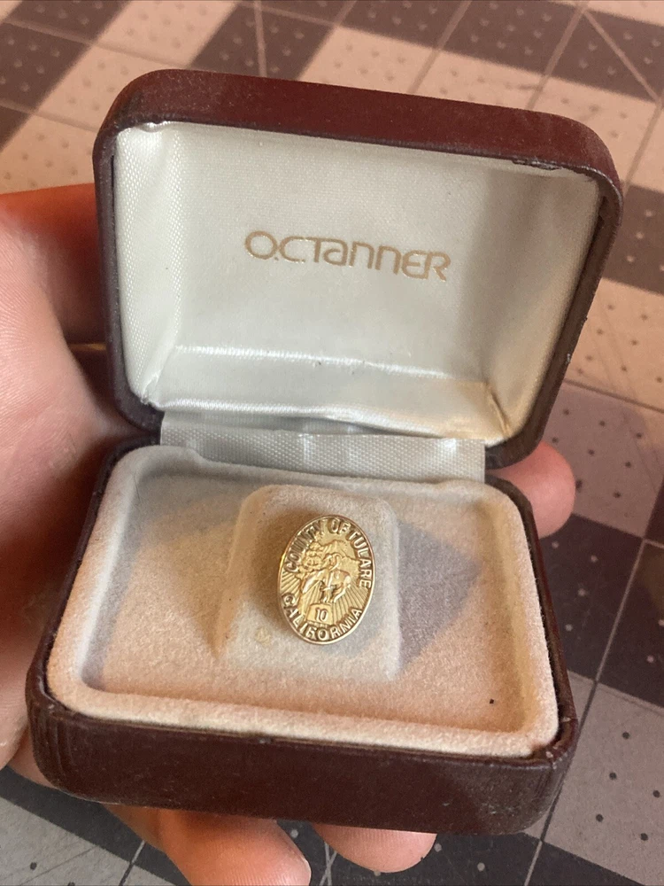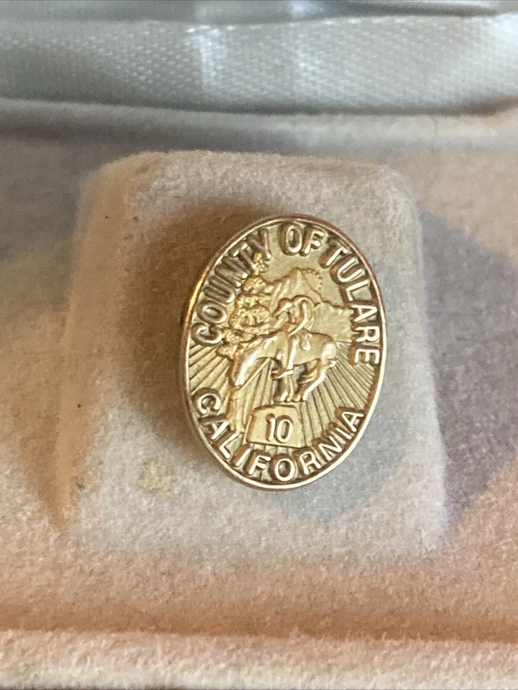 This vintage pinback from the County of Tulare, California is a rare find for collectors. With its 10-year designation and 1/10 scale, it's a unique addition to any collection. The pinback is made of 10K gold, adding to its value and durability. The pinback falls under the categories of Collectibles, Pinbacks & Lunchboxes, and Pinbacks, specifically Awards. Its theme is Awards, making it a special item for those who appreciate vintage collectibles. Don't miss out on the opportunity to add this rare pinback to your collection.