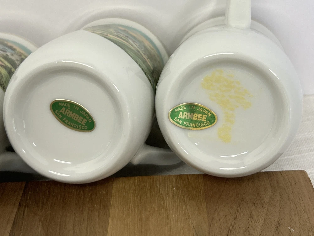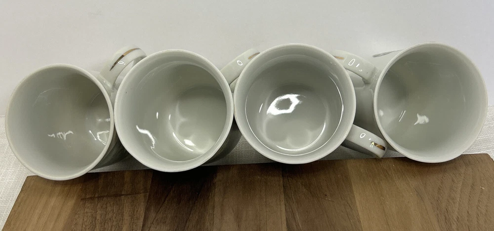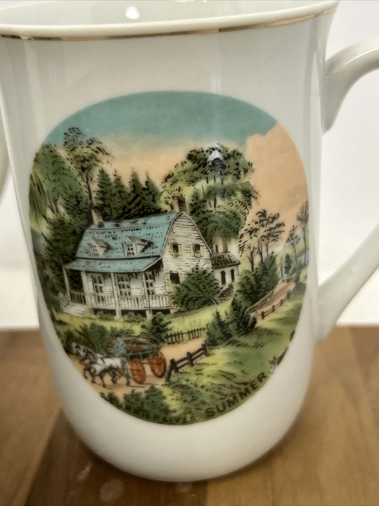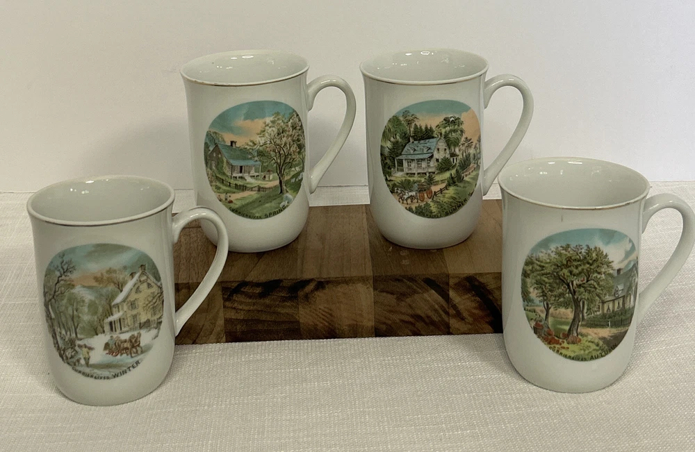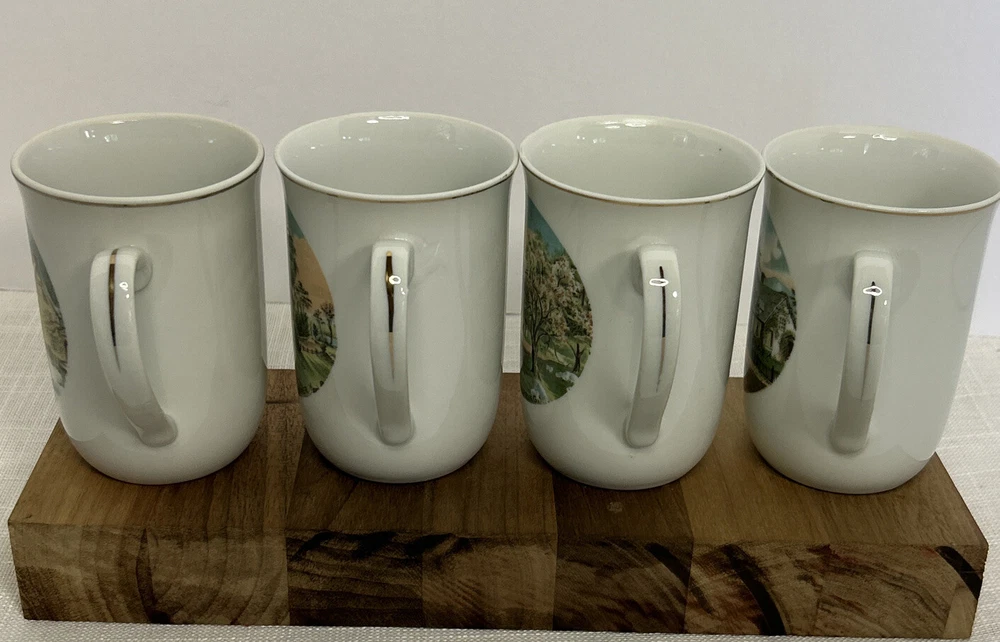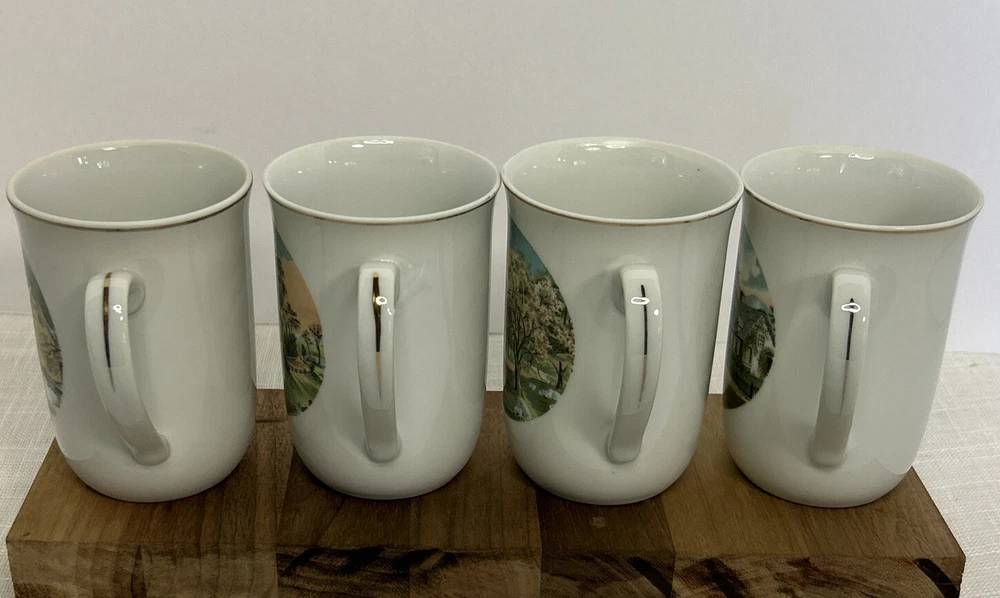 These vintage Courier & Ives set or four (4) coffee or tea mug set featuring the Four (4) (Winter/spring/Summer/Fall) Seasons will make a beautiful addition to any collection. The set includes four coffee/tea mugs, each with a unique seasonal design and gold rim. Made of durable porcelain, these mugs have a capacity of 6 to 8 ounces and stand 4 inches tall with a width of 3 inches. They are perfect for all occasions and make a great gift for any occasion including housewarming or birthday. Please note that hand washing is recommended to ensure the longevity of the beautiful designs. This vintage Set of Four (4) Seasons (Winter/Spring/Summer/Fall) Coffee/Tea Mugs by Courier & Ives and made in Japan in the 1960's are in great vintage pre-owned condition, with NO chips, cracks or repairs. However, they do show some slight minor wear consistent with their age. Please review all pictures for proper assessment of their great vintage pre-owned condition.