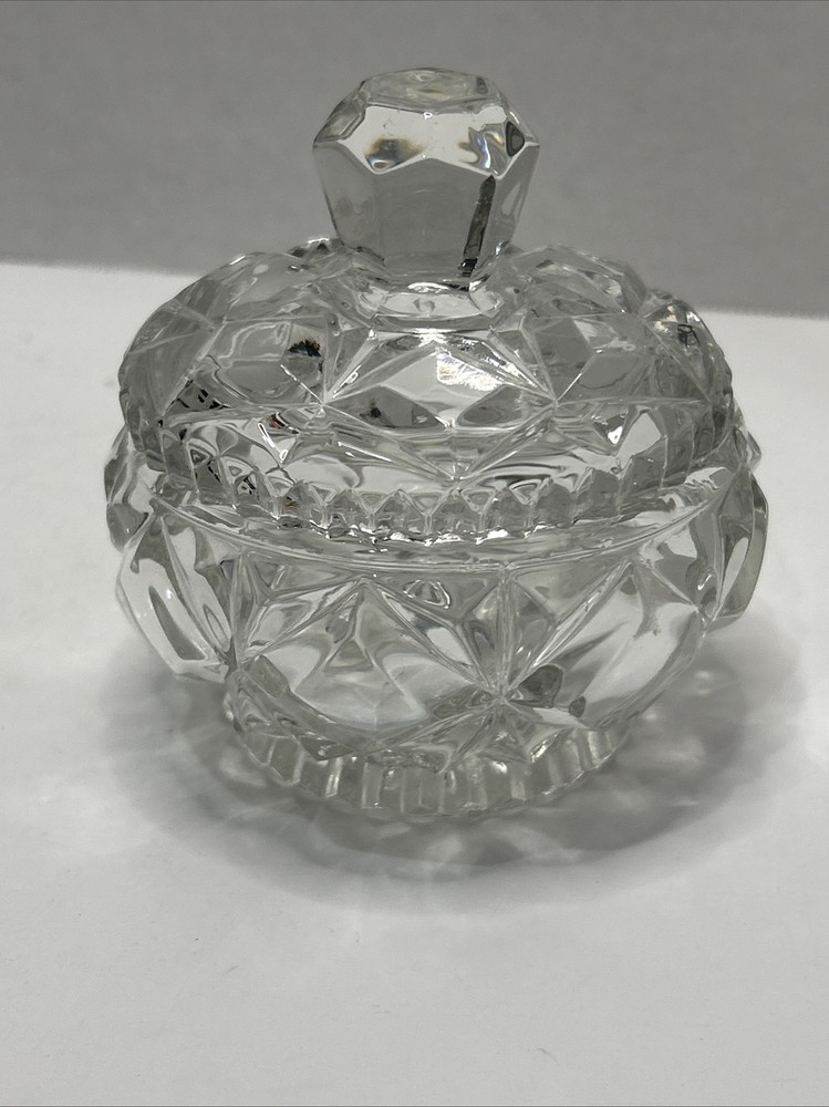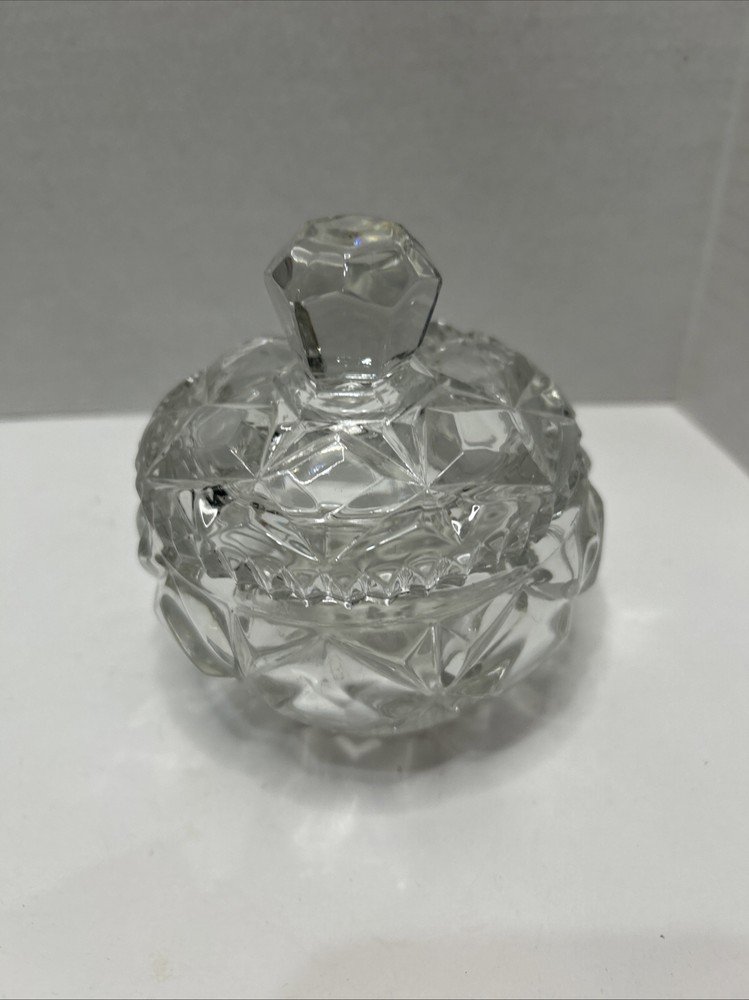 Elevate your display with this Vintage Crystal Cut Glass Candy Dish or Trinket Bowl, complete with a matching lid. Each piece measures 4” x 4”, perfect for holding your small trinkets or candies while adding a touch of mid-century modern elegance to your space. The clear glass material showcases an intricate cut design, capturing the light to create a sparkling display on any shelf or table. Crafted from premium glass, this set offers a timeless appeal and is versatile enough for both casual and formal settings. The two-piece unit is an ideal addition to any collector's array of decorative collectibles or as a charming gift for those who appreciate the beauty of vintage glassware. Whether for personal use or as a thoughtful present, this crystal cut glass dish is sure to be treasured.