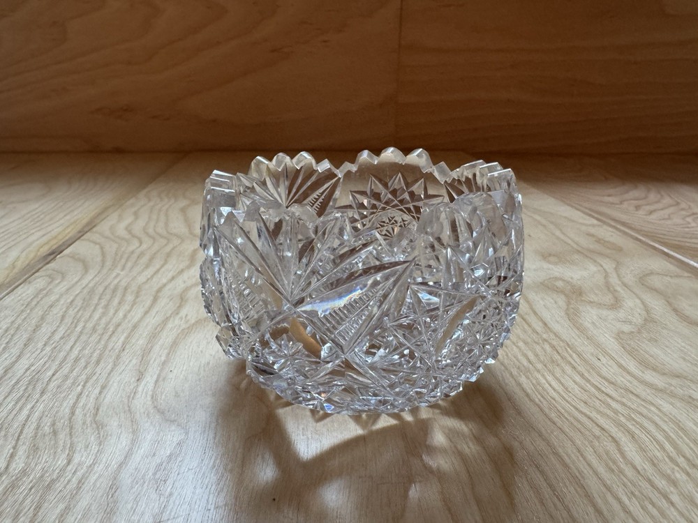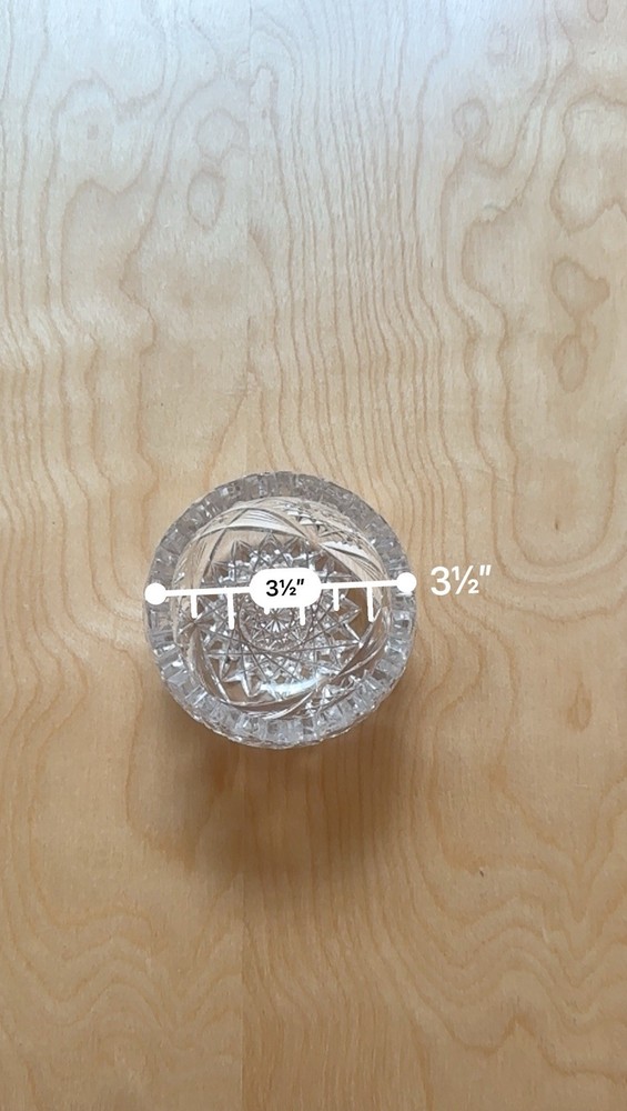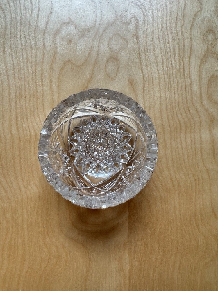 This vintage round trinket bowl showcases an intricate cut glass starburst design with a scalloped rim. A versatile piece, it measures approximately 3.5 inches in diameter and works wonderfully as a catch-all for rings, keys, or desk accessories. 🧼 No chips, cracks, or flaws — excellent vintage condition 💎 Heavy, quality feel with brilliant shine 🖼️ Final photo includes matching items — a handled dish and a perfume bottle. Check out my other listings to bundle and save on shipping!