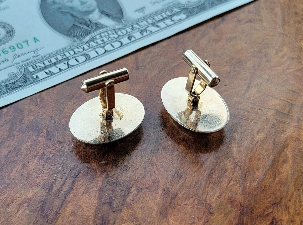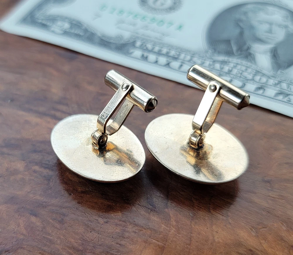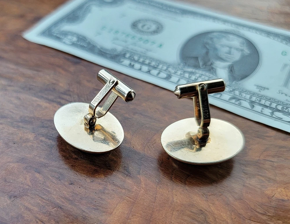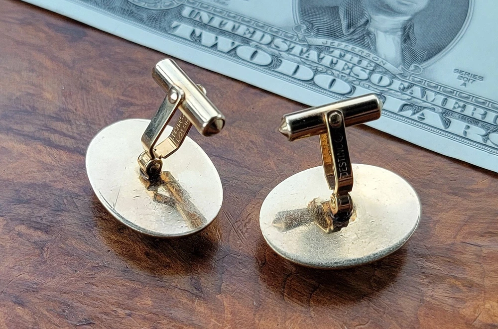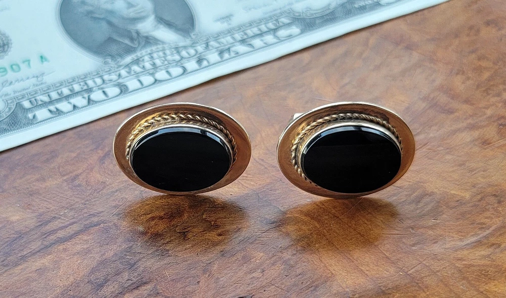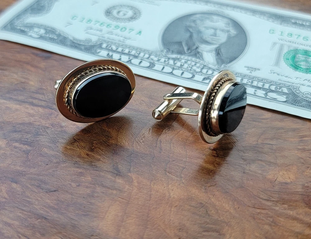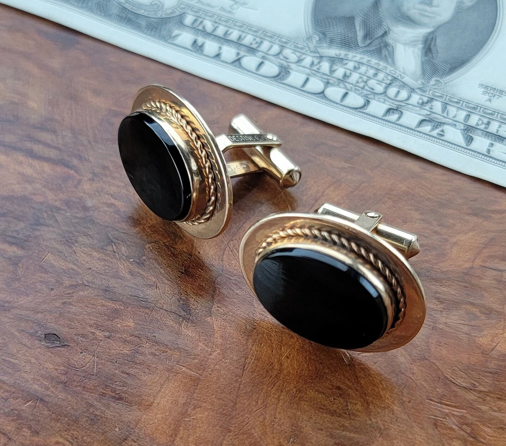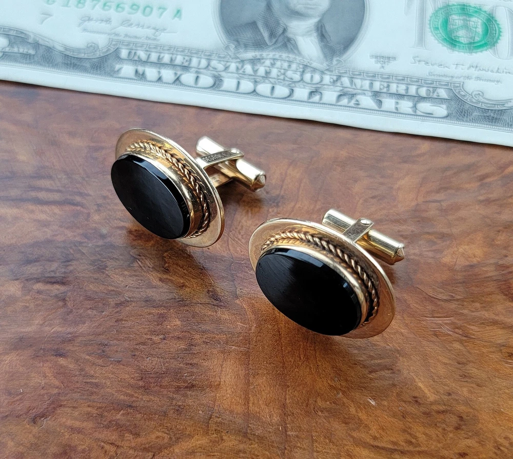 Vintage DESTINO Cufflinks - Oval - Gold Filled/Black Onyx DIMENSIONS: Front: 25 mm x 20 mm. Cabochon: 18 mm x 13 mm. Total weight, both cufflinks: 13.3 grams. DESCRIPTION: Vintage cufflinks. By DESTINO. 1/20th 12K gold filled cufflinks. Oval front with bezel-set flat oval black onyx cabochon and twisted wire accent. Bullet toggle with hinged post. All original. Maker's marks: "Destino © - 1/20th 12K G.F. - D&F"; "Pat 2093723 - Pat 2544833". Mid 20th century. USA. CONDITION: Both cufflinks are in excellent original condition. No damage and no significant wear. No restorations / repairs. Gently used, not abused. No dings, dents, scuffs, cracks, splits, bends, breaks. No significant scratches or rubs. No significant edge wear. The hinges and toggles hold position as designed with no issues. On close inspection you may detect light typical use- / handling-related wear: scattered fine superficial scratches and rubs. Nothing at all significant or conspicuous. Old patina as found. Light typical age-related oxidation.