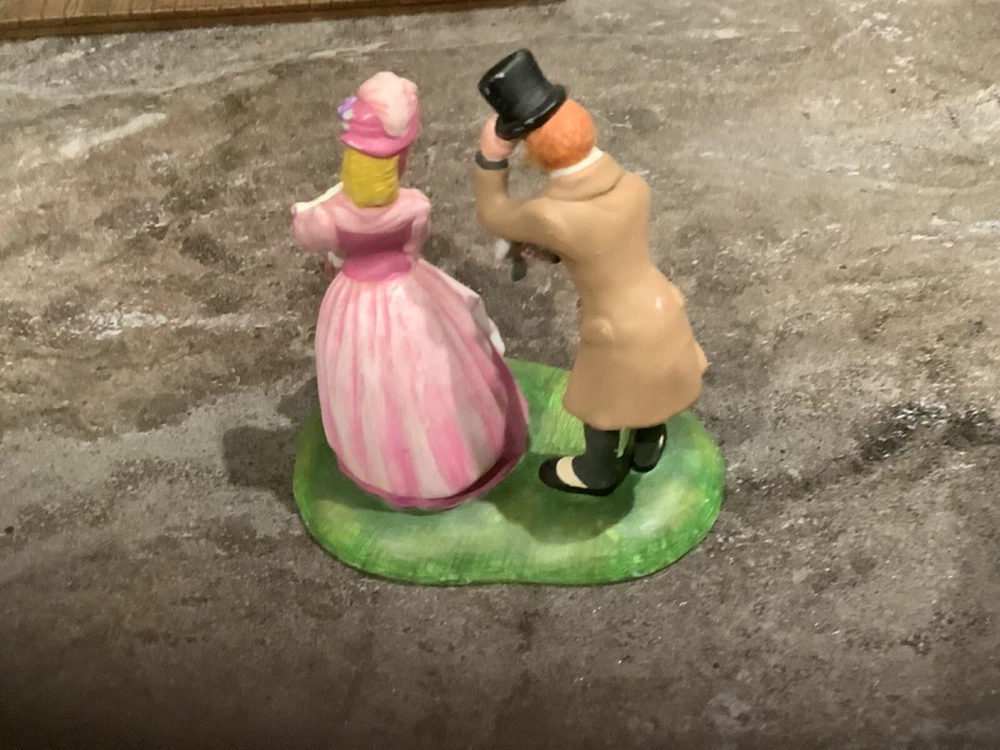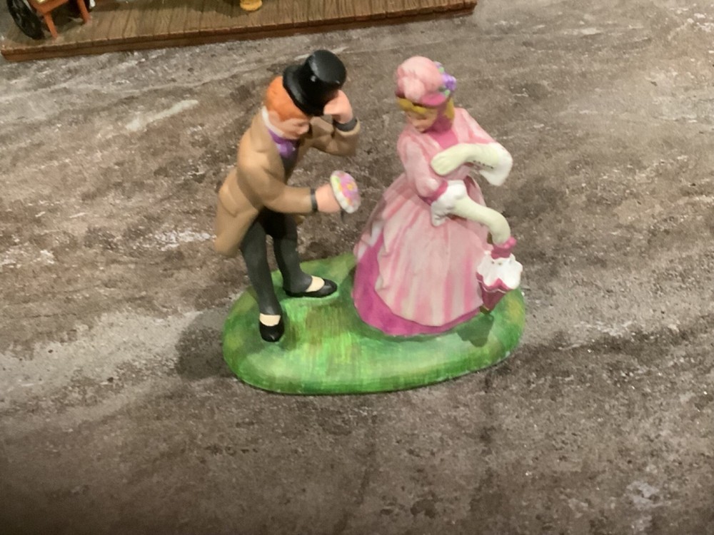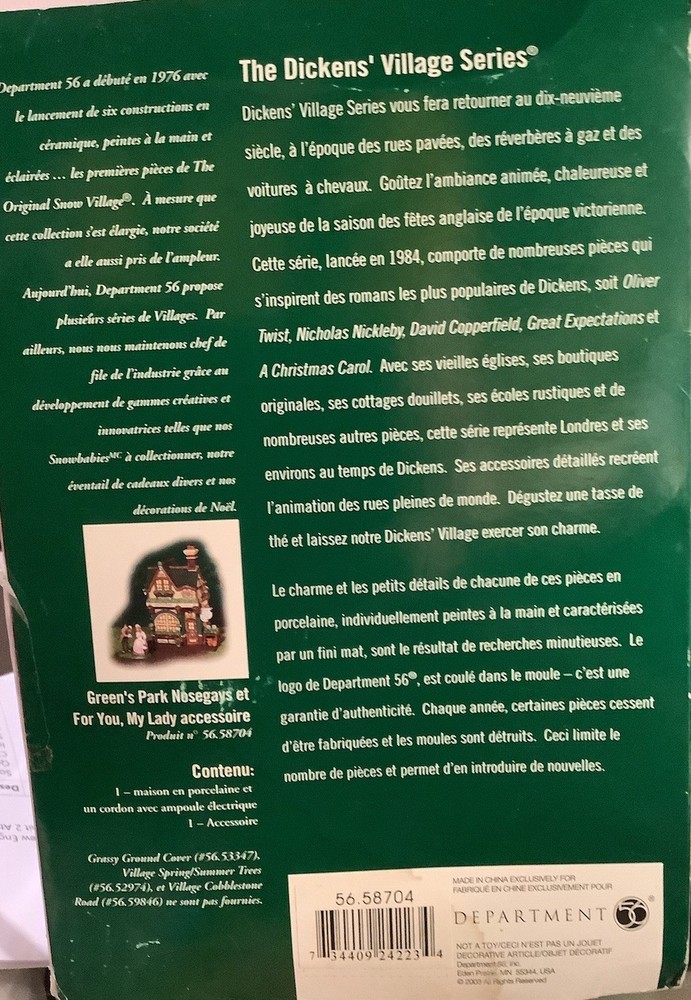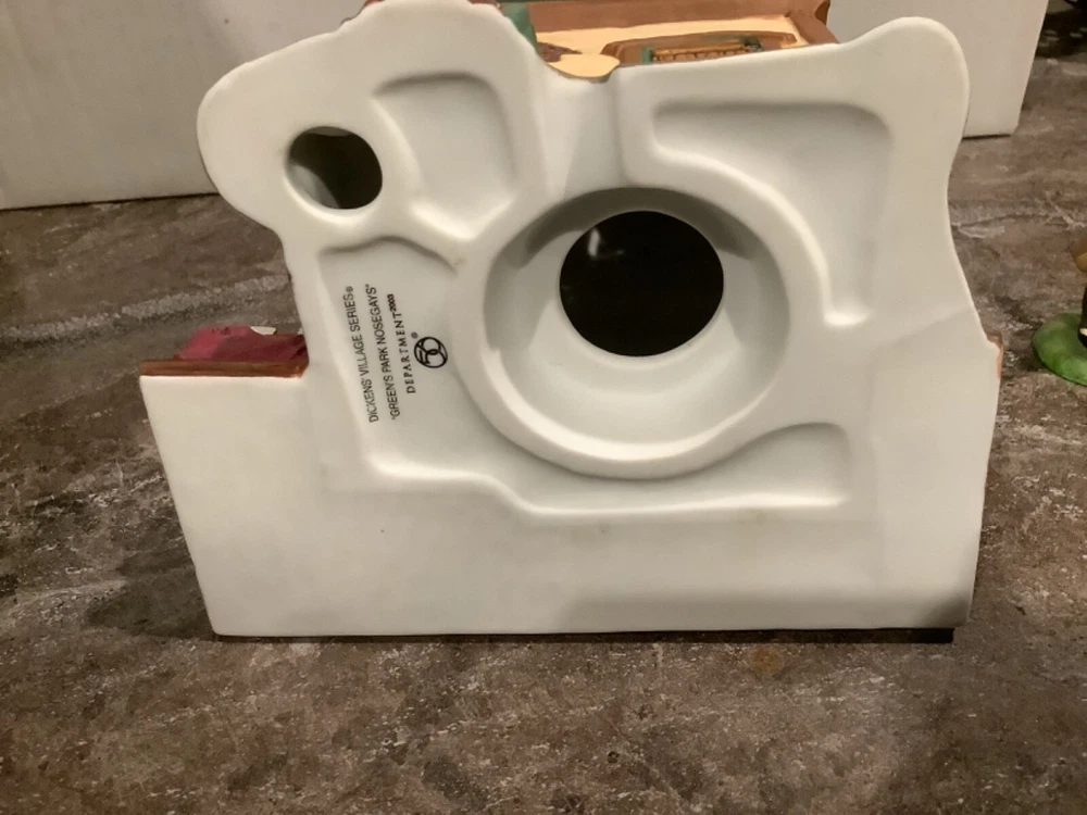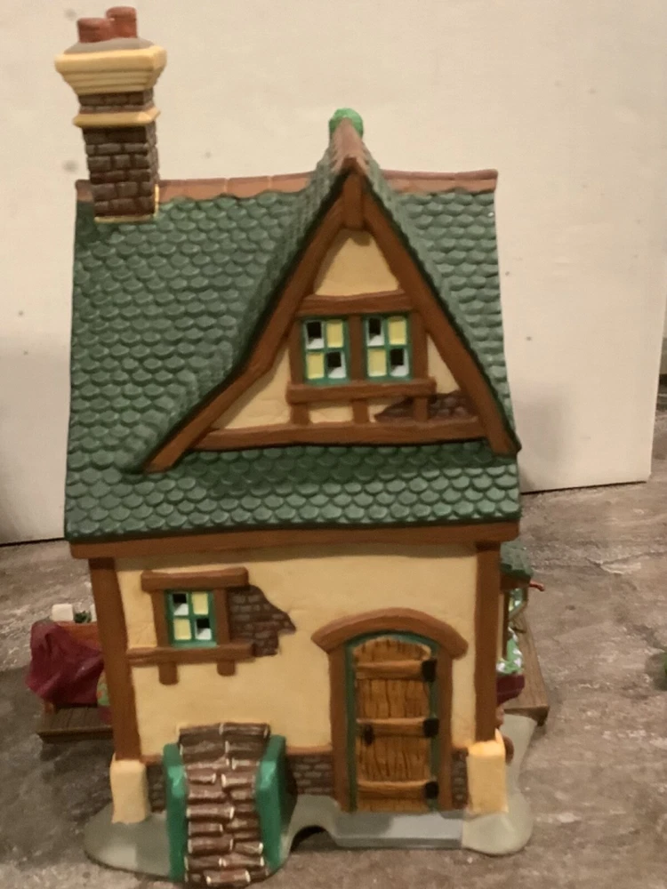 Add a touch of Victorian elegance to your holiday decor with this beautiful Department 56 porcelain house and couple figurine. The asymmetrical, hand-painted house is illuminated for a warm, inviting glow, and the matte green finish complements any room's color scheme. Perfect for furniture, this large 8.75" high and 8.25" long house weighs 2 lbs and comes in a box for safekeeping. *Missing the cord to light it up. Myself, I would just put a strand of white Christmas lights in it.* The house and couple are part of the Dickens Village collection and were manufactured in 2003, making them a licensed reproduction from the 21st century. Whether you're a collector or just looking for a stunning holiday decoration, this Department 56 piece is sure to impress.