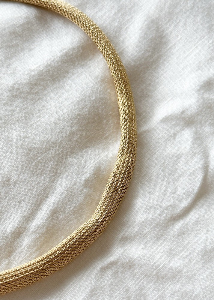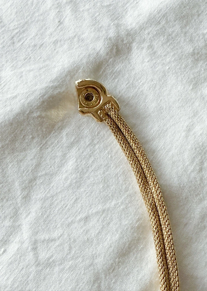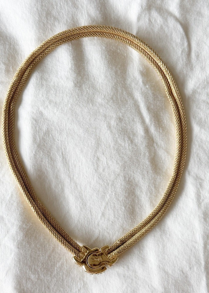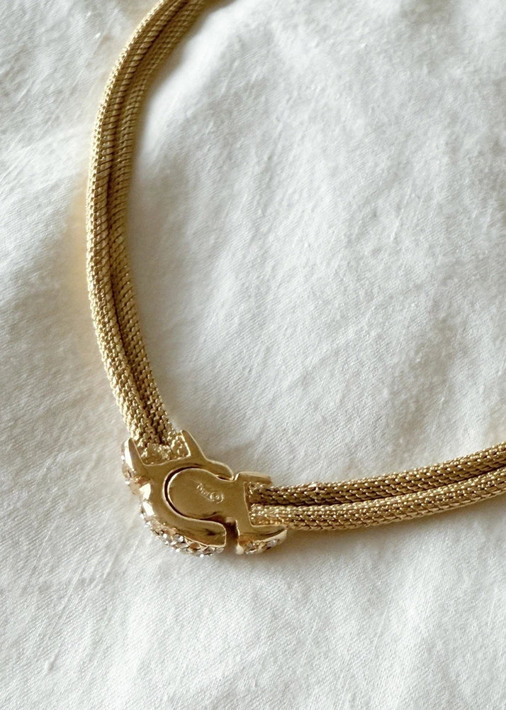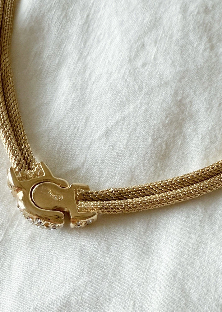 Vintage 1980's Christian Dior mesh collar featuring bold gold-tone mesh design and a statement crystal-encrusted center. Press clasp front closure & Dior signature on the clasp back. Details: • Designer: Christian Dior (signed on clasp) • Era: Vintage 1980s • Material: Gold-tone mesh metal • Centerpiece: Dome-shaped with pavé-set clear crystals • Closure: Fold-over PRYM clasp • Measurements: 38cm length, .9cm width, weight aprox 55g. Condition: Good vintage condition with some signs of age-related wear. The gold-tone finish remains rich and untarnished, and the crystals retain their brilliance. A few stones are missing from the centerpiece, and the mesh chain has minor soft kinks and slight flattening in areas—consistent with the natural flexibility and age of the material. These aspects do not detract significantly from the beauty or wearability of the piece but are reflected in the price. Rare and collectible find for Dior lovers and vintage jewelry enthusiasts alike.