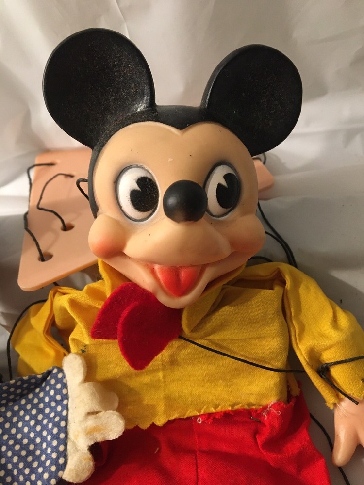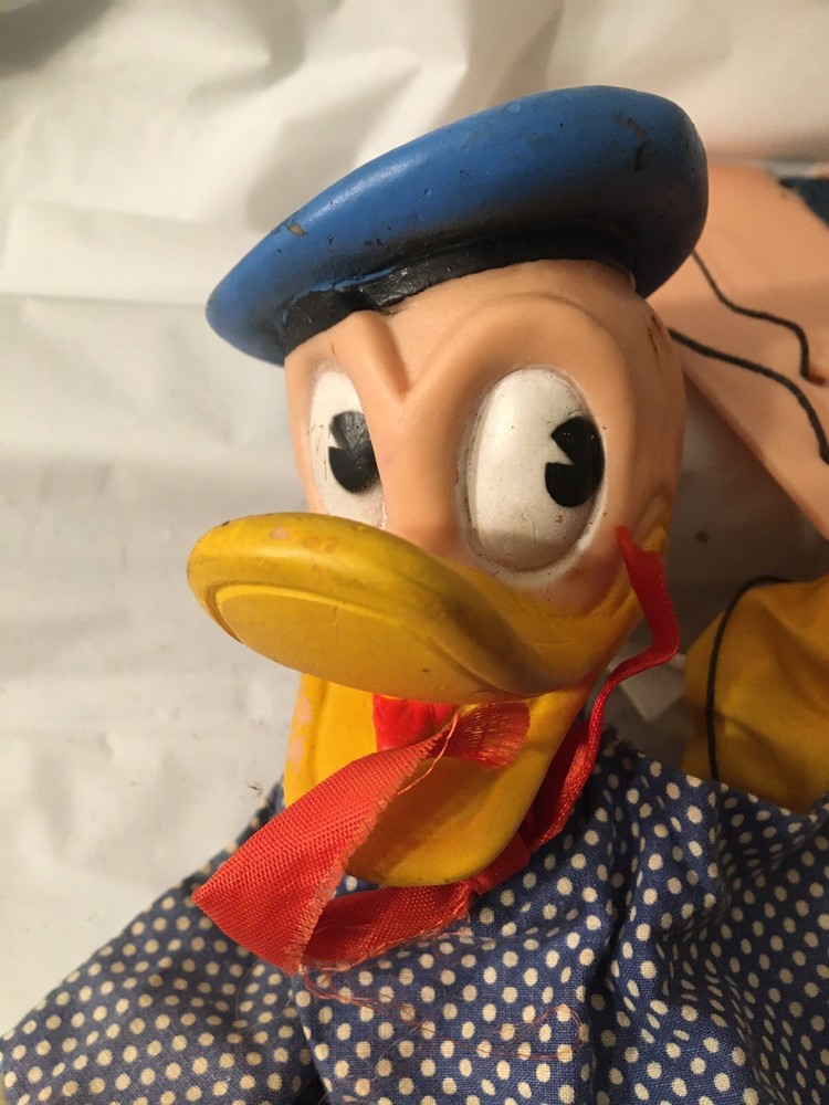This vintage Disney Gund puppet toy set features Donald Duck and Mickey Mouse, both beloved characters from the Disney franchise. These plush toys are designed in collaboration with Walt Disney Productions (W.D.P.), adding to their collectible value. The puppets showcase the iconic charm and whimsy of these classic Disney characters, making them a delightful addition to any Disneyana collection.