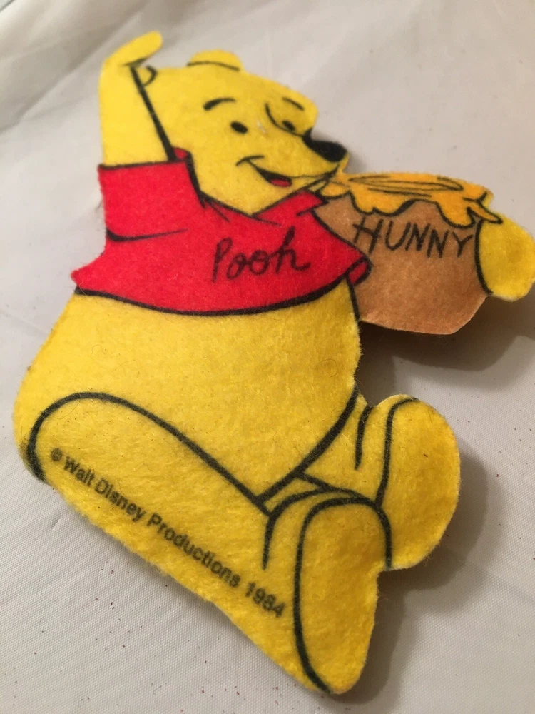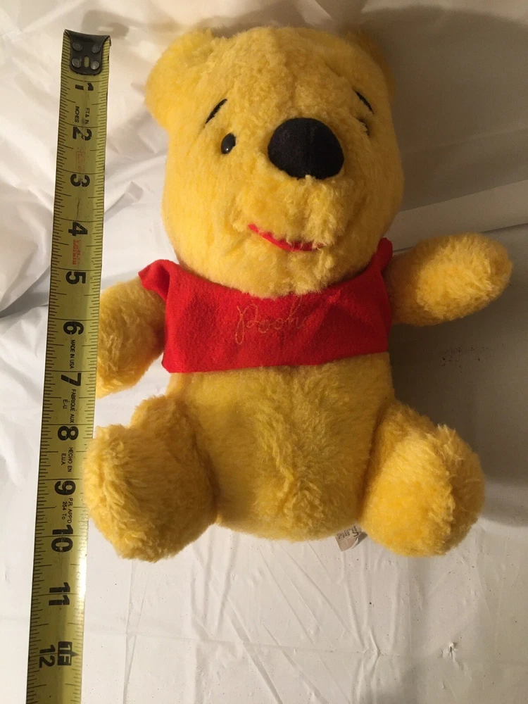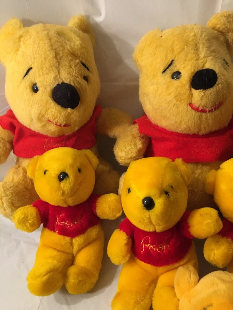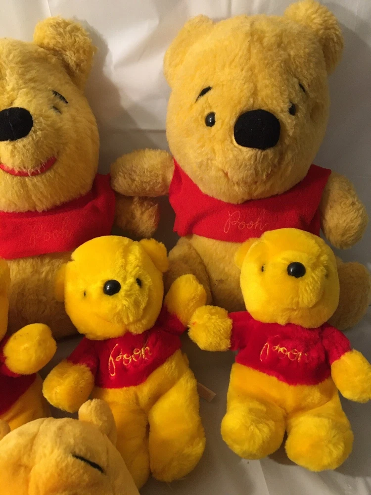 This vintage Disney Winnie the Pooh plush lot features multiple plush toys from the beloved character and franchise. These collectible items are perfect for any Disneyana collector or fan of Winnie the Pooh. The plush toys showcase the charming and timeless design of the character and are a great addition to any Disney collection. The toys appear to be mostly from the 1980’s and are all in good condition. The collection includes 5 small Poohs, 3 larger Poohs, a hand puppet Pooh, a vintage felt ornament Pooh and 2 small PVC Winnie the Poohs.