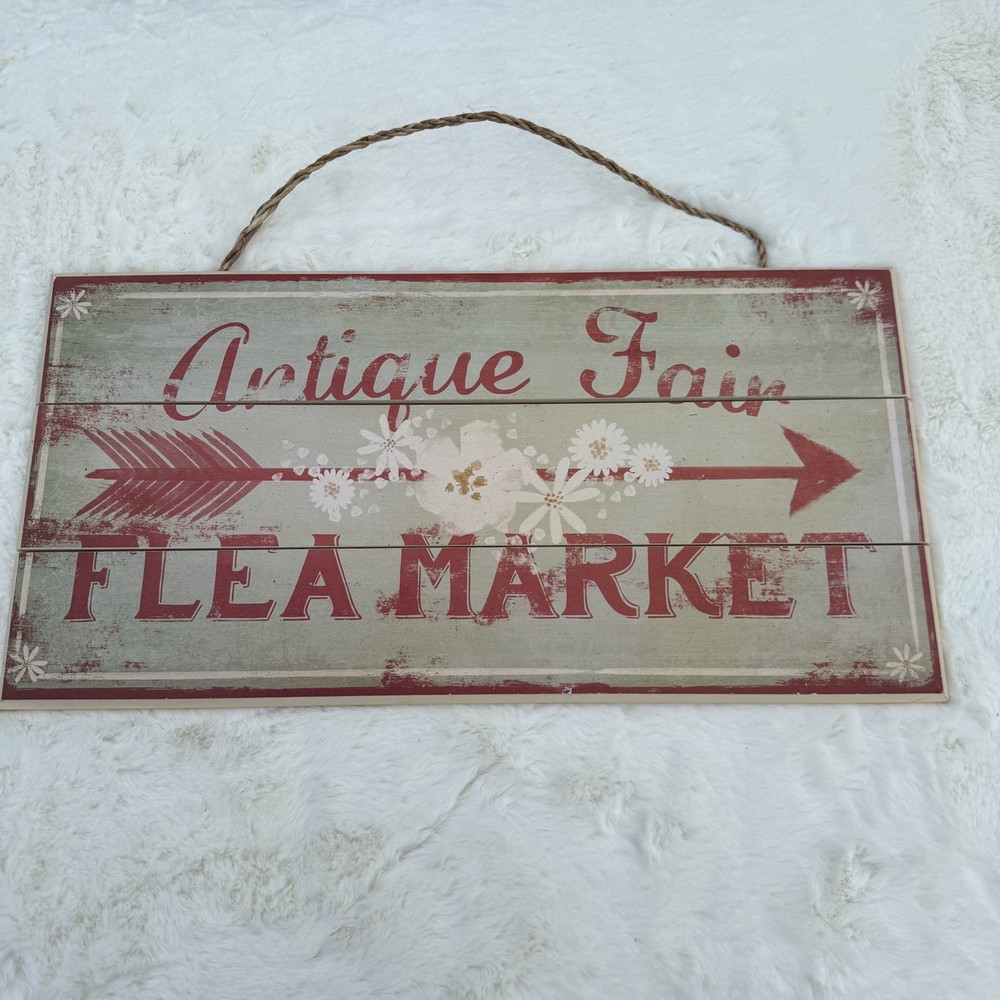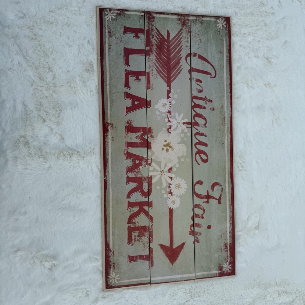 Add a touch of rustic charm to your home decor with this antique distressed wood flea market sign. The rectangular shape and aged finish give it a farmhouse style that is perfect for any room. The sign features a red, white, and teal color scheme, with a ready-to-hang design for easy installation. Made from wood and wood veneer, this decorative piece adds a unique antique flair to your space.