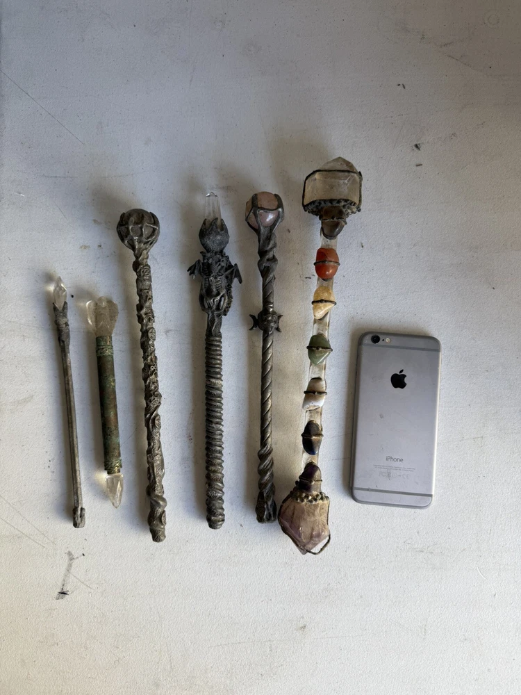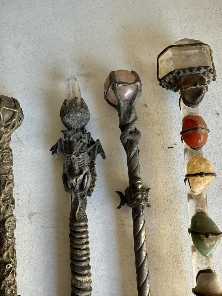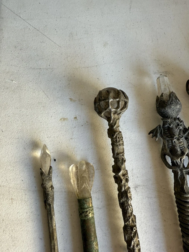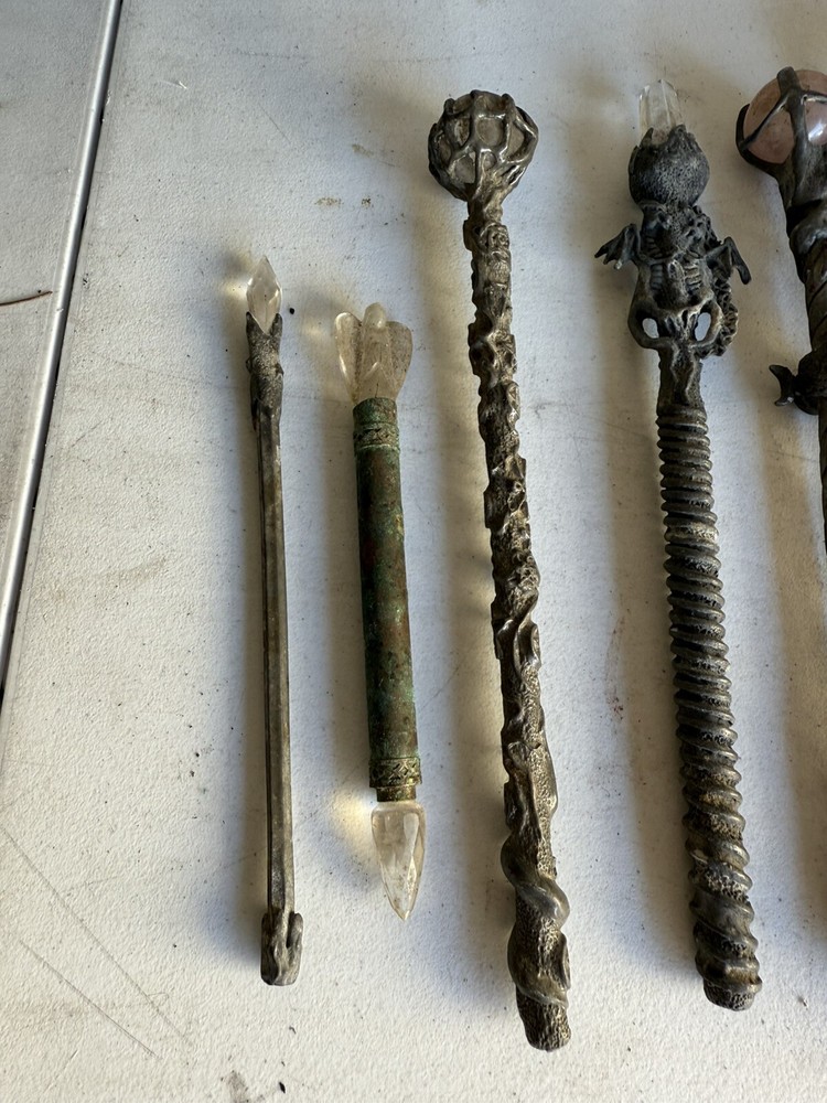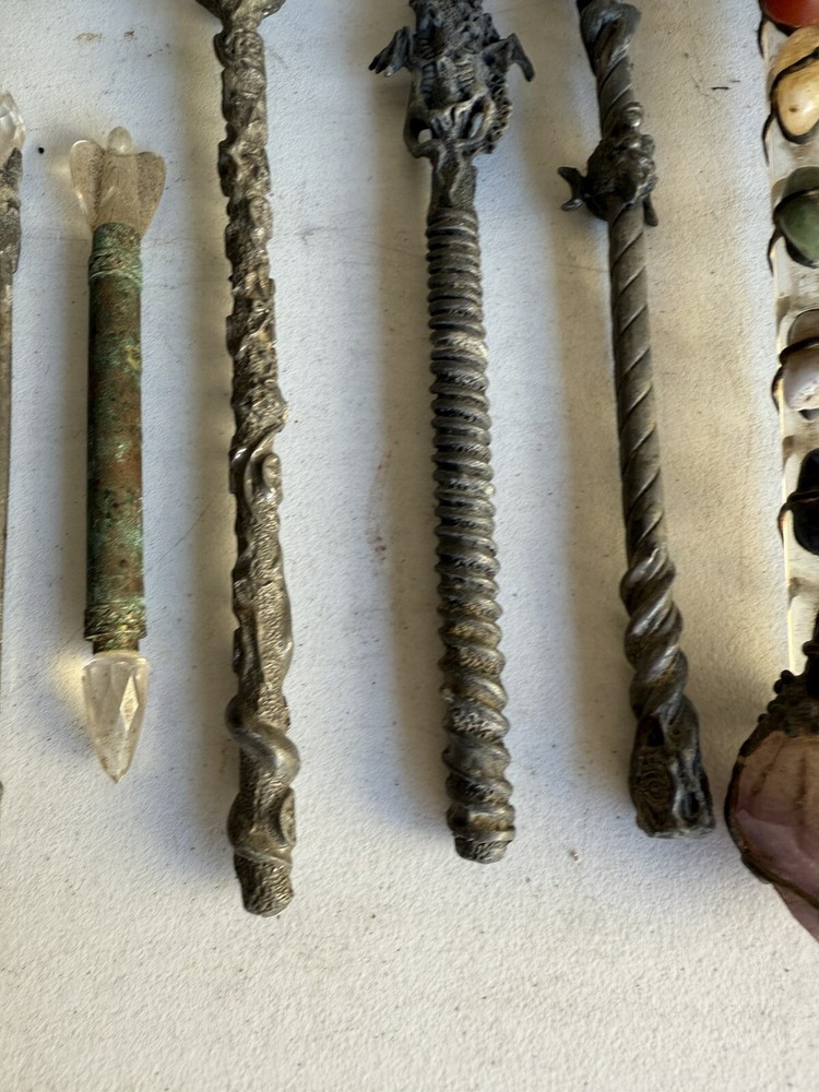 This lot comes as you see it. These are beautiful pieces with very detailed artwork on some of them, including the dragons and the stars on the stick. These are solid pieces. They are not hollow so the wands do have some weight to them Please look at all photos and ask any questions prior to purchase as all sales are final. There is no returns accepted. I am unsure exact age of these items, but as you can tell, they are definitely from an older timeframe, possibly 80s if not older.. iPhone in photo not included only used for size reference.