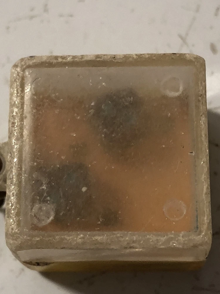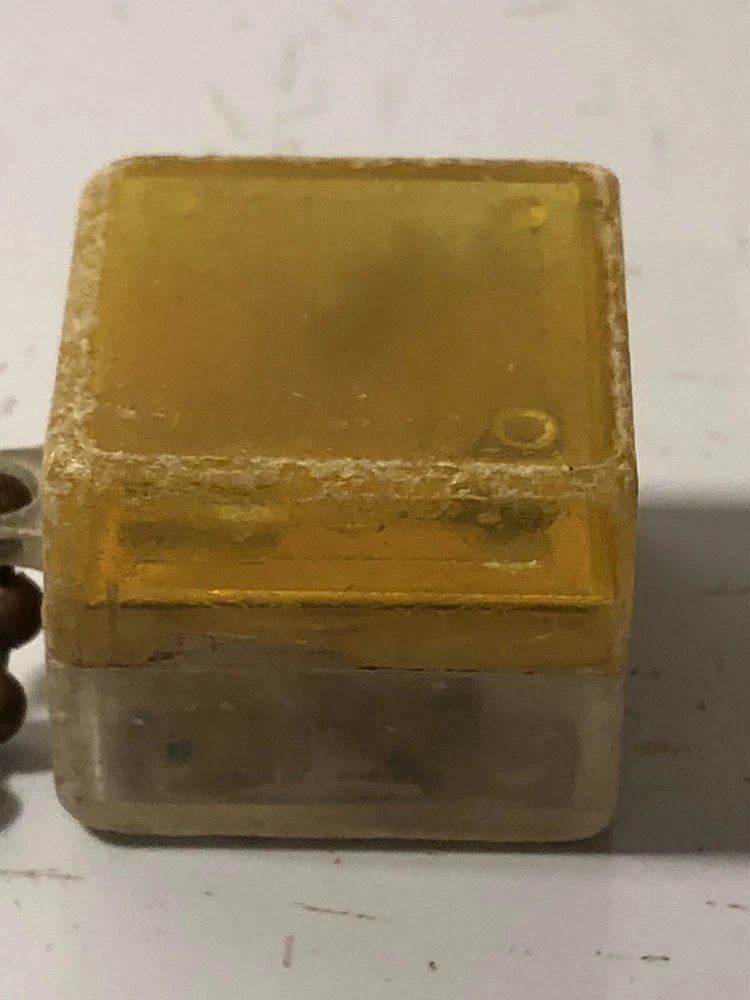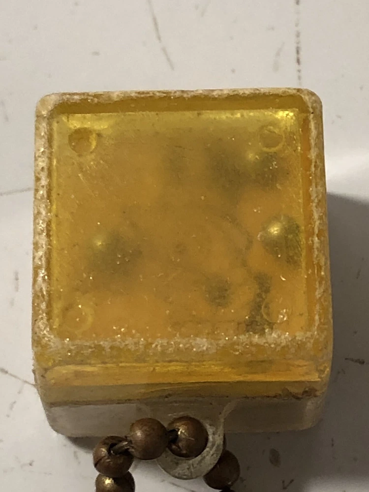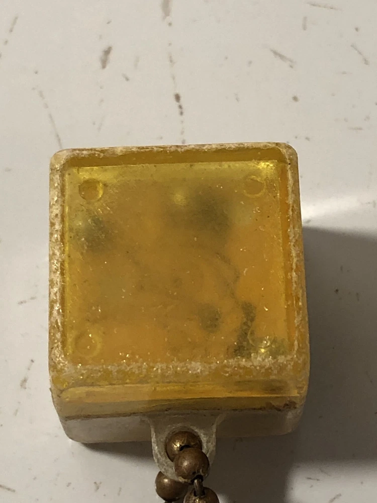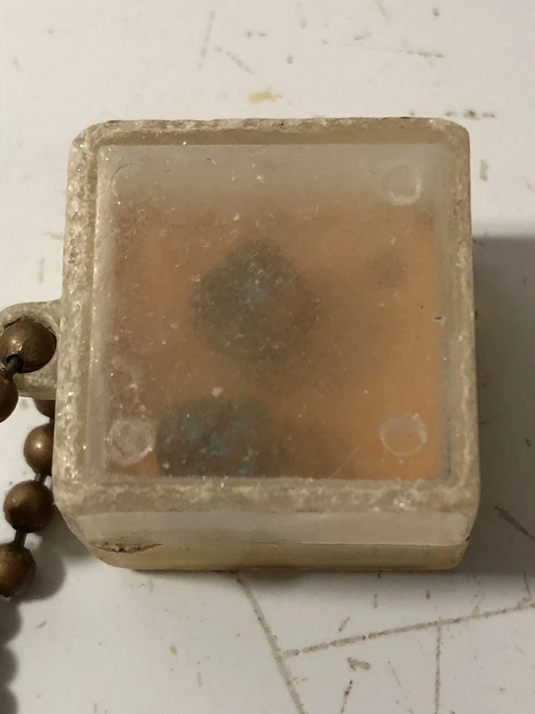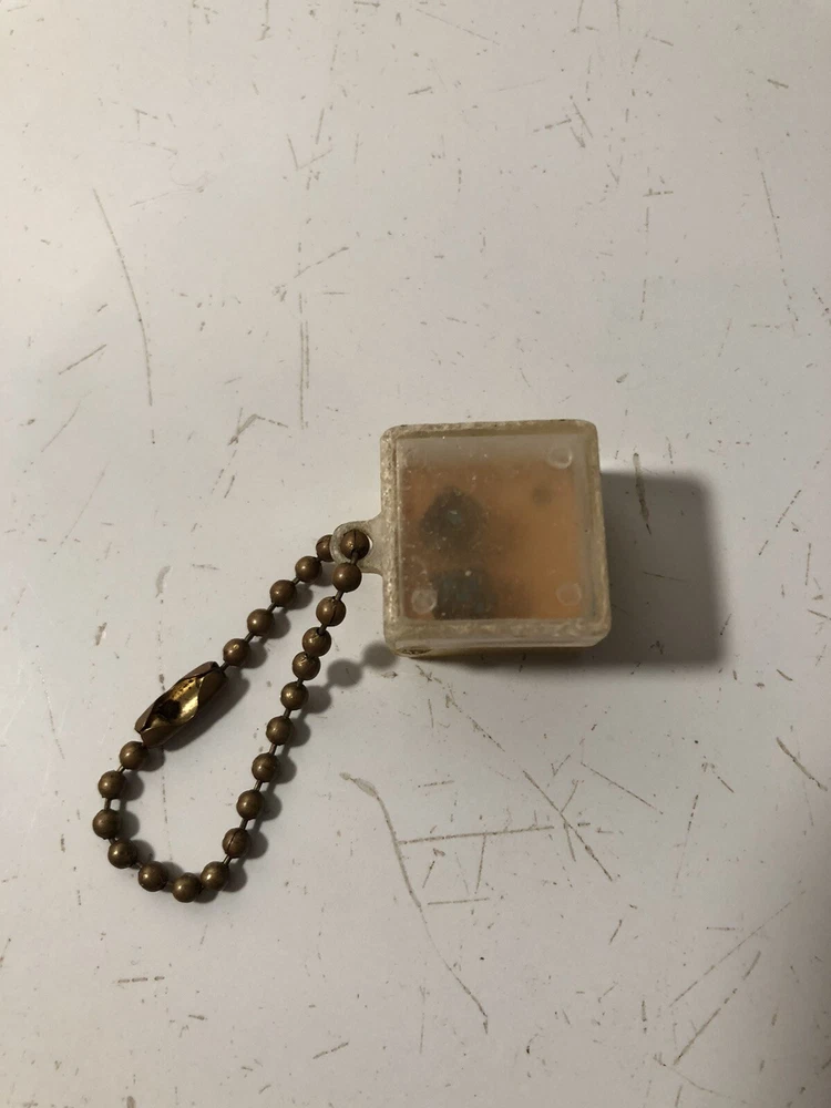 A vintage keychain with a cube attachment. The cube has two inner “toys”; one side has a tiny pair of dice, and the other has a duck’s face with three holes and three balls to try to get into the holes. The plastic on both sides is cloudy and it’s difficult to see the dice and duck, sold as is.