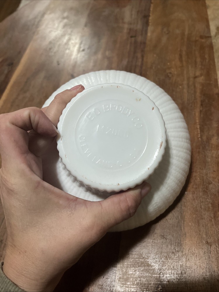 This vintage candy dish bowl from E.O. Brody Co. is a beautiful addition to any collection. The milk glass pedestal base adds a touch of elegance to the intricate design, making it perfect for all occasions. The round shape and white color make it versatile and easy to display in any space. The bowl was manufactured in 2000 in Cleveland, OH and is a great representation of 21st-century milk glass production style. It is a unique piece with a vintage pattern that adds character to any home decor. This Candy brand bowl is an ideal gift for any occasion and is sure to impress any collector.