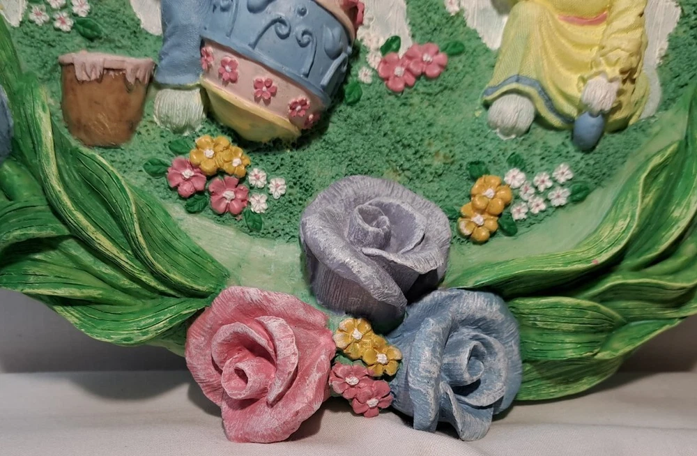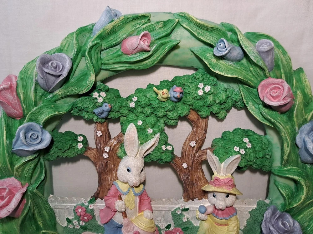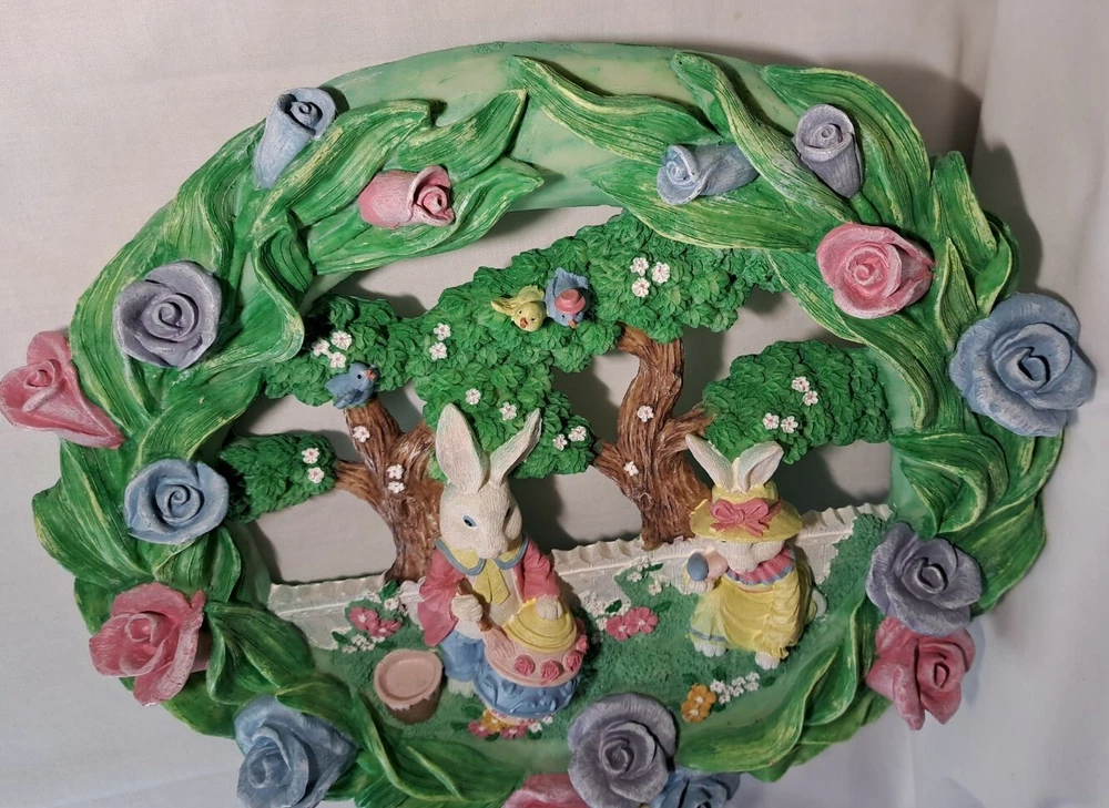 Easter Bunny Eggs Flowers Birds Vintage Easter Wreath Bunnies Resin Approx 12" tall see pictures for measurements I consider to be in VERY GOOD condition Please view all photos zooming in on them as they are part of the description for you to judge condition Will ship either USPS, Fedex or UPS depending on the location of where buyer lives. IMPORTANT - if ships via UPS or Fedex they require a home delivery address as they cannot deliver to post office boxes - NO POST OFFICE BOX