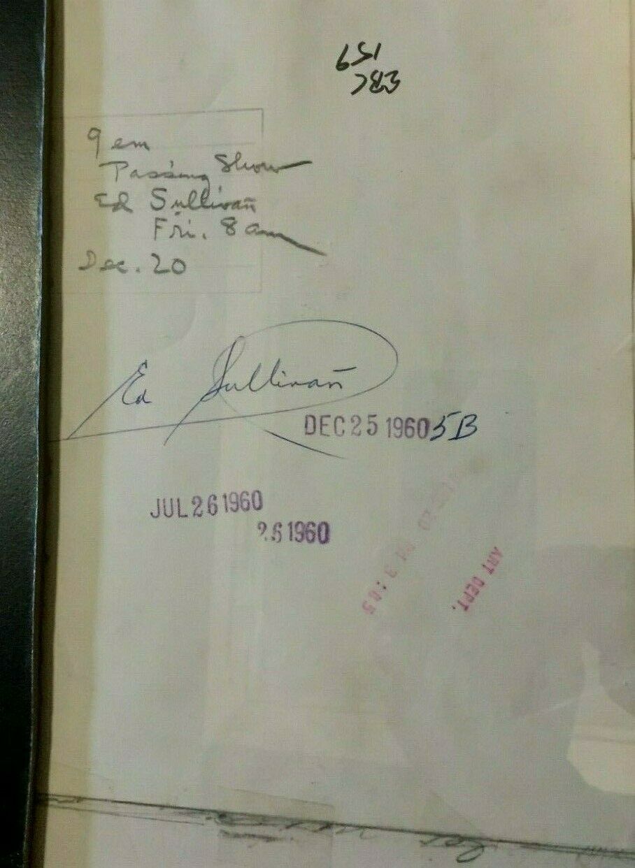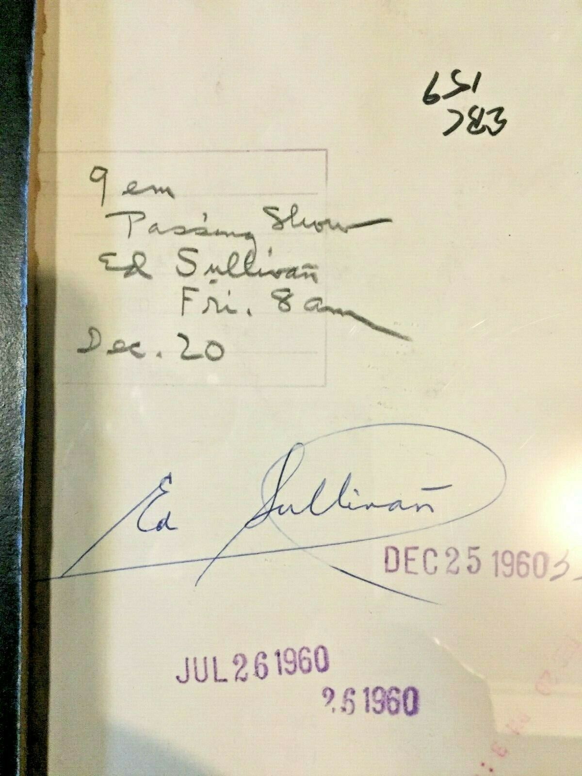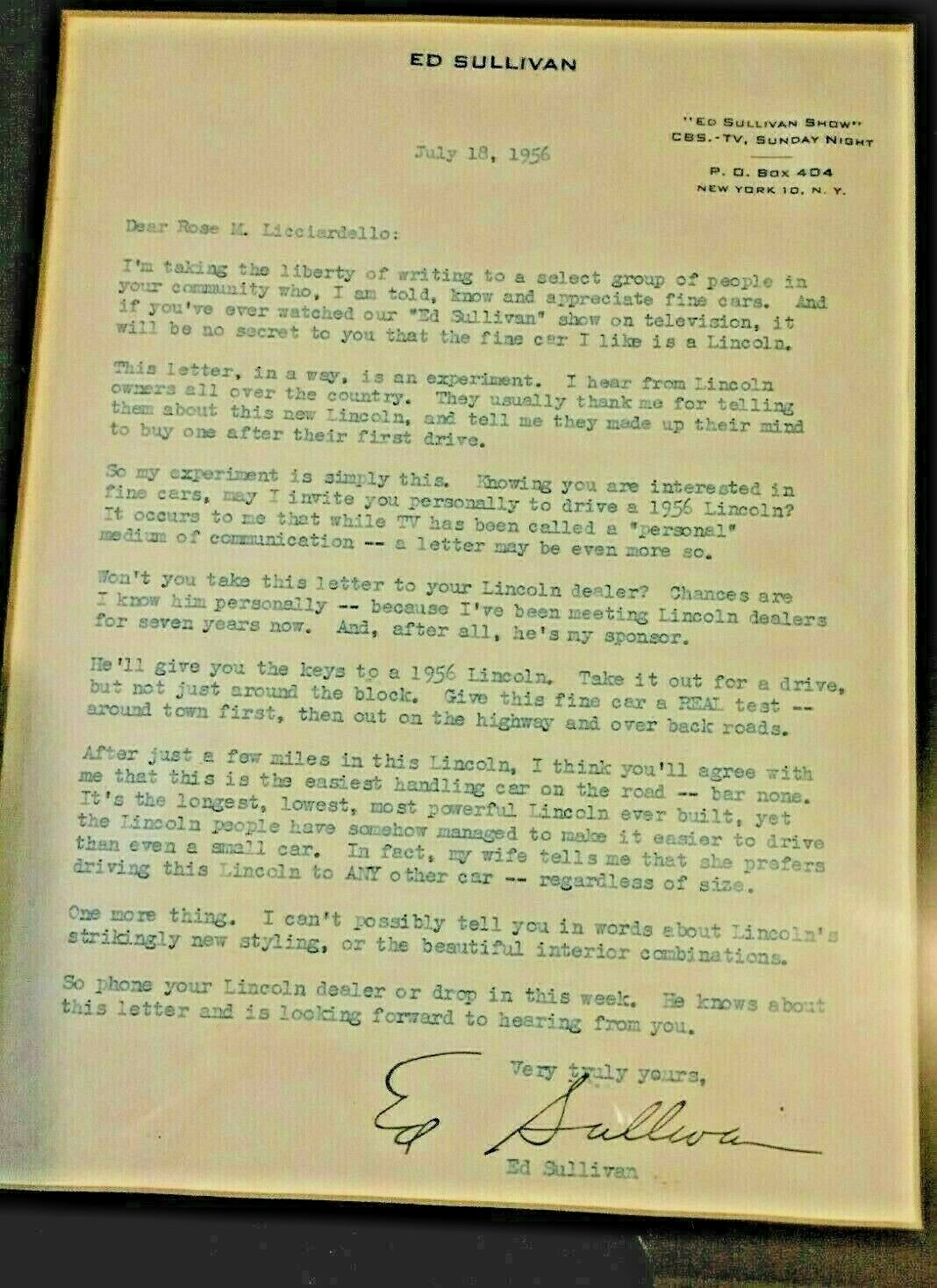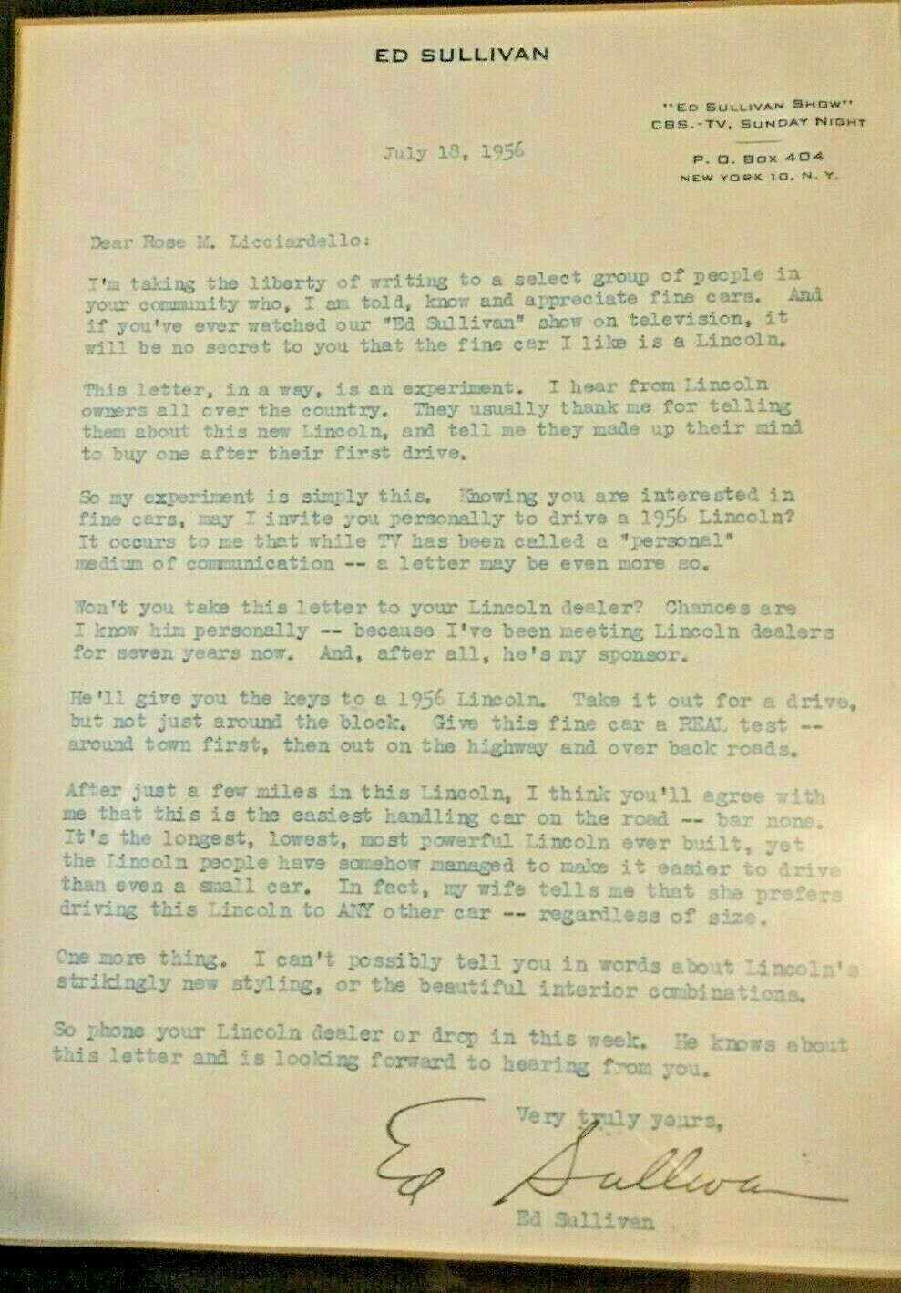 Rare Ed Sullivan Signed Press Release Photo. This is permission to used and Dated. One of a kind. Glossy Photo is in very Good condition with a hard to see small crease. To add, a signed letter promoting the New 1956 Lincoln Dealerships in the New York City Neighborhoods. These two pieces are framed Glass front and rear opened to view. 20"High x 23" Wide. Great piece to hang in Dealership or Home. Thanks and hope to do business with you!
