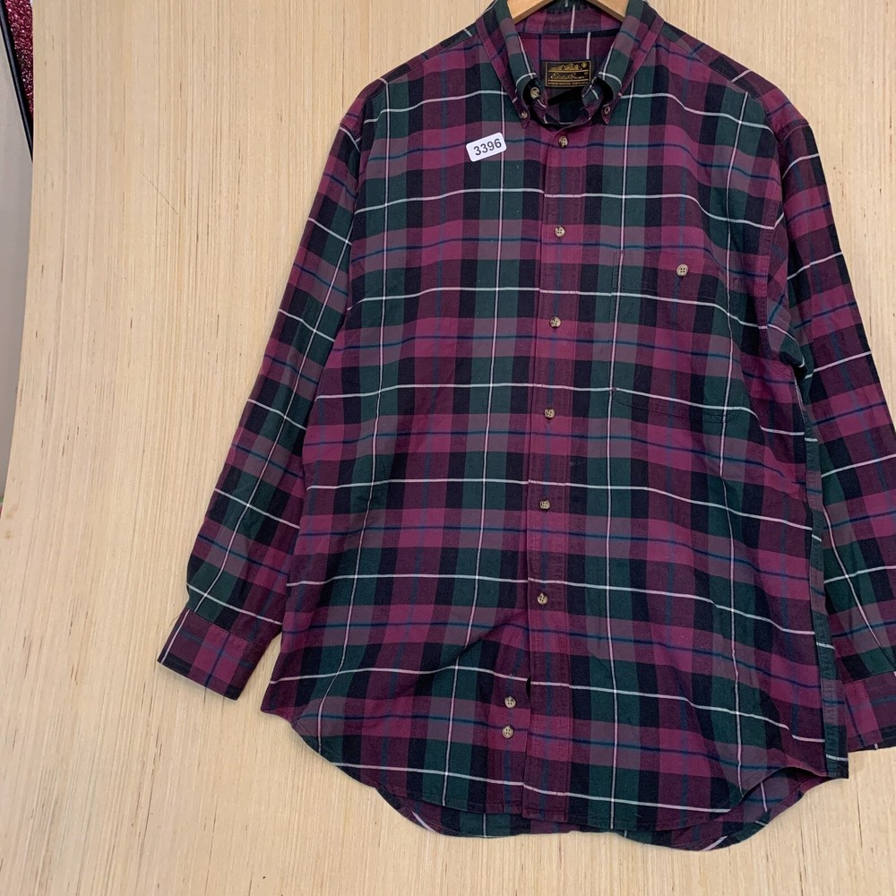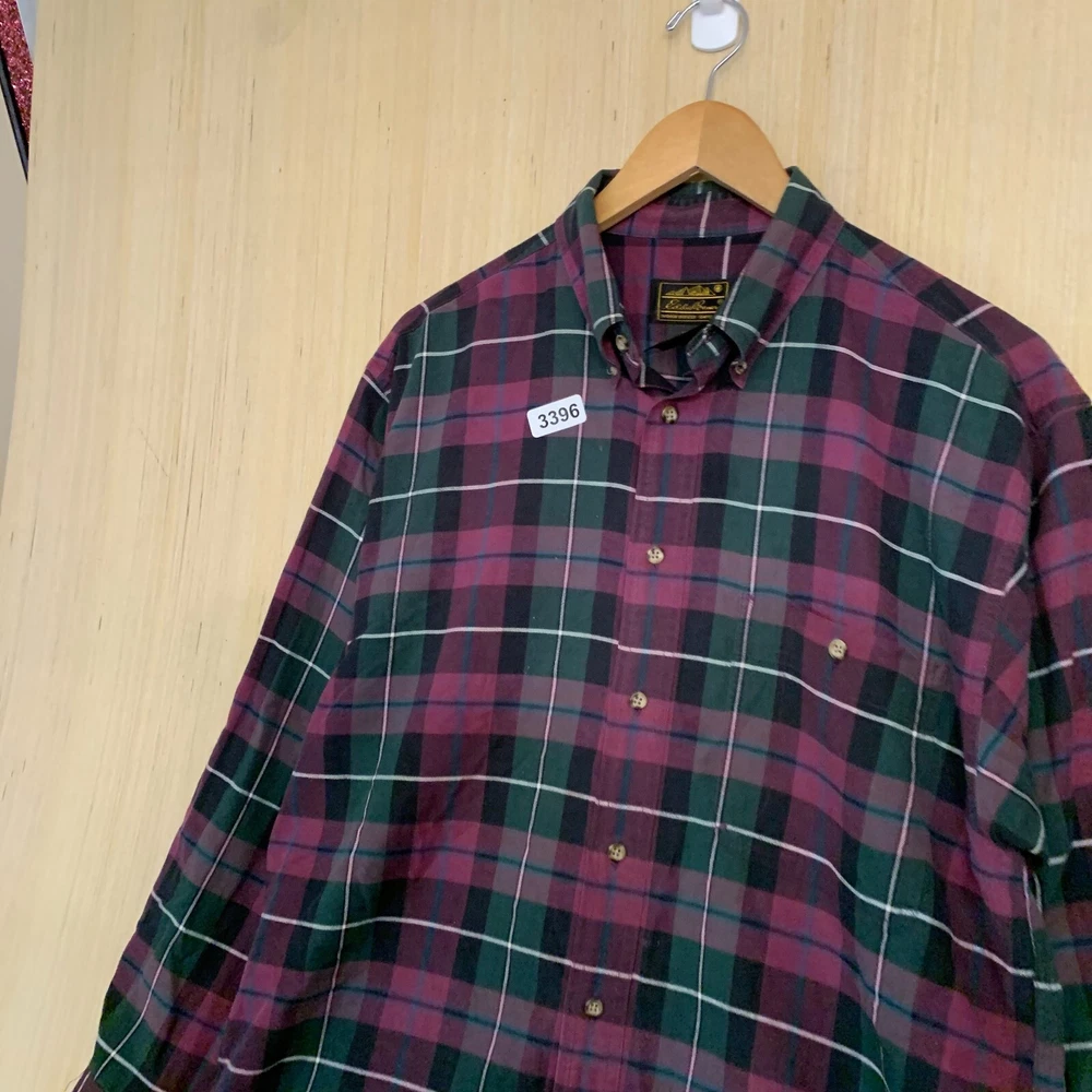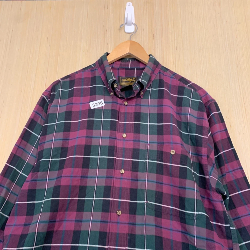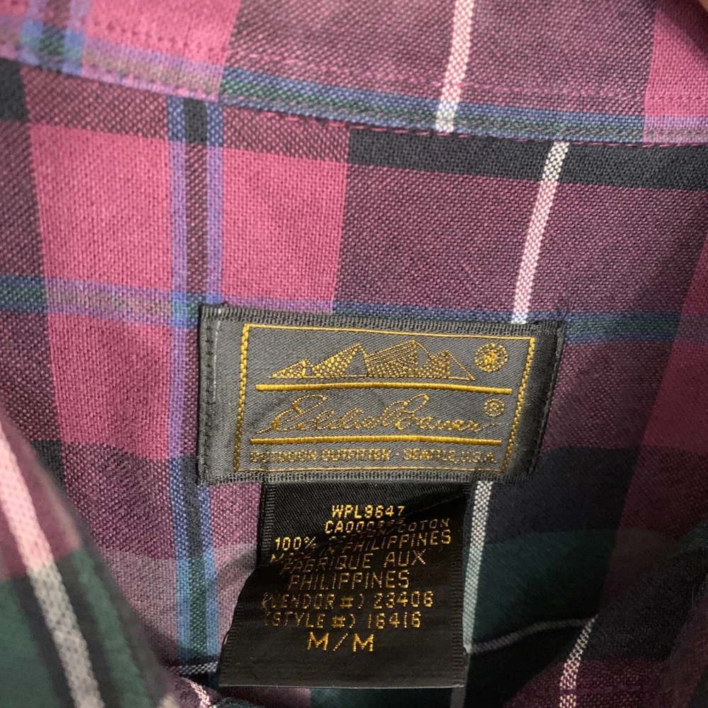 This vintage Eddie Bauer button-up shirt is a colorful addition to any wardrobe. The shirt features a solid pattern, long sleeves, and a crew neck with a button-down collar style. It is made of comfortable flannel fabric and has easy-care features, making it suitable for all seasons. The shirt also has pockets, making it a practical choice for travel, workwear, or casual occasions. The shirt is a size medium and has a regular fit, suitable for men. It has a button-up closure and accents, giving it a formal and business-ready look. The shirt is perfect for a wedding or party/cocktail event, adding a touch of personality to your outfit. This shirt is a must-have for anyone looking for a unique and comfortable addition to their wardrobe.