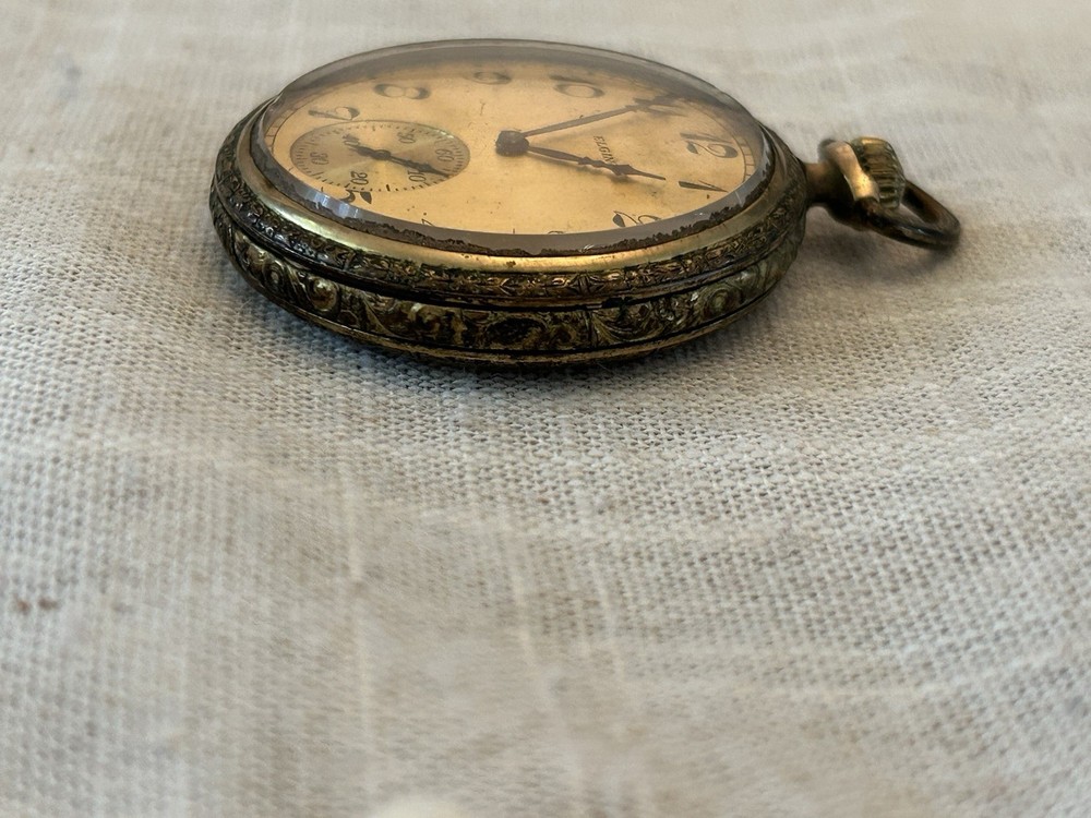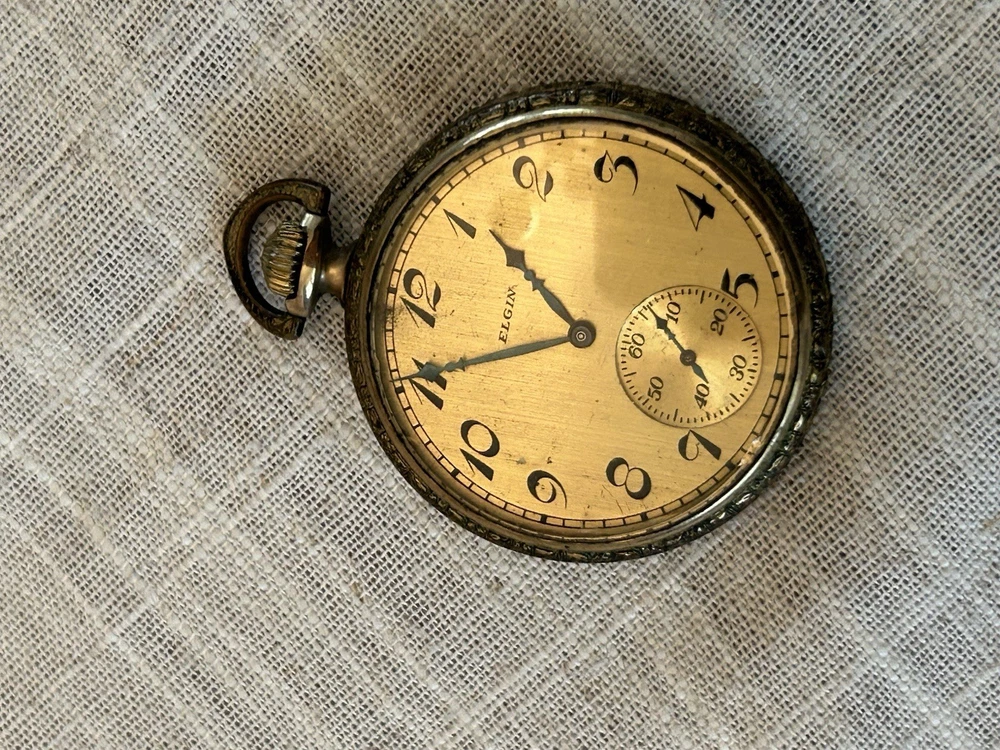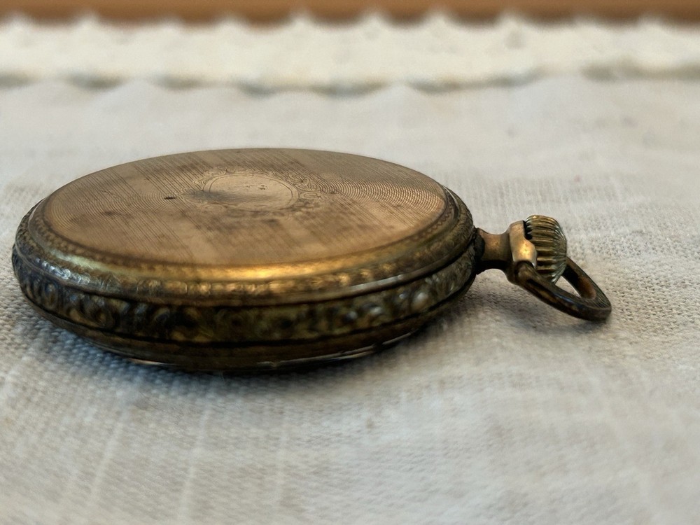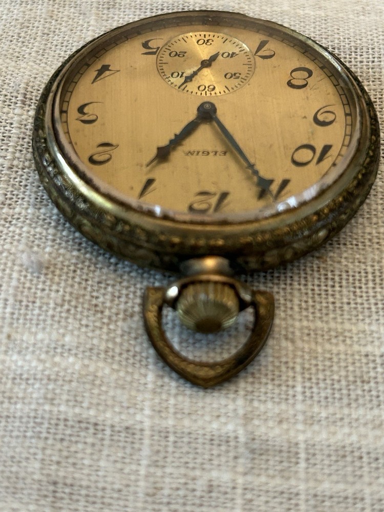 Elgin pocket watch I am unsure of the actual material. Gold, gold filled, bronze The back did not come off for me so I was unable to take a picture Arrives as is
