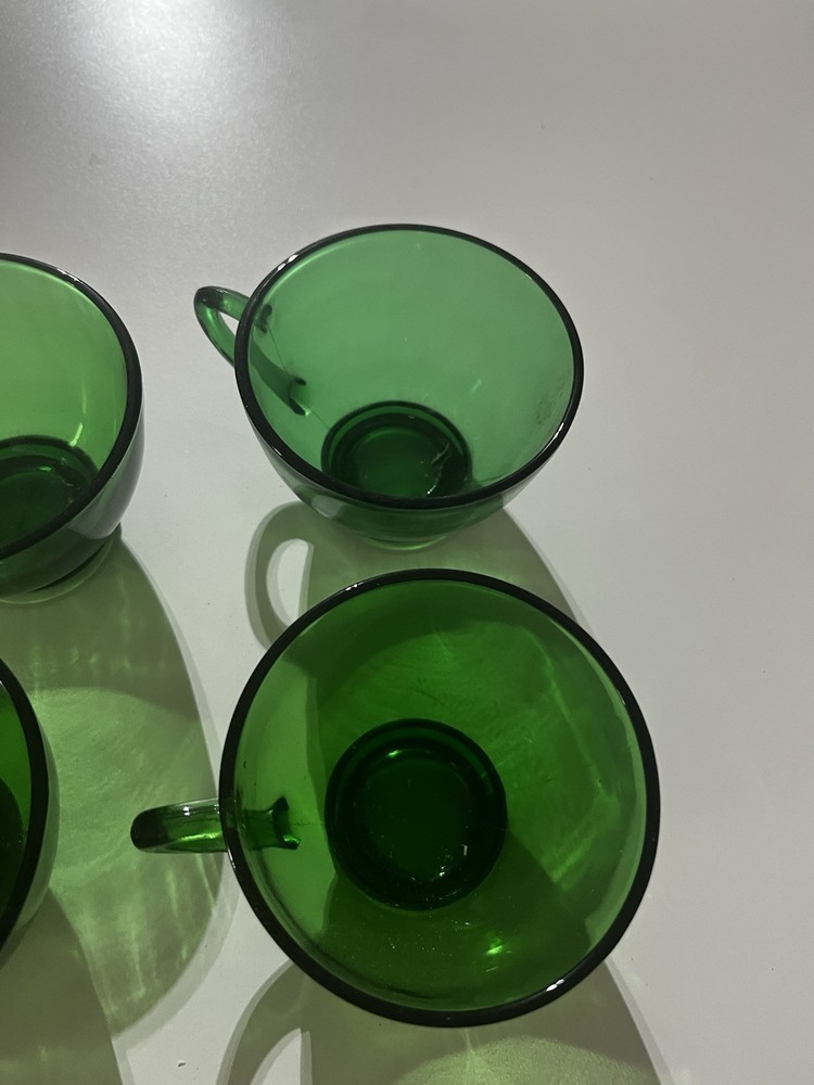 The product is a set of 4 vintage party mugs in an Emerald Green color. These glass punch cups are designed as drinking mugs and are perfect for serving beverages at parties or gatherings. Made of glass, each mug has a classic design that adds a touch of elegance to any occasion.