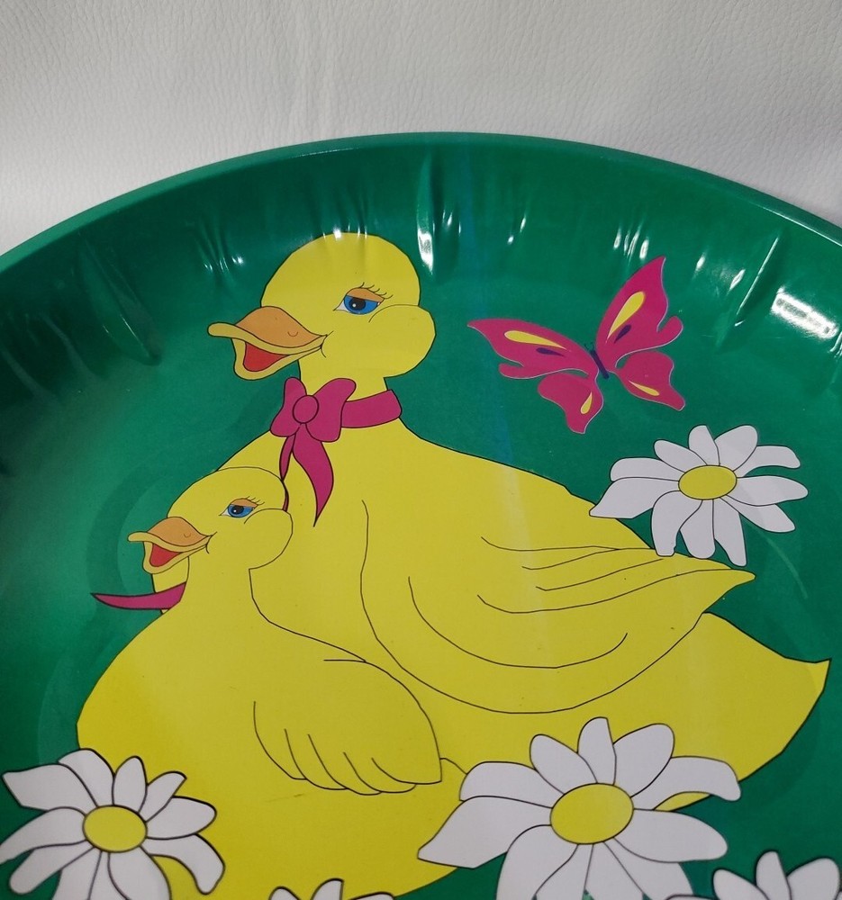 This vintage Enesco metal tray is a charming addition to any Easter collection. The tray features adorable ducks, a butterfly, and flowers in a cheerful green color. It was manufactured in China during the 1990s and is in excellent used condition (EUC). Perfect for displaying or serving Easter treats, this tray is made of durable metal and has a size of 10 inches. It is sure to delight collectors and fans of Easter-themed decor alike. Add this Enesco tray to your collection today!