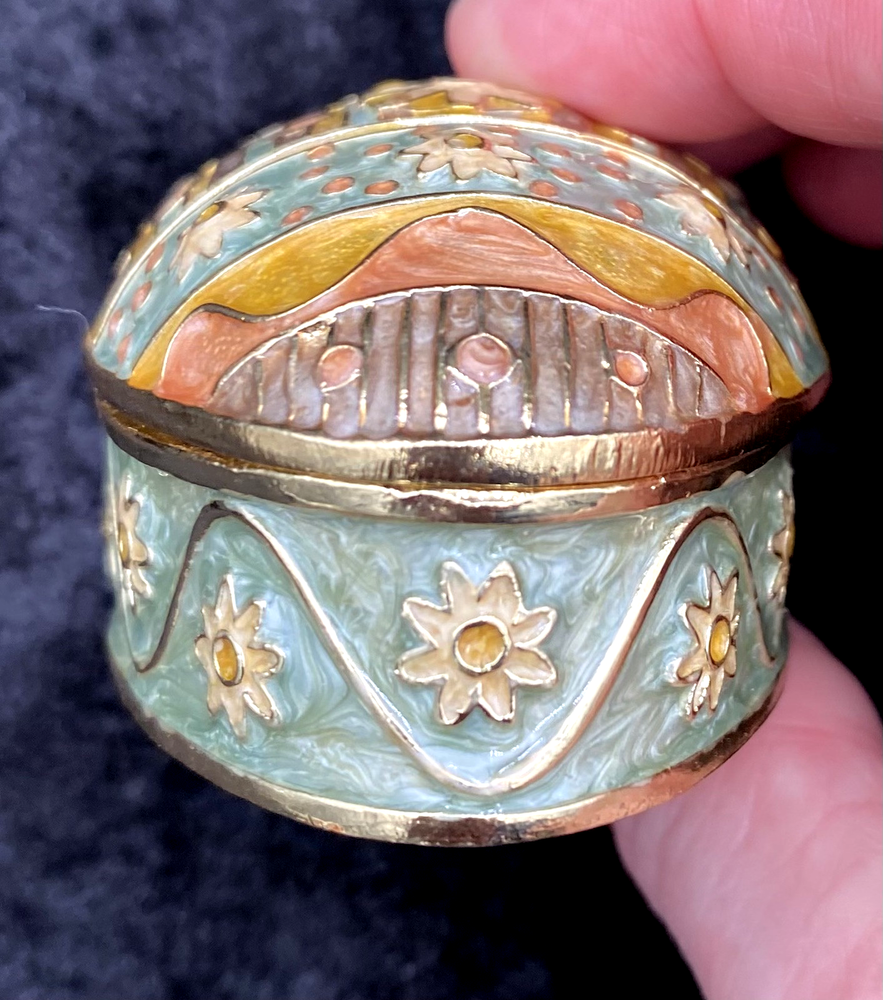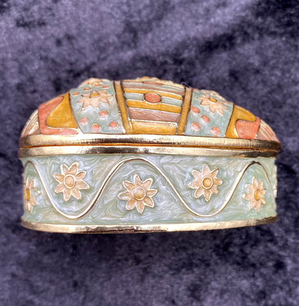 Discover a touch of elegance with this vintage gold enameled egg trinket box, reminiscent of the Fabergé style. Adorned with a delicate floral pattern, this small yet heavy keepsake box is a testament to craftsmanship, featuring a lustrous finish and a luxurious gold trim that exudes sophistication. The multicolored enamel details provide a captivating contrast, making it a versatile piece that complements any decor. Convenience and security are ensured with a double magnetic closure, keeping your treasures safely tucked away. Measuring 3 inches in length, 1.5 inches in height, and 2.2 inches in width, this trinket box is perfect for all occasions. The trinket box is in excellent used condition. There are no chips or cracks and very minimal wear (on the inner rim of the lid).
