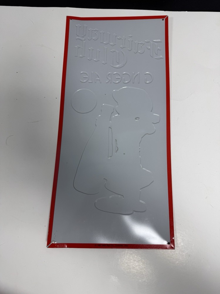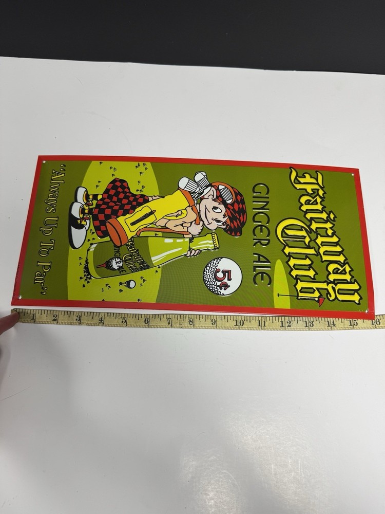 Elevate your collection with the Fairway Club Ginger Ale “Always Up To Par” Tin Metal Sign, a charming piece of breweriana that captures the essence of a bygone era. Crafted for durability, this sign boasts vibrant artwork that pays homage to the classic ginger ale brand, making it an ideal addition for enthusiasts and collectors alike. Whether displayed in your home bar, garage, or as part of a larger collection, this tin sign is sure to spark conversations and admiration. Its theme of breweriana is tastefully represented in the design, offering a nostalgic nod to the iconic Fairway Club Ginger Ale. Add a touch of vintage flair to your space with this distinctive and eye-catching piece. Please see photos for condition details.