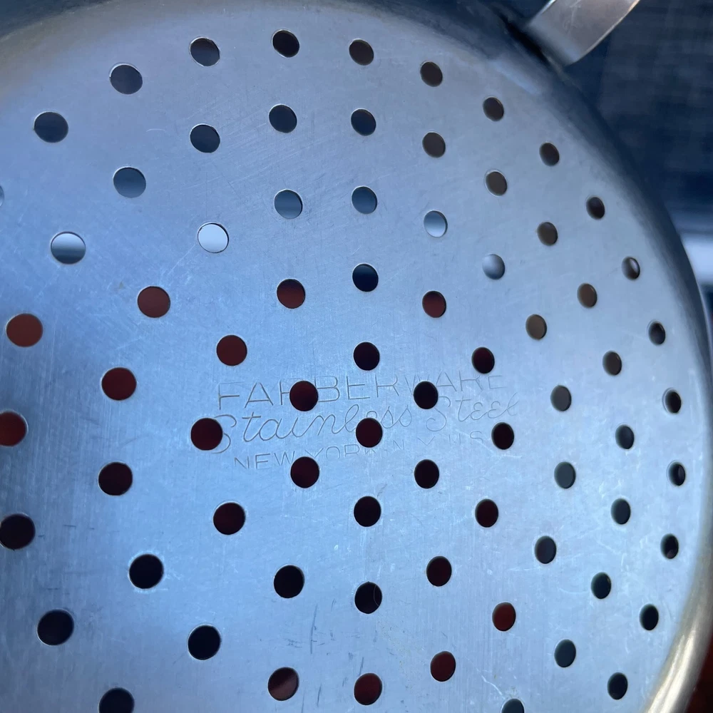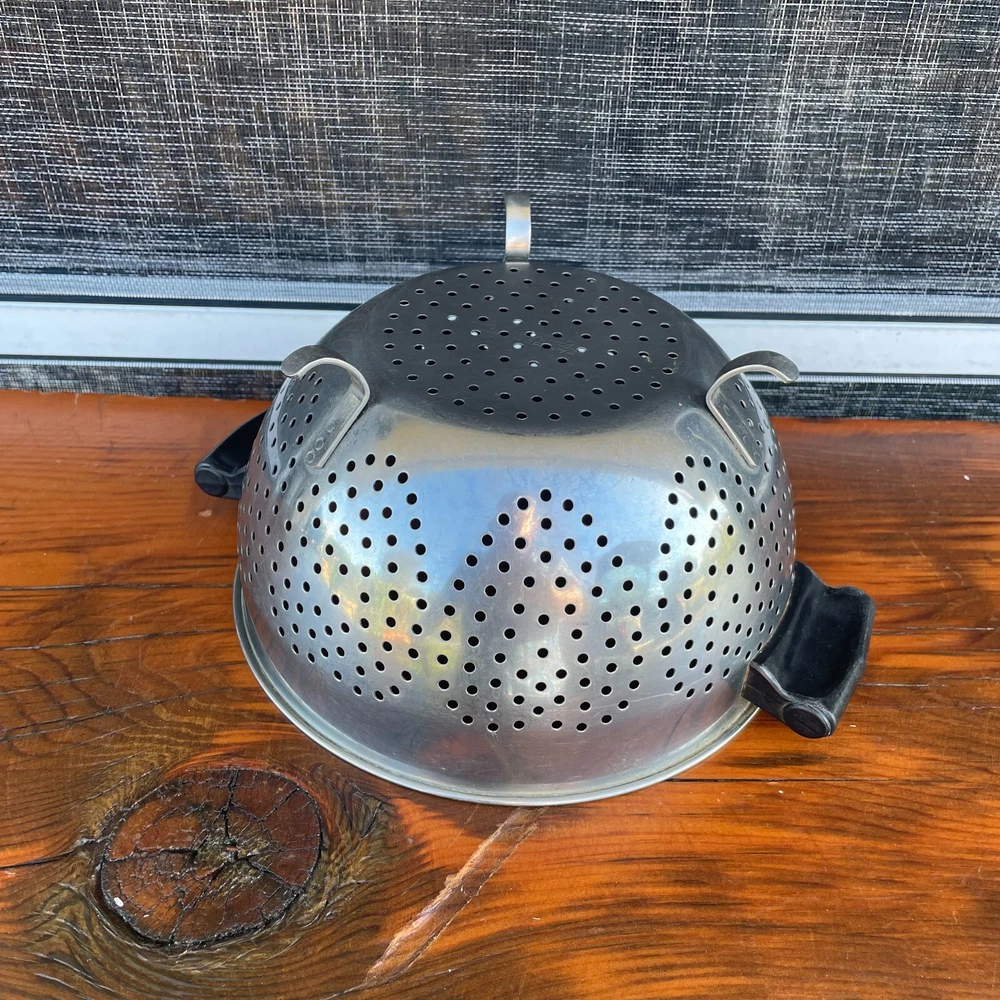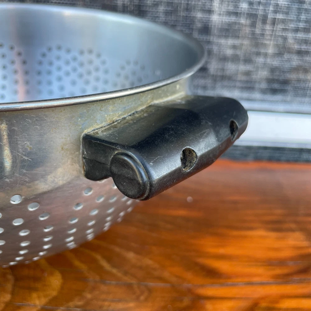 Vintage: Farberware Stainless Steel Colander Strainer Black Handles Footed 8"W x 5”D Heart shaped holes in the sides. Made in USA Closet shelf #2 for inventory