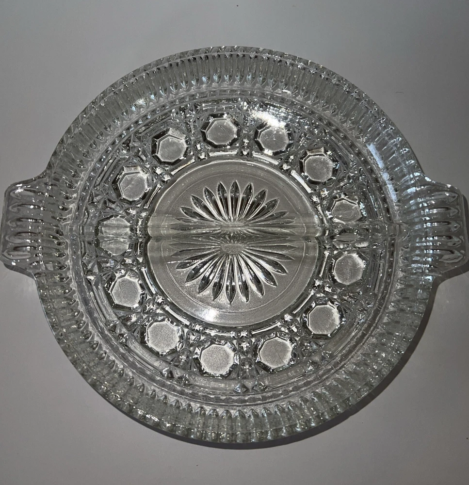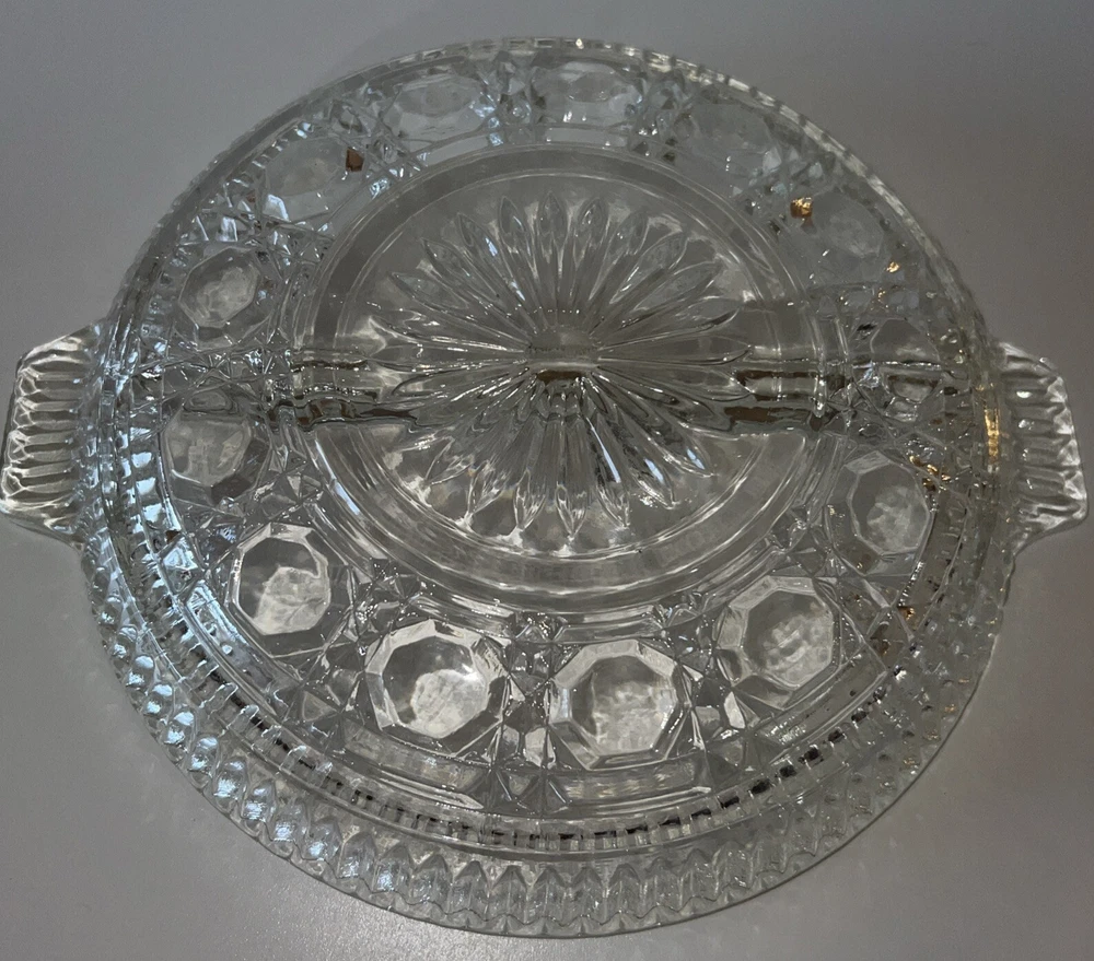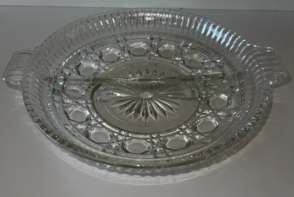 The vintage Federal Indiana Glass Windsor-Button and Cane-Divided Relish plate was manufactured in the United States in 1940. This clear glass relish plate features the Windsor pattern and is a part of the Windsor product line. The design showcases button and cane motifs, reflecting the elegant style of the 1940s. Ideal for serving relish or other condiments, this piece adds a touch of nostalgia and sophistication to any table setting.