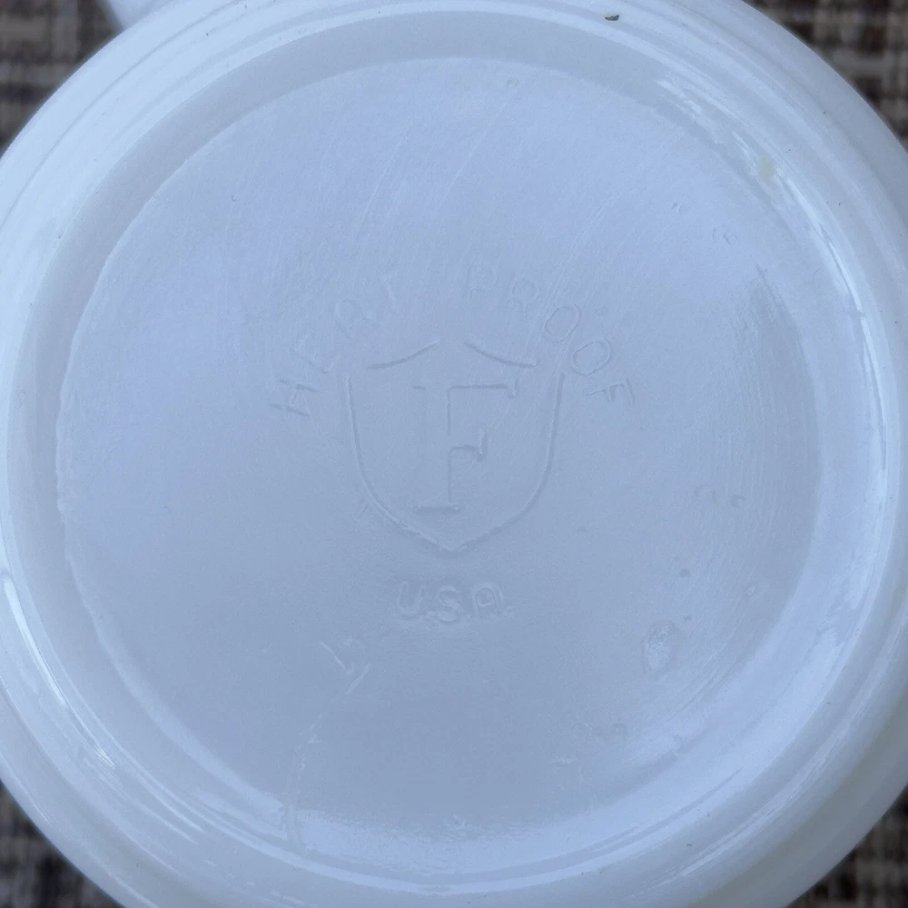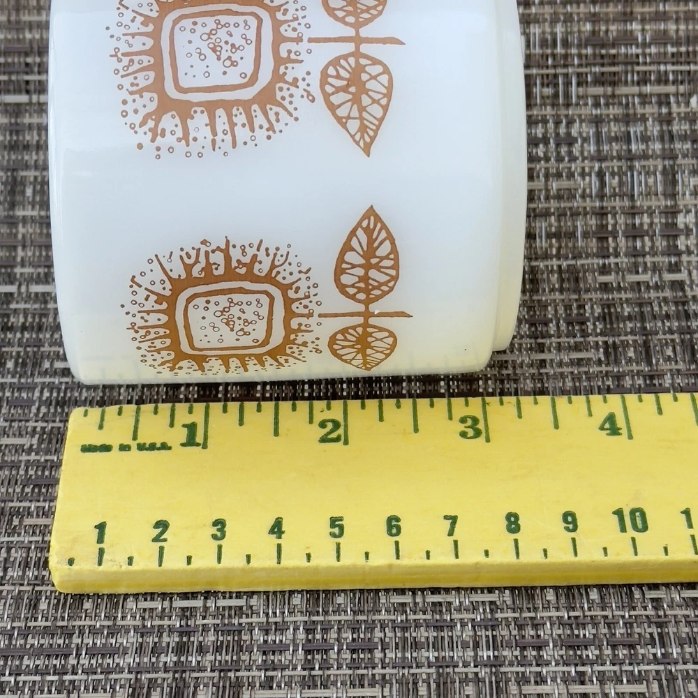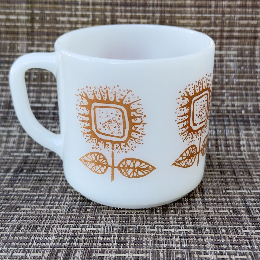 This vintage milk glass coffee mug from the Federal Glass Company features a beautiful sunflower design in golden brown. The mug stands at 3 1/8" tall and is perfect for enjoying both hot and cold beverages. **One small flaw shown in picture.