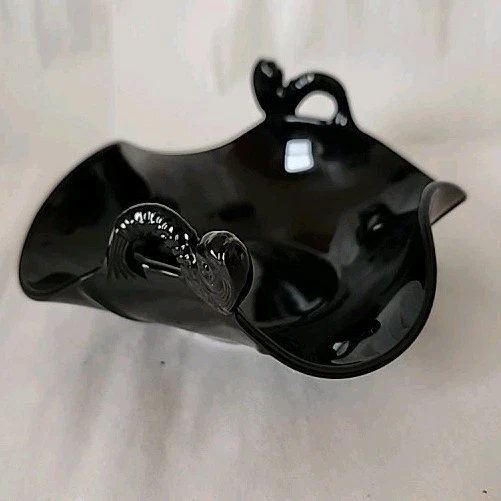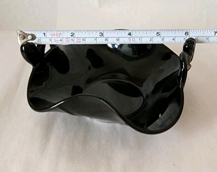 This vintage Fenton trinket dish is a stunning piece of black amethyst glass with a glossy finish. The dish has a square shape with a waved edge and double handles, making it perfect for use as a candy dish or for holding small items such as jewelry. Measuring 2.5 inches in height and 6 inches in width, this dish is compact yet versatile. Crafted with care and precision, this Fenton dish features a production style of amethyst glass and is made of high-quality glass material. Its vintage charm is undeniable, making it a unique addition to any collection or home decor. This dish is perfect for those who appreciate the beauty and craftsmanship of vintage glassware.