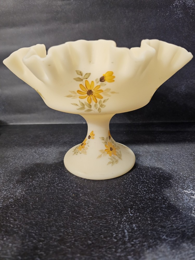 no chips or cracks Experience the charm of vintage art glass with this exquisite Fenton compote. Crafted from high-quality satin glass, it features a delightful almond shape and a ruffled edge that adds a touch of elegance to any display. Hand-painted with intricate daisy motifs in a warm yellow hue, this piece is a testament to the timeless craftsmanship of Fenton glassware. Originating from the United States and dating back to the post-1940 era, this compote is an original piece that exudes a sense of history and heritage. Its beige coloration is both versatile and striking, making it a perfect addition to any collection or as a standalone decorative item. Whether you're a seasoned collector or simply appreciate the beauty of historic glassware, this Fenton compote is sure to captivate and inspire.