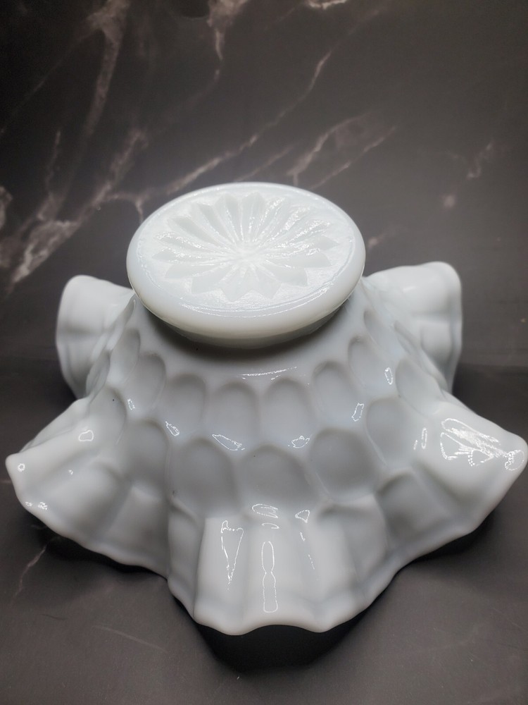 This vintage Fenton white milk glass bowl is a charming piece of elegant glassware from 1957. Handmade in North America, this round bowl features a ruffled thumbprint pattern that adds a decorative touch to any occasion. With a glossy finish and a diameter of 6 inches, this Art Deco style bowl is perfect for serving nuts, candies, or other small treats. A timeless piece from the mid-20th century, this Fenton Colonial bowl is a lovely addition to any glassware collection. Small mark on base as shown.